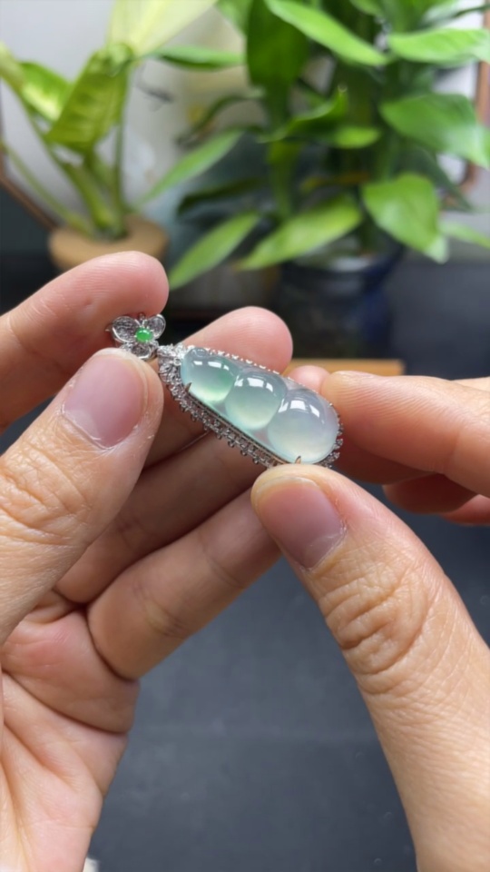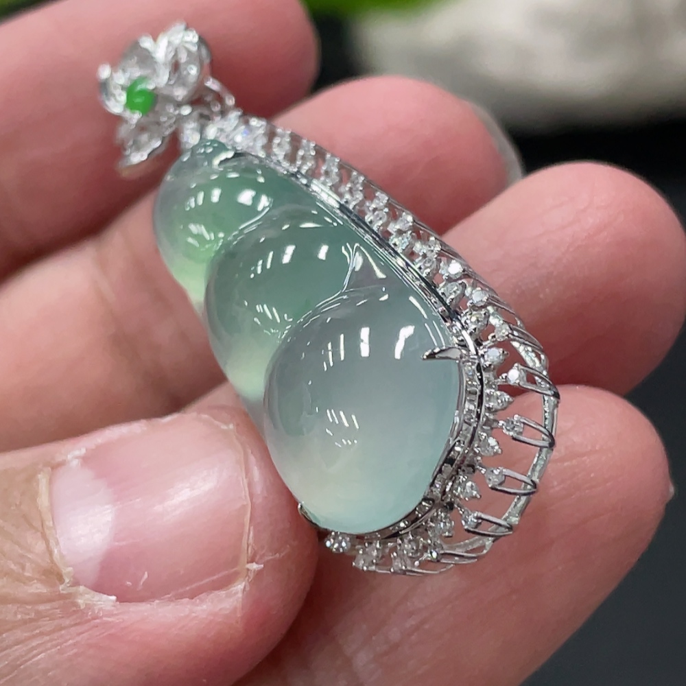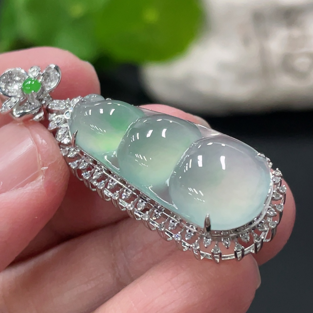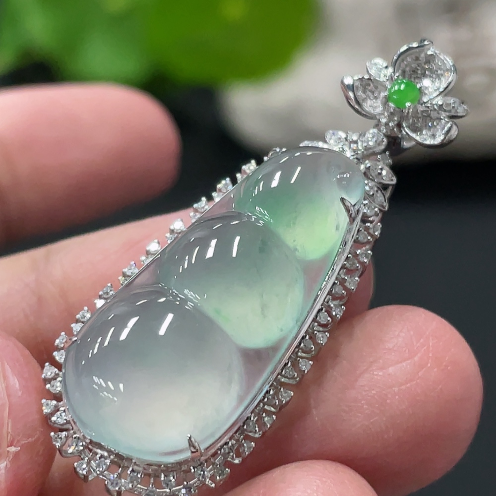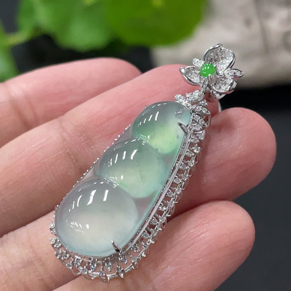 Jadeite Lucky Bean Pendant with 18K Gold and Diamond Accents, Total Weight Approx. 5.48g