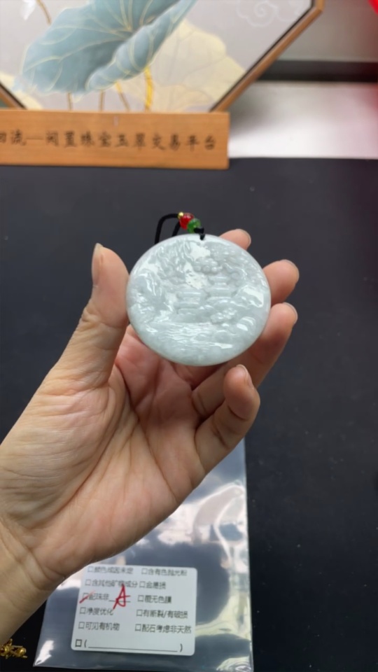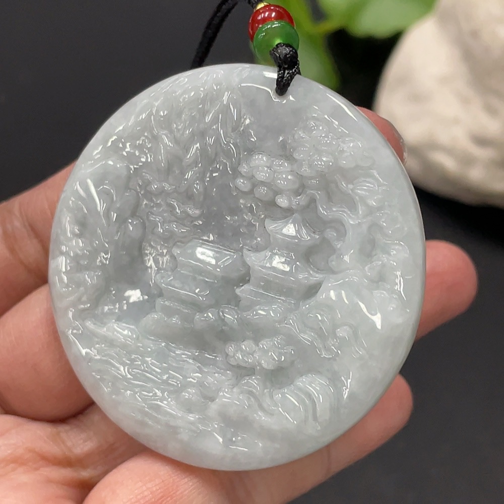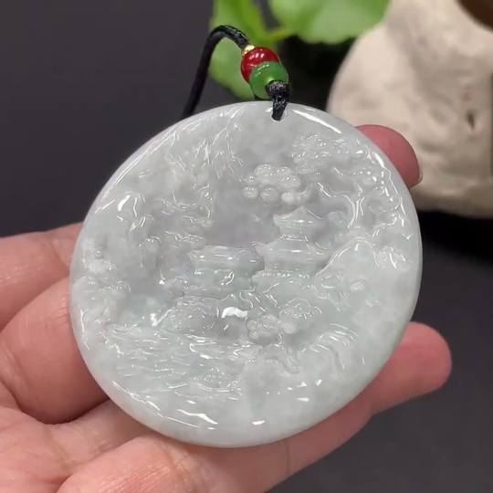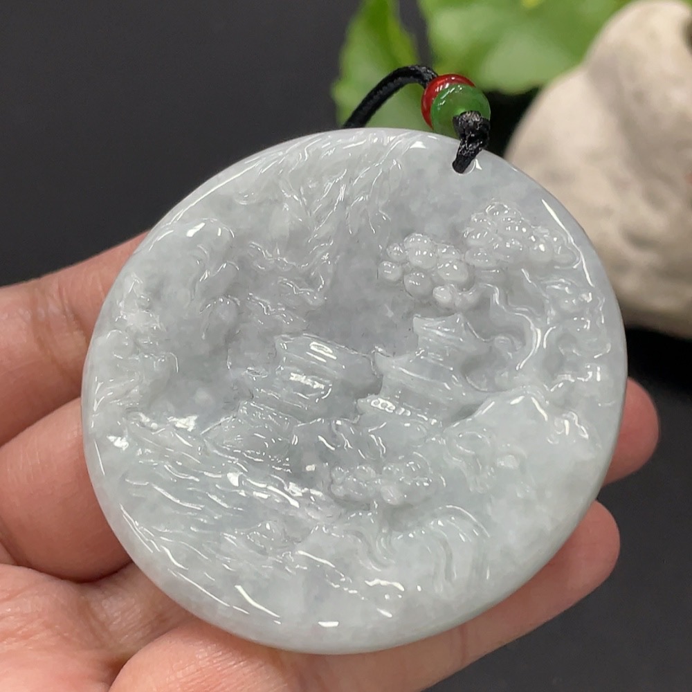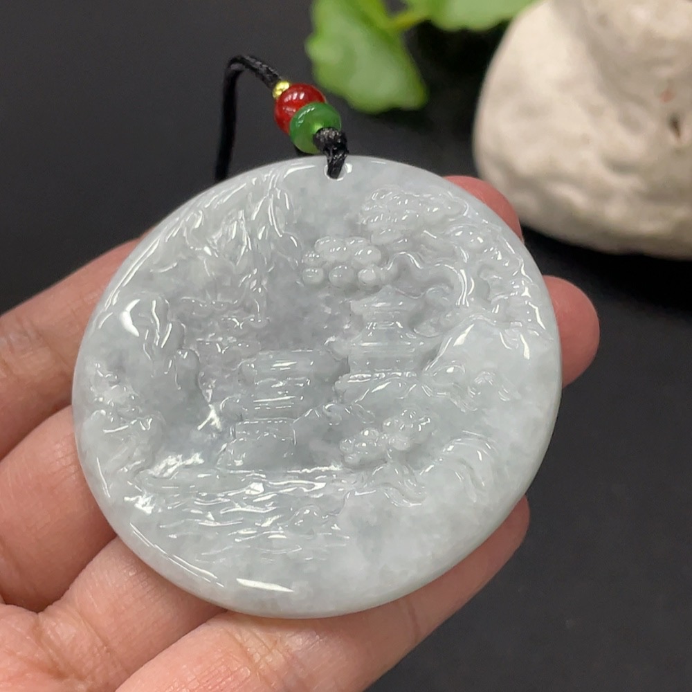 Jadeite Pendant Landscape Plaque Total Weight Approx. 32.83g Including Cord With Non-Grade A Beads