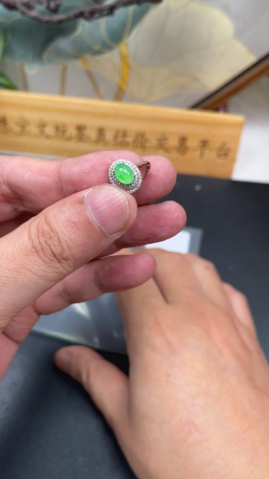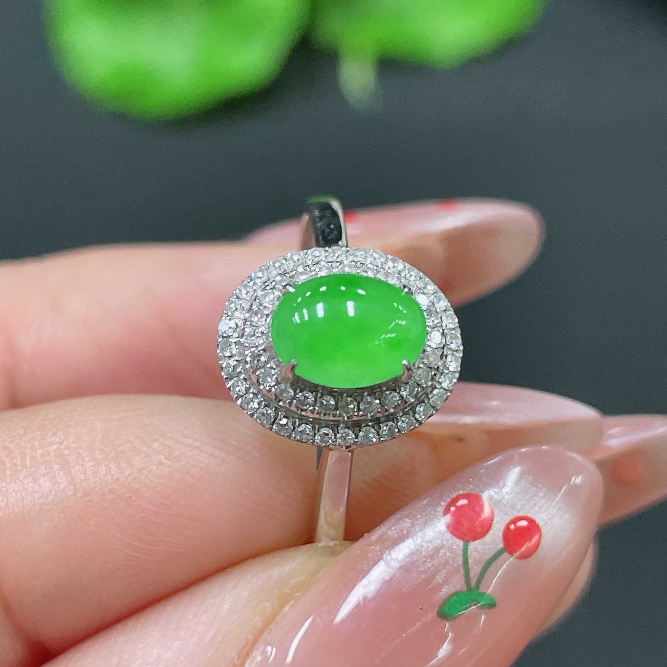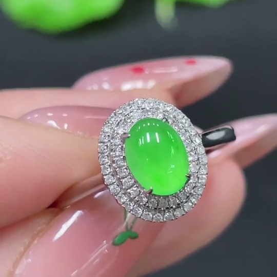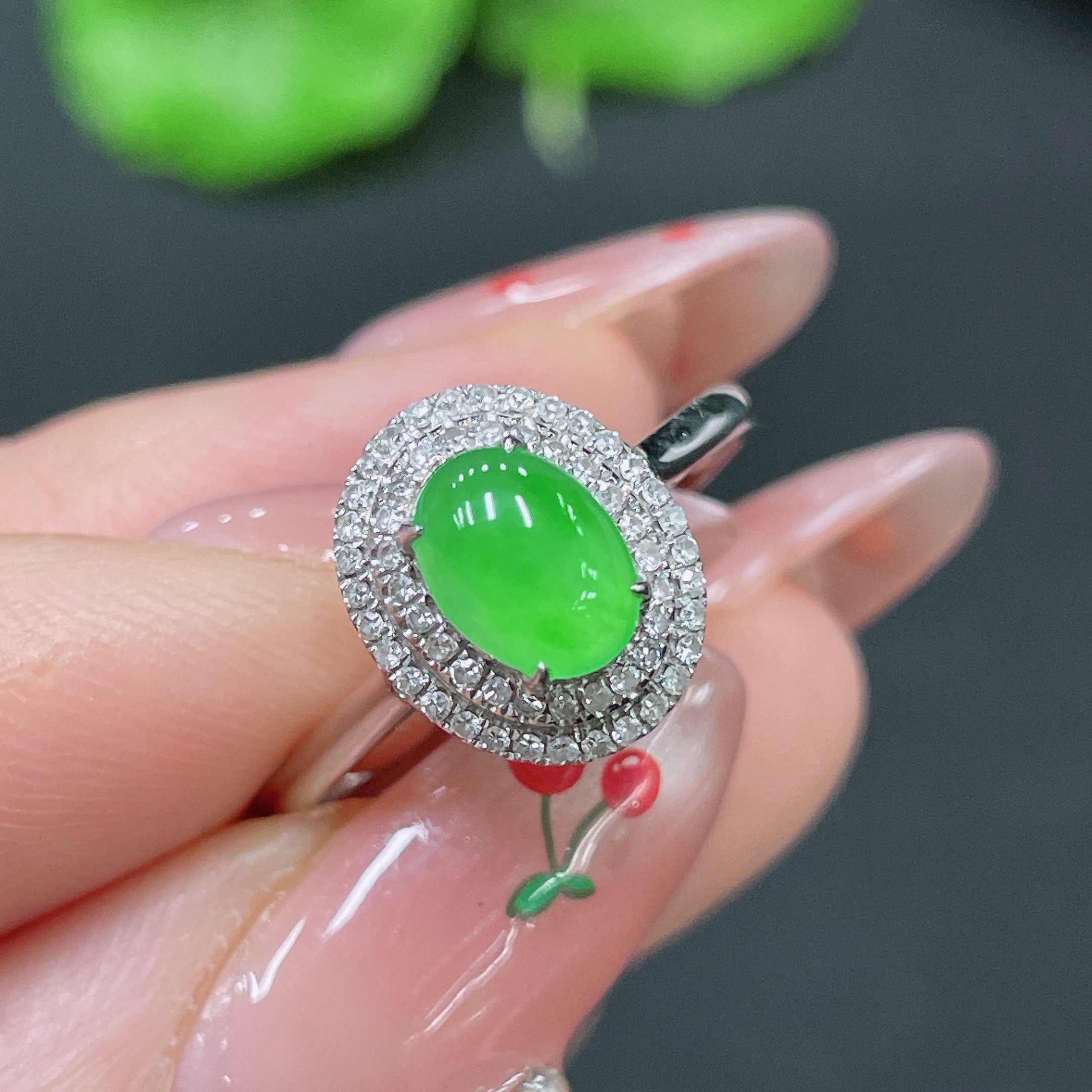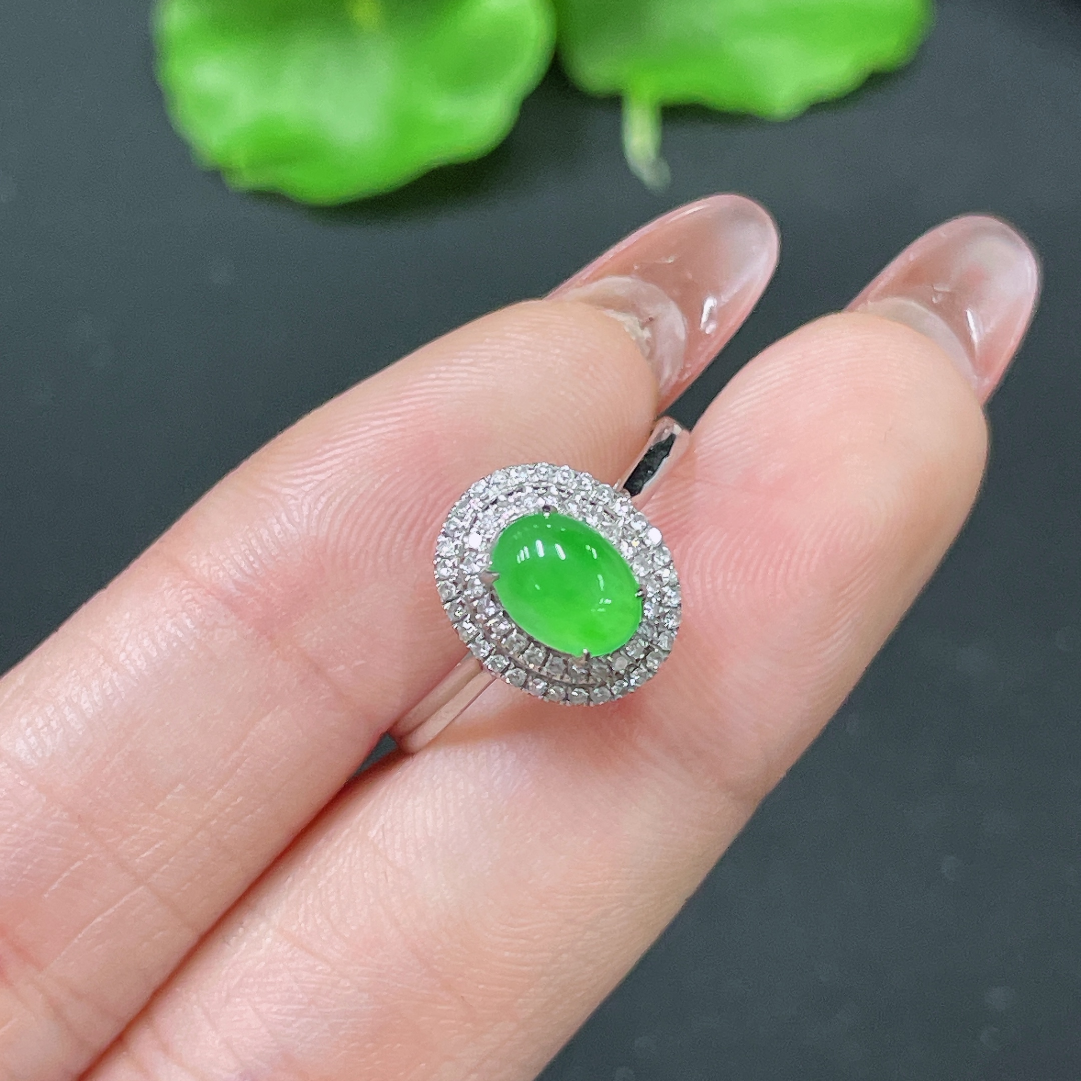 Jadeite ring with 46% gold content, 18k setting, total weight approximately 1.9g, set with diamonds, size 17