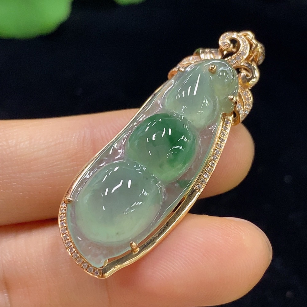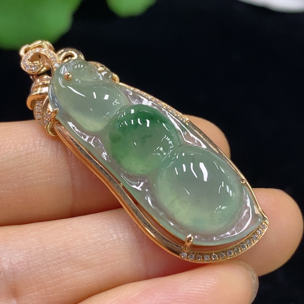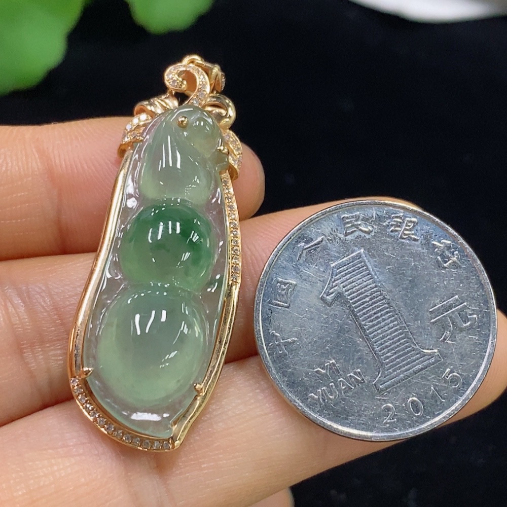 Jadeite Auspicious Bean Pendant with 18k Gold and Diamond Accents, Total Weight Approx. 6.32g