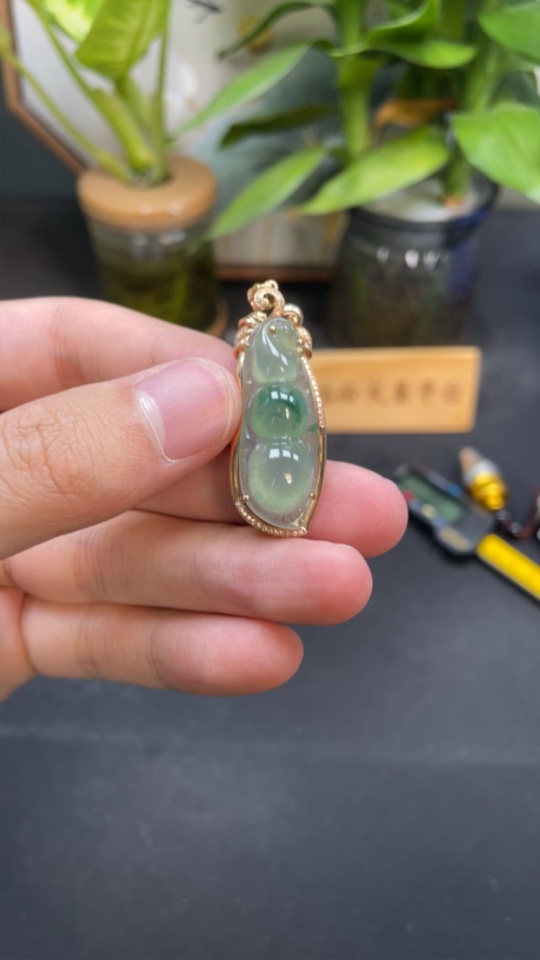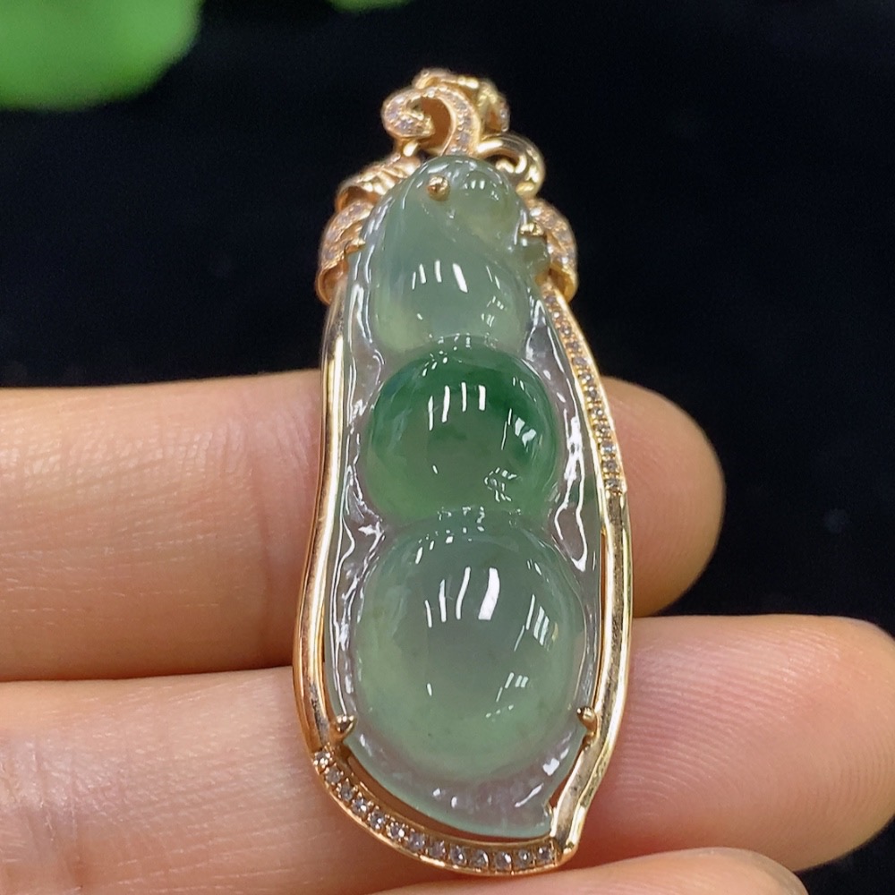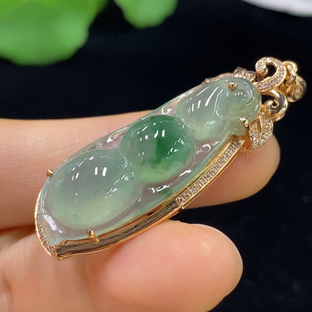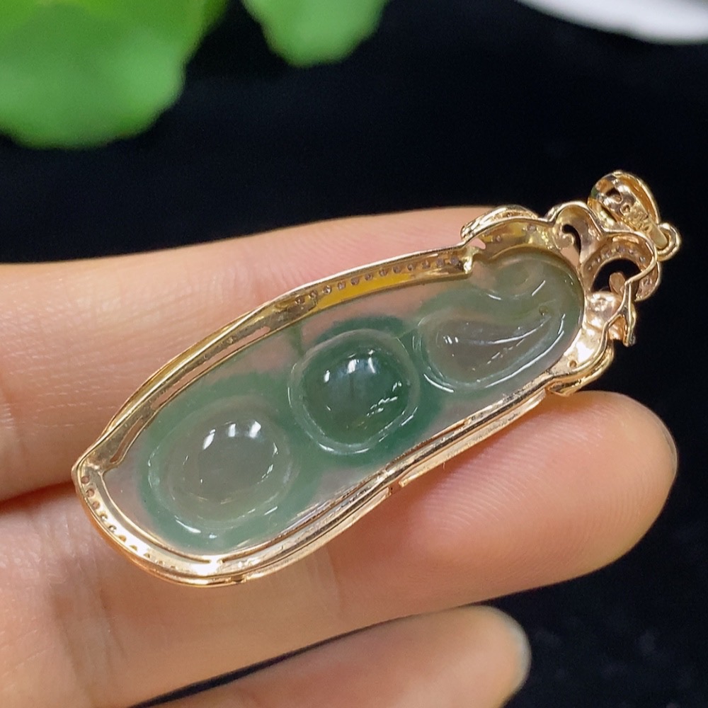 Jadeite Auspicious Bean Pendant with 18k Gold and Diamond Accents, Total Weight Approx. 6.32g
