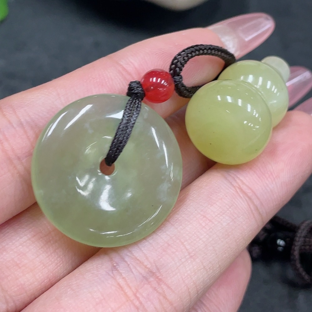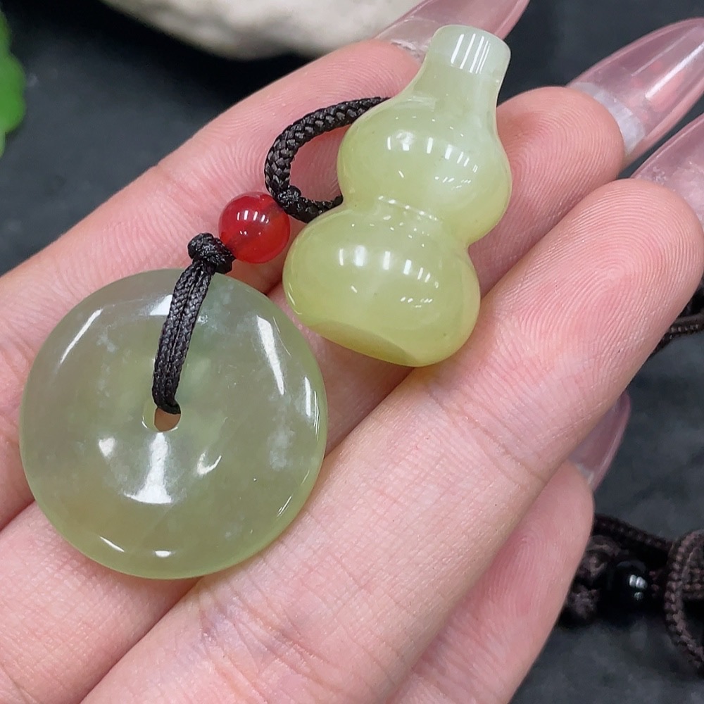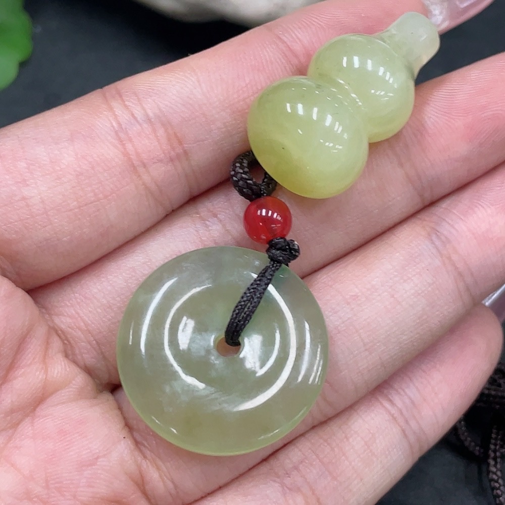 Xiuyu (Serpentine Jade) Pendant - Peace Buckle + Gourd