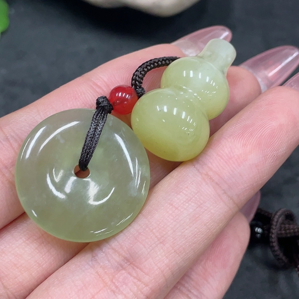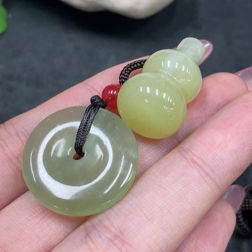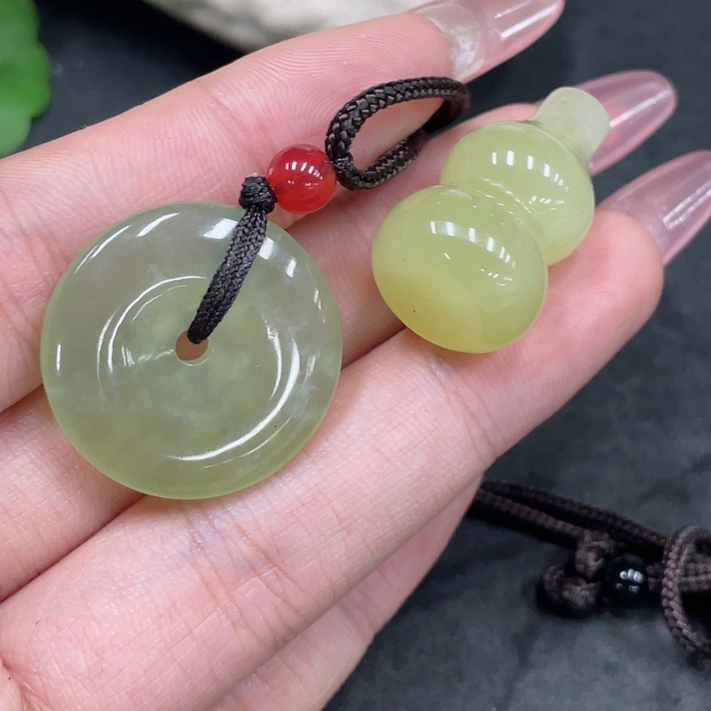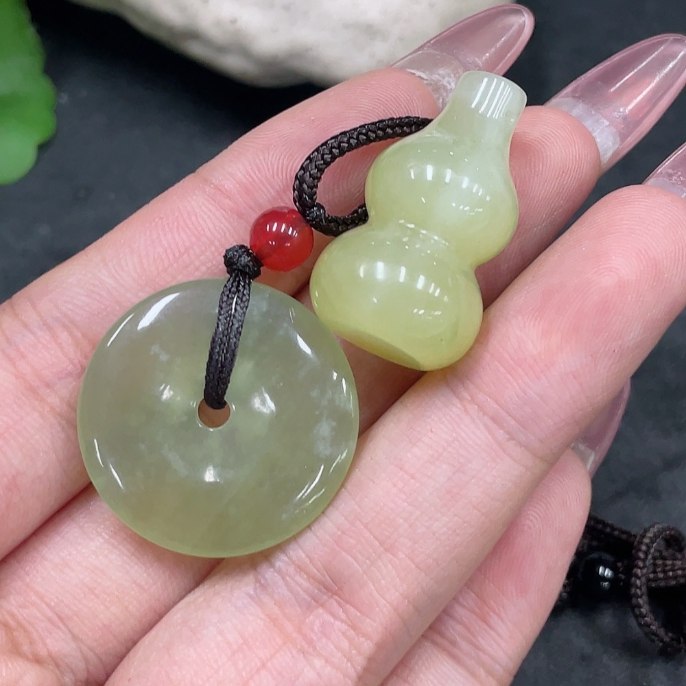 Xiuyu (Serpentine Jade) Pendant - Peace Buckle + Gourd