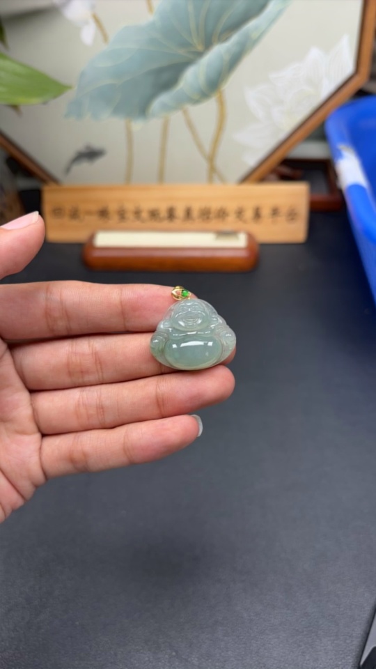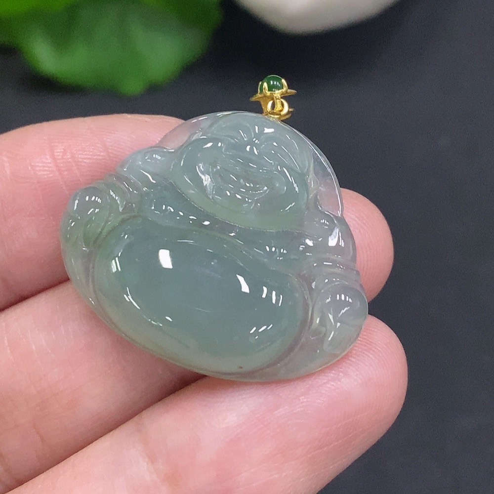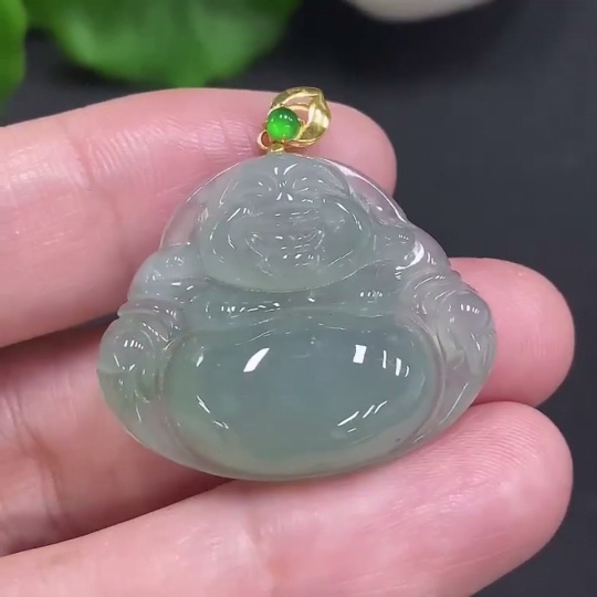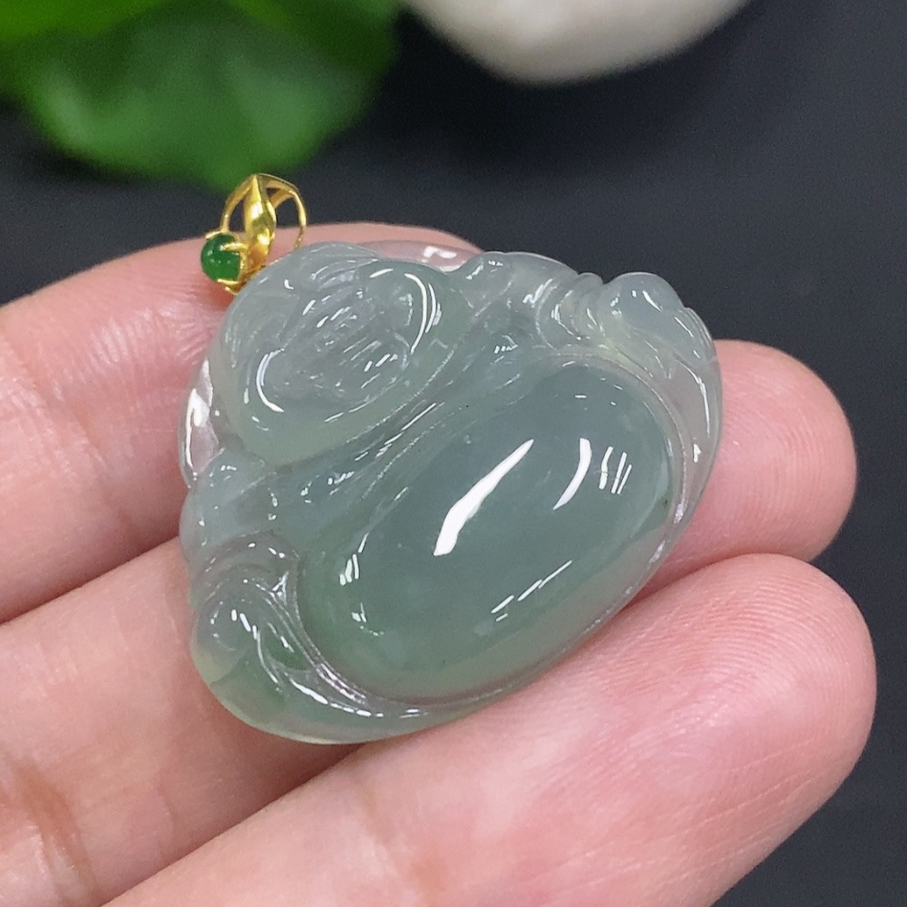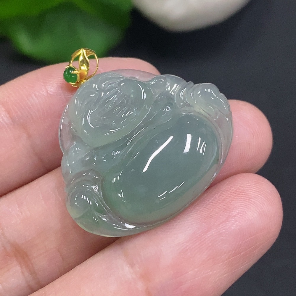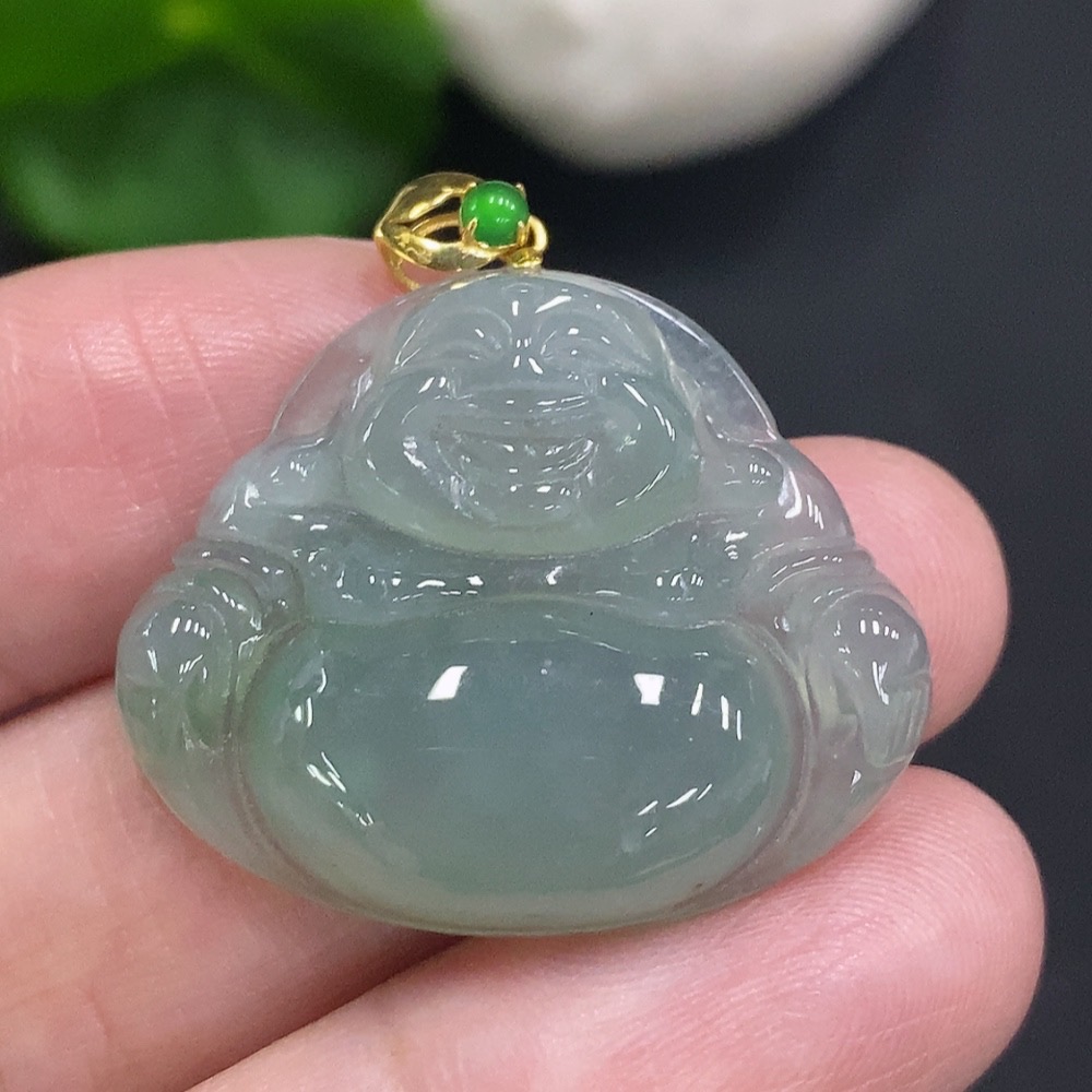 Jadeite Buddha Pendant with 18K Gold Clasp, Total Weight Approximately 6 Grams