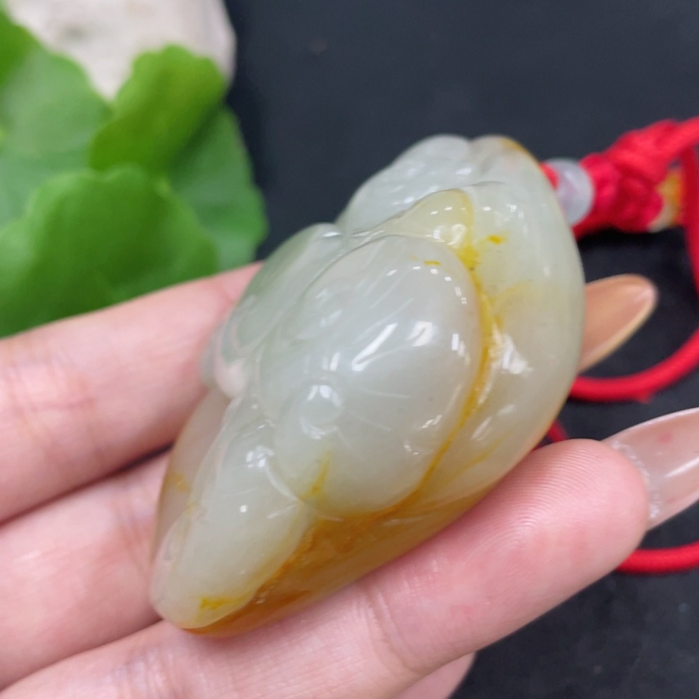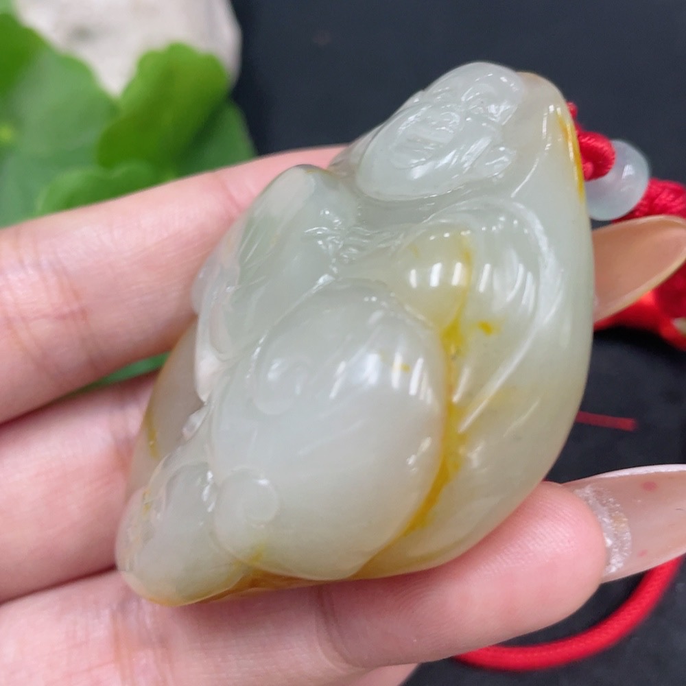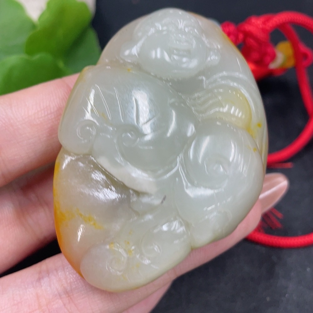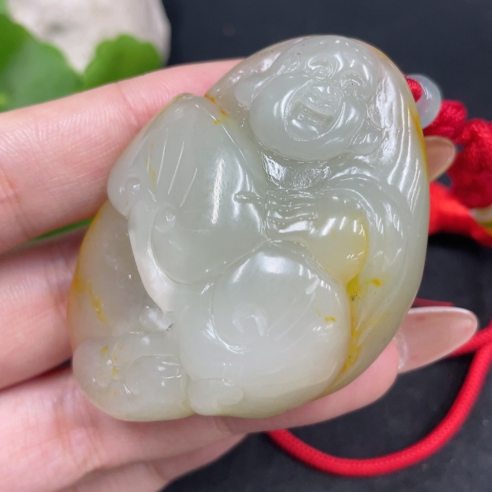 Hetian Jade Pendant Buddha with Other Mineral Components, Undetermined Skin Color Origin, Total Weight (Including String) Approximately 75.1g
