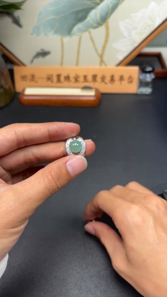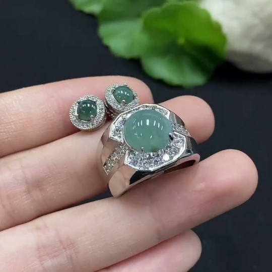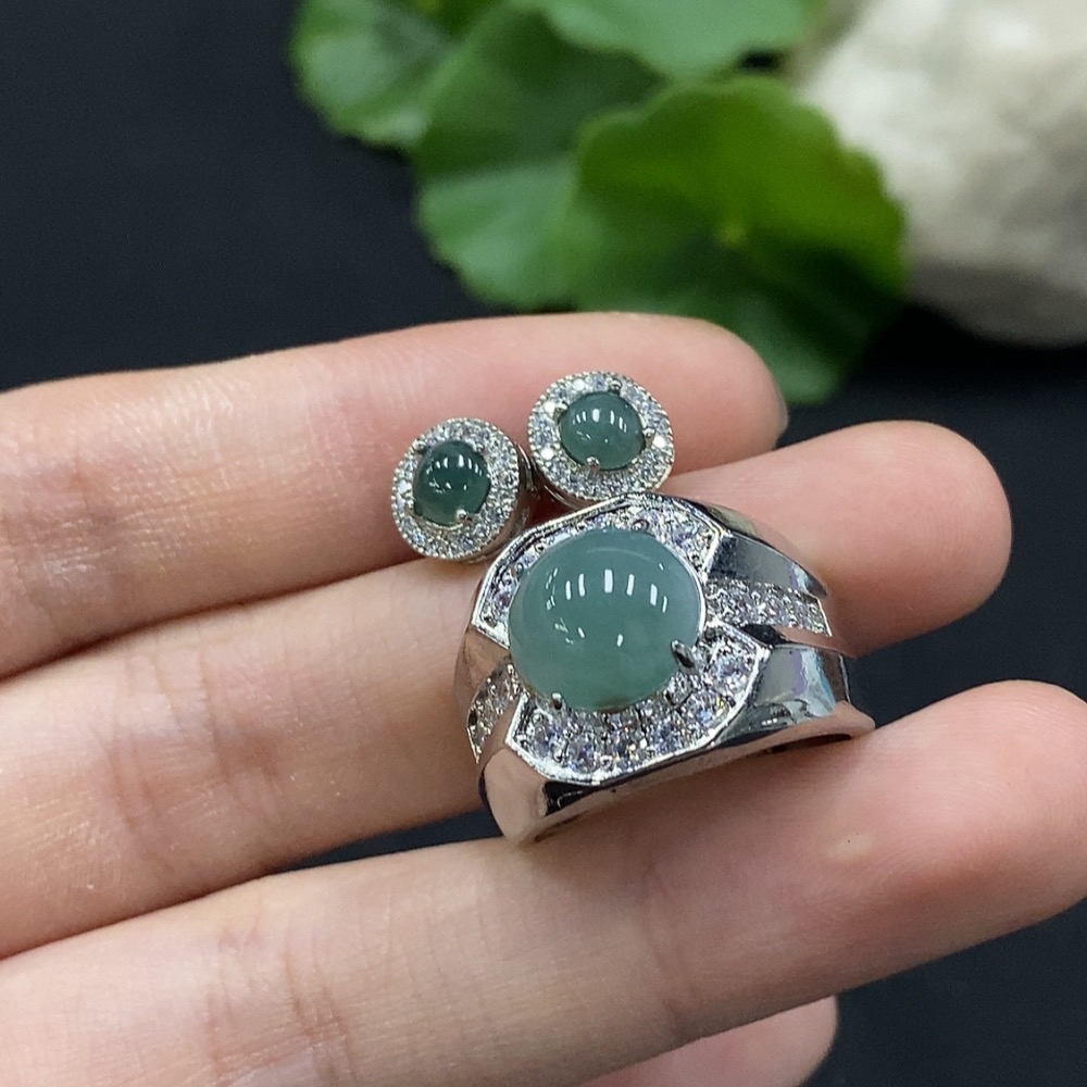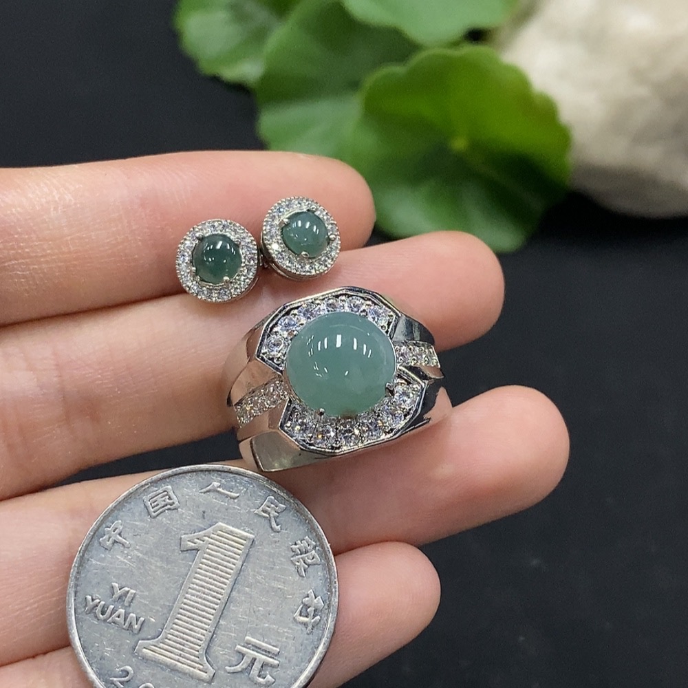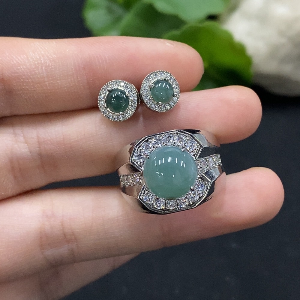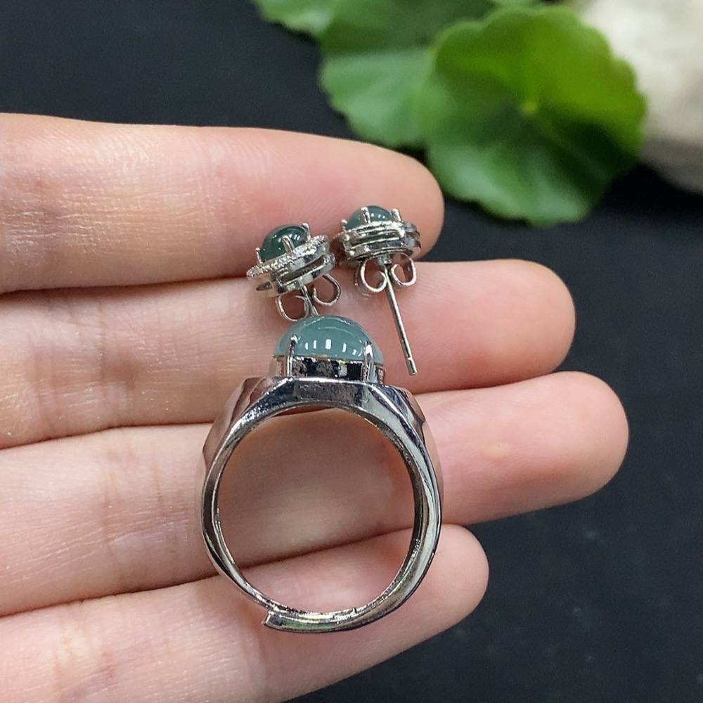 Jadeite cabochon earrings / adjustable ring, non-gold setting