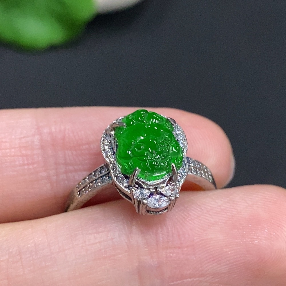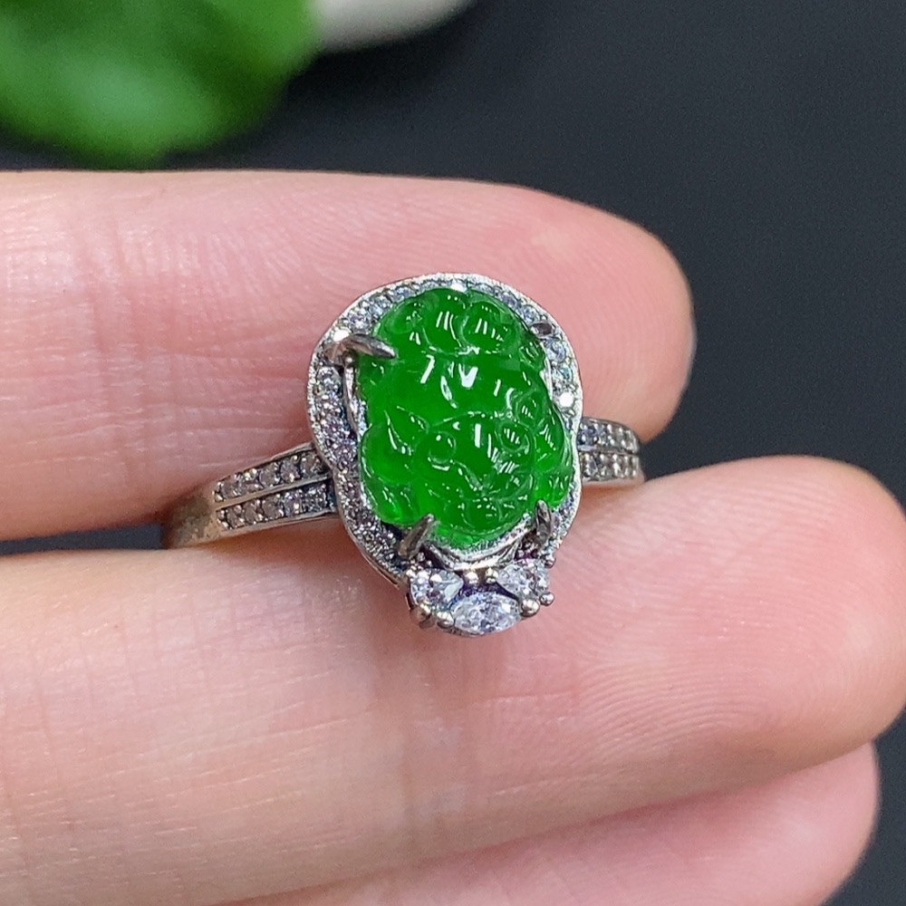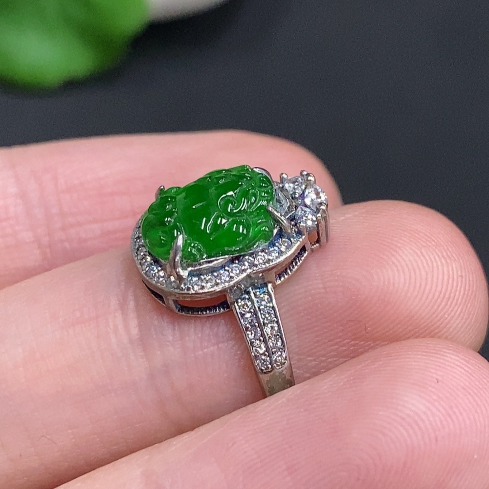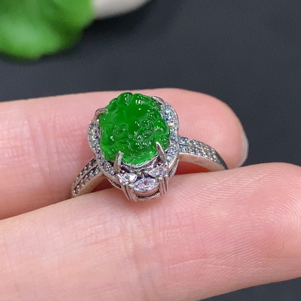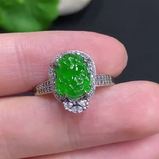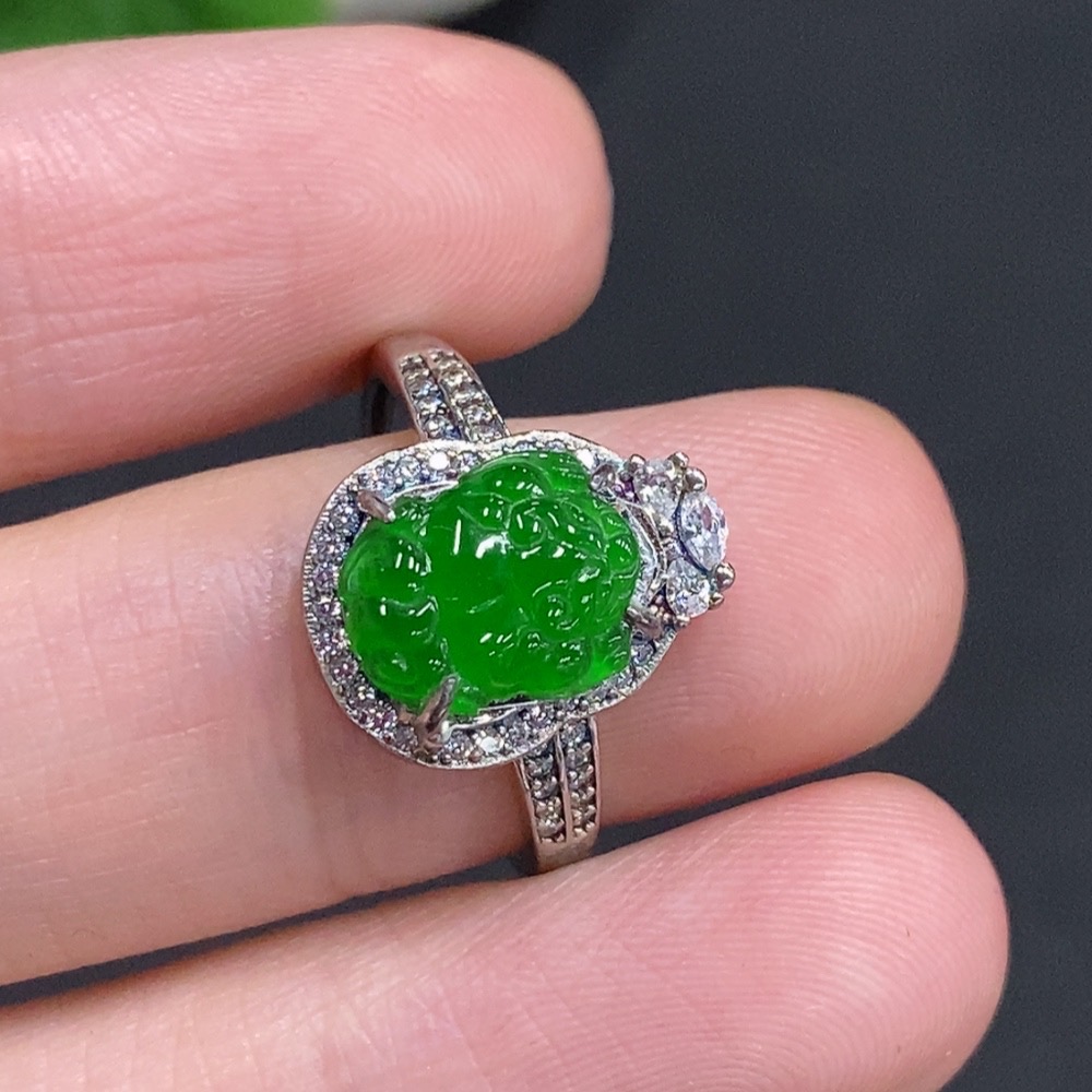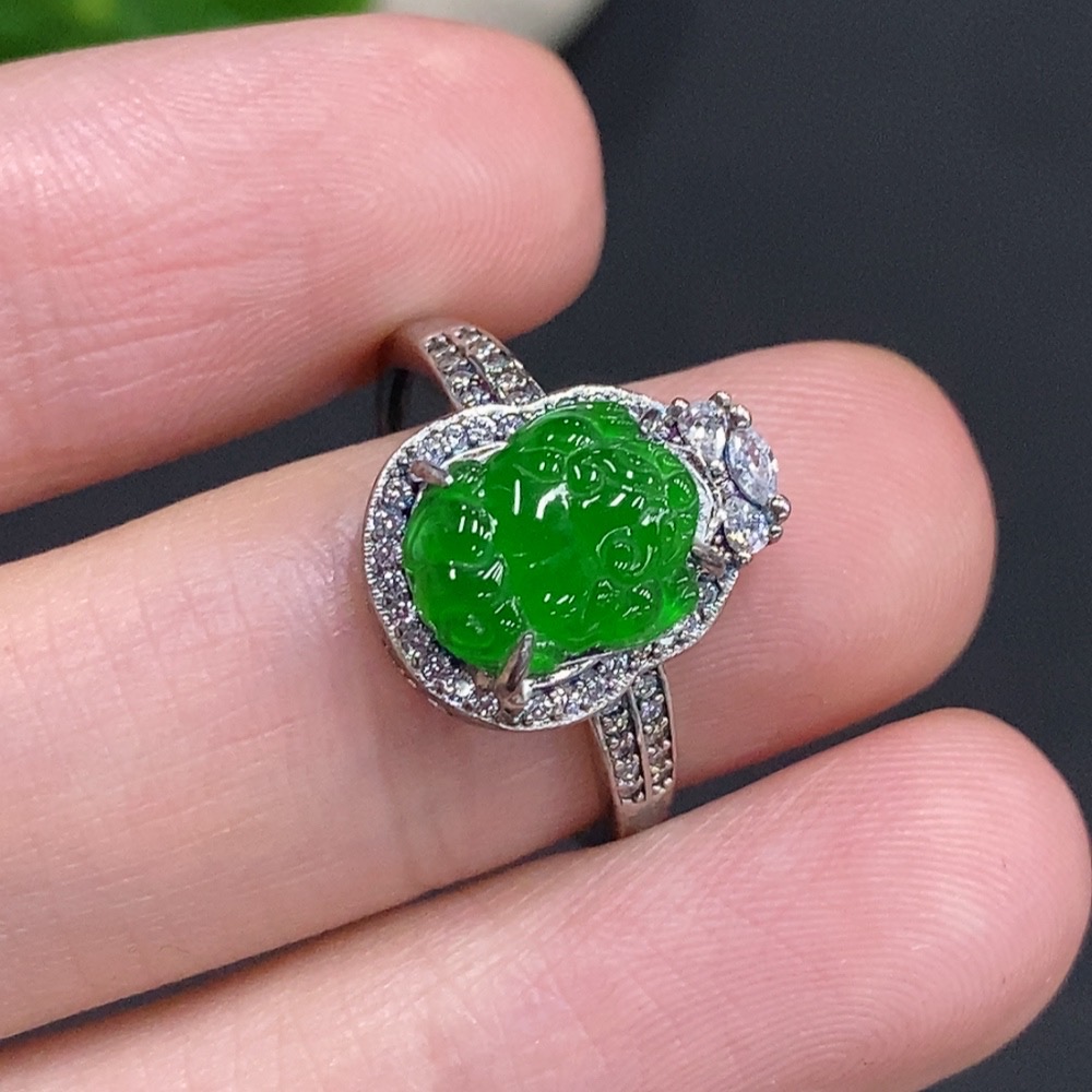 Jadeite Pixiu Inlaid Ring Non-Gold Inlaid Adjustable Size Total Weight About 2g