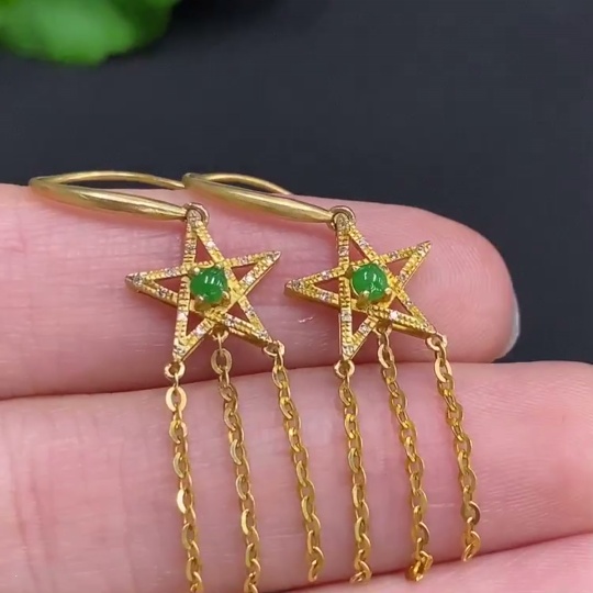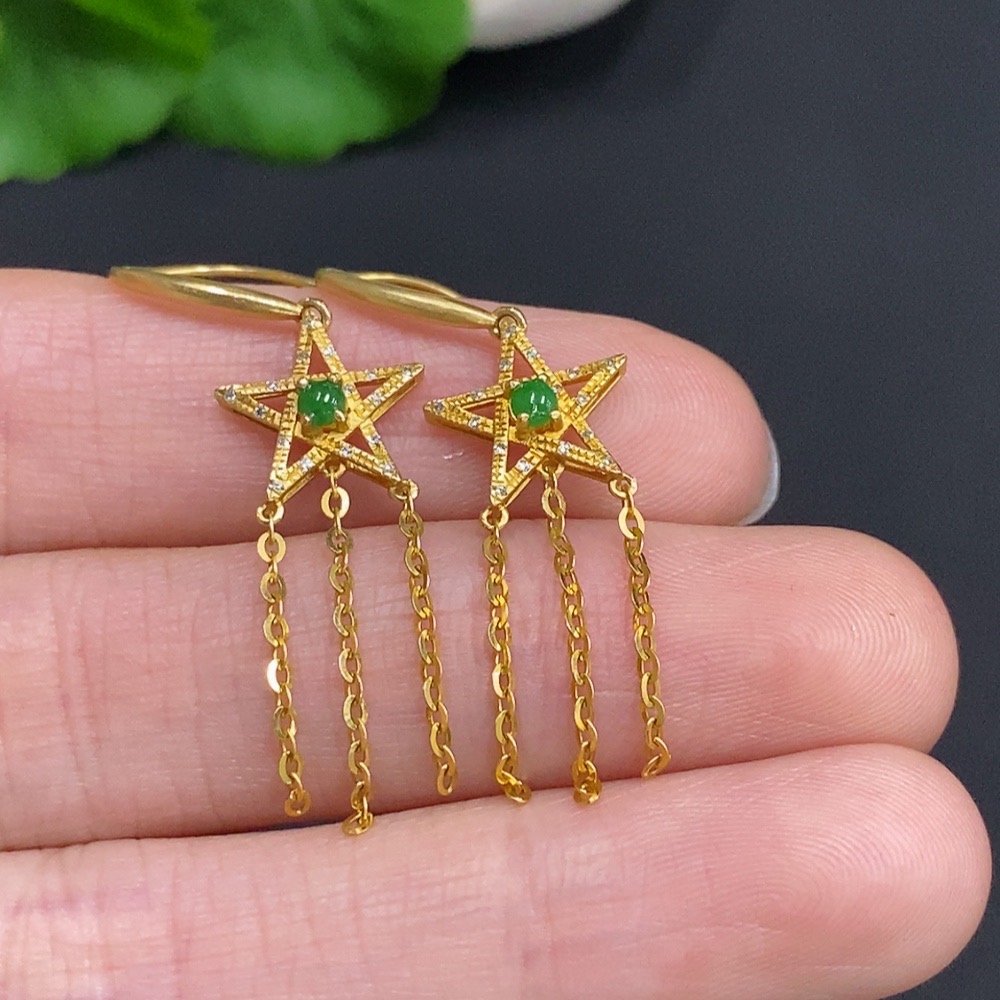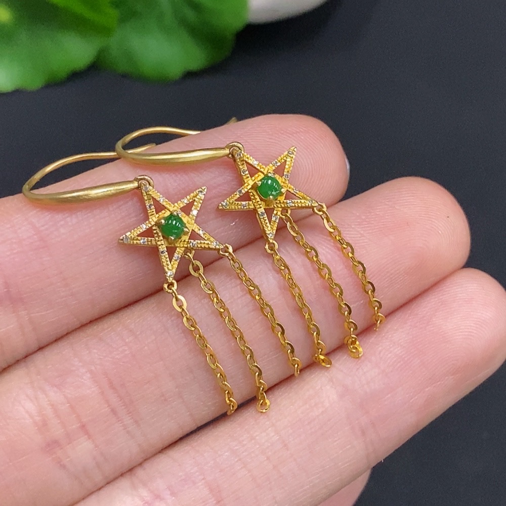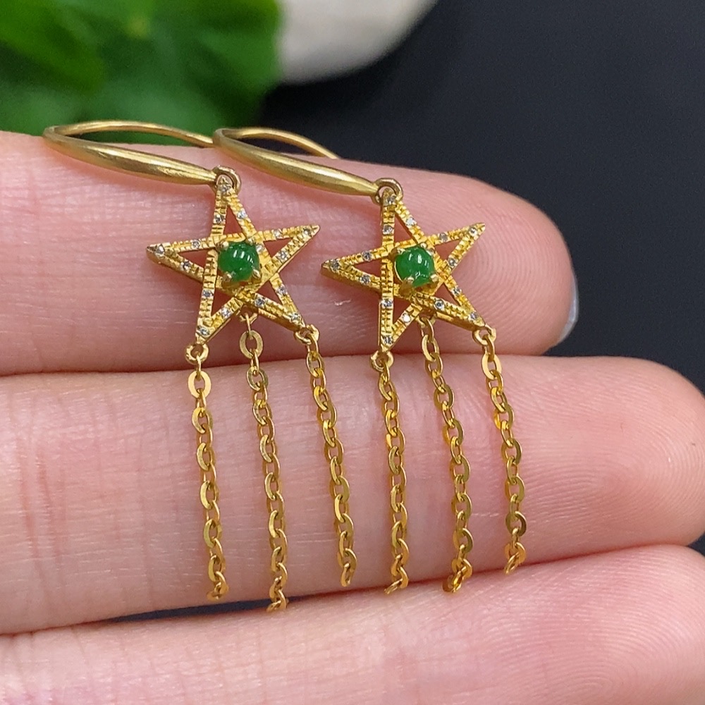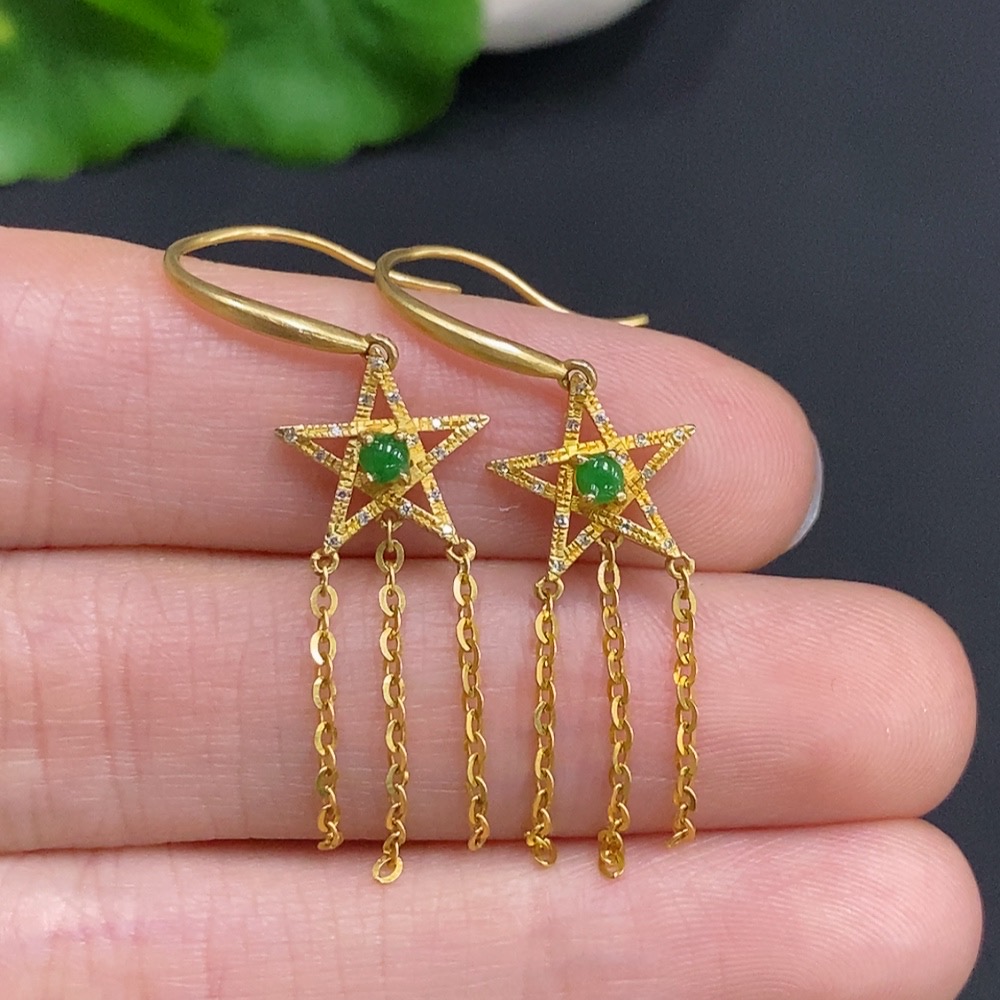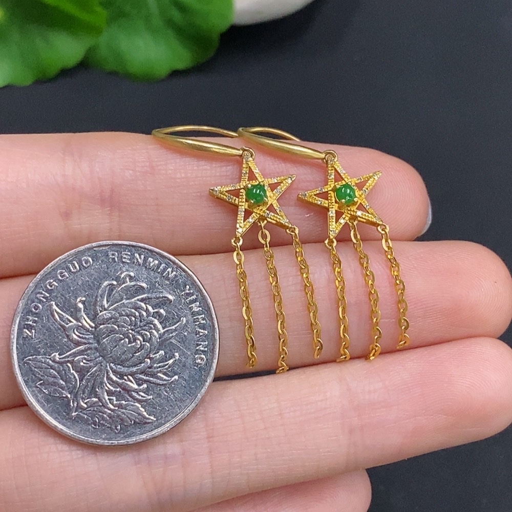 Jadeite cabochon earrings set in 18k gold with diamond accents, total weight approximately 1.9g