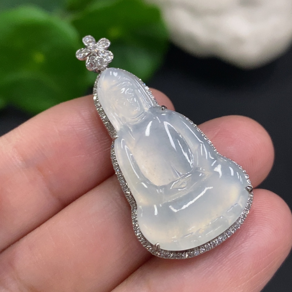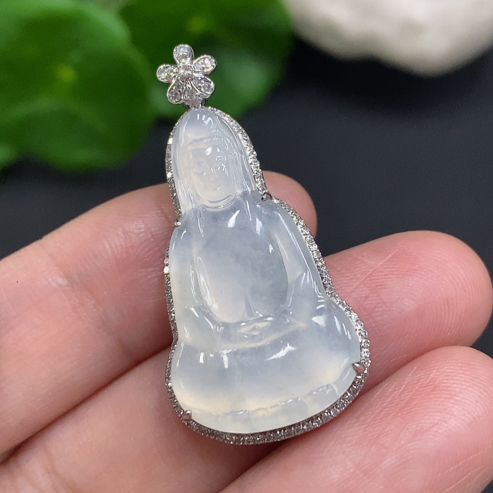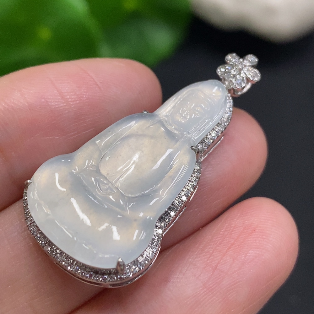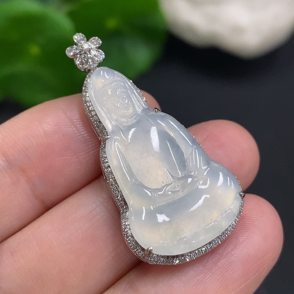 Jadeite Guanyin Inlaid Pendant 18K Gold Total Weight Approx. 4.5g (With Diamond Accents)