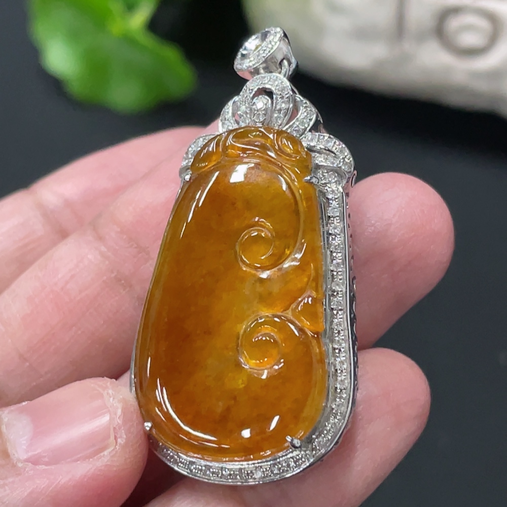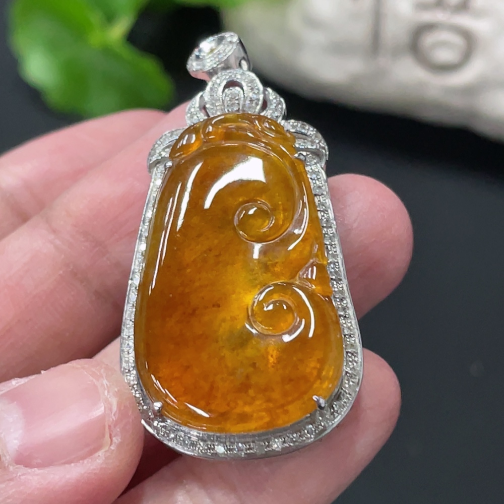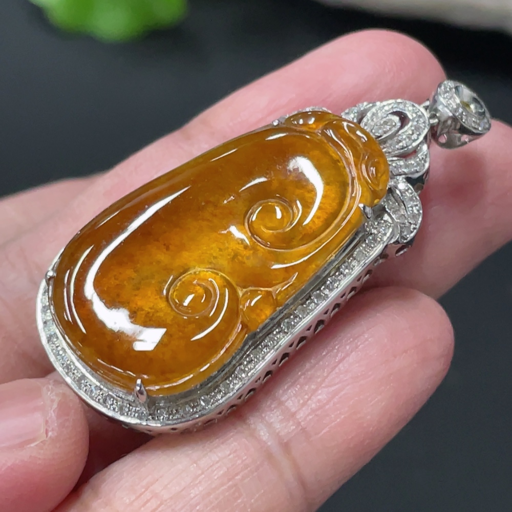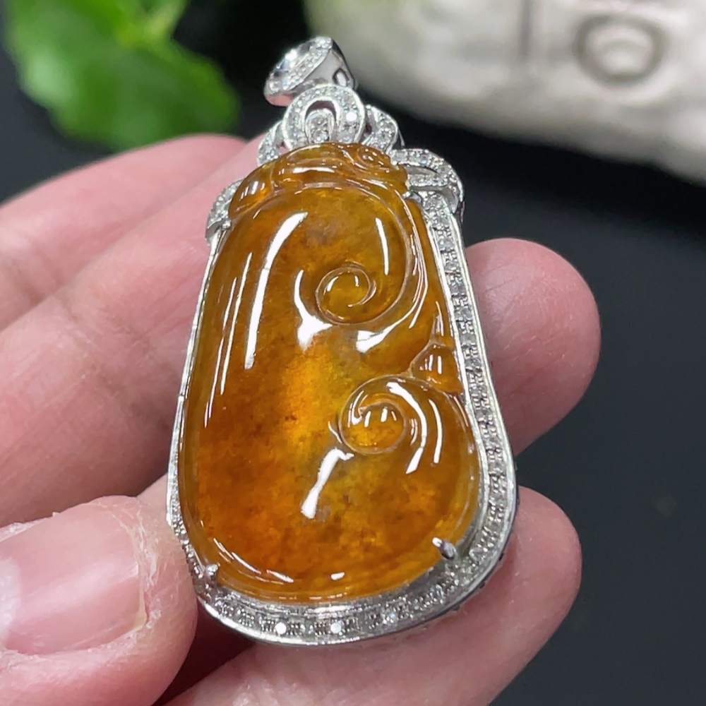 Jadeite Ruyi Inlaid Pendant, 18K Gold Setting with Diamond Accents, Total Weight Approx. 8.8g