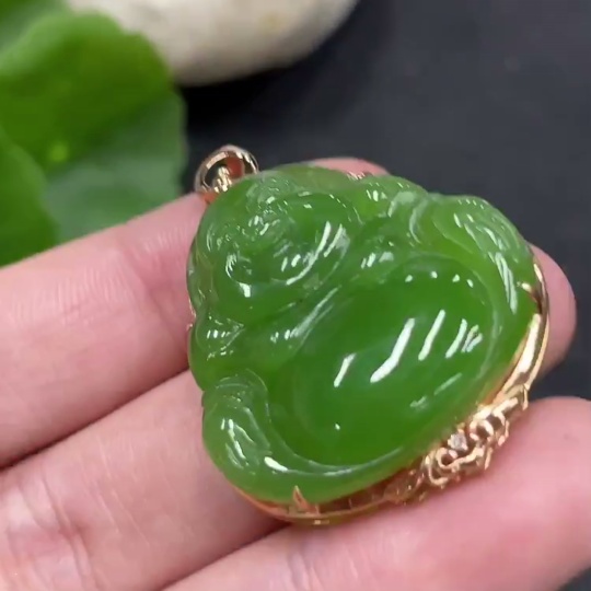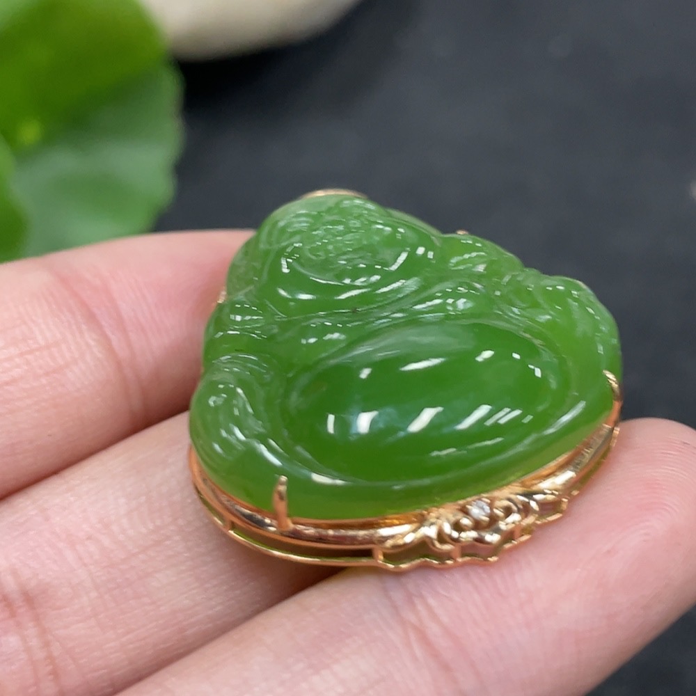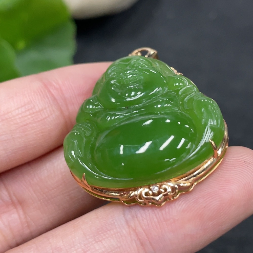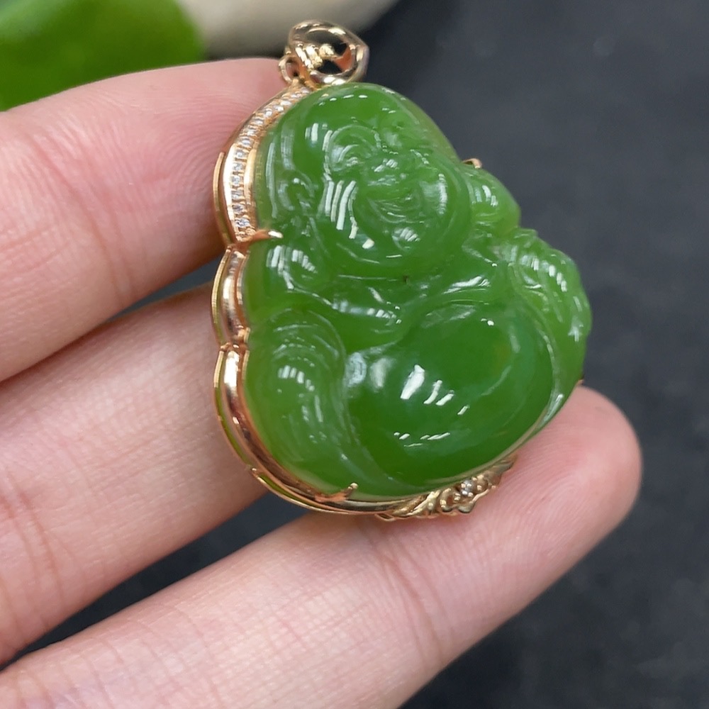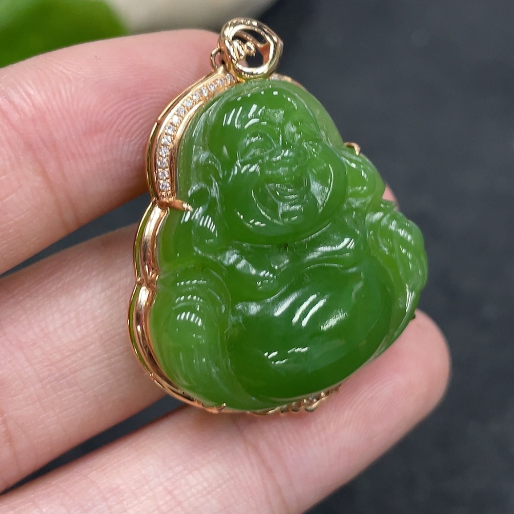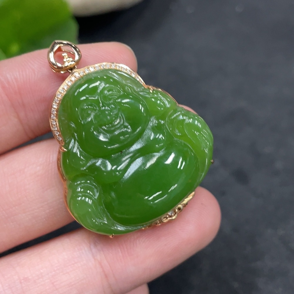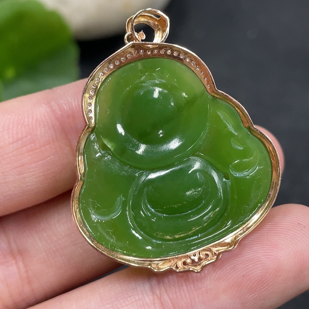 Hetian Jade Pendant with Buddha, 18k Gold and Diamond Accents, Total Weight Approx. 7.3g