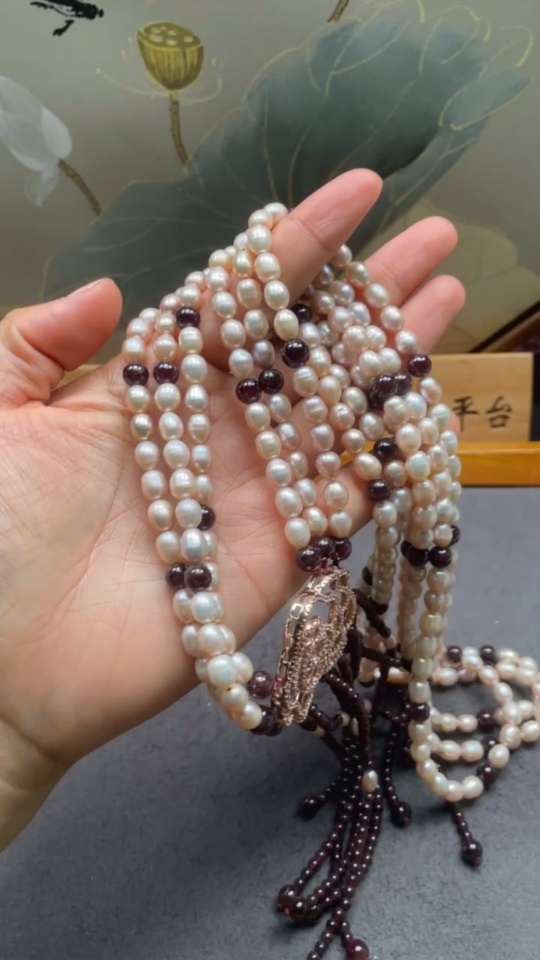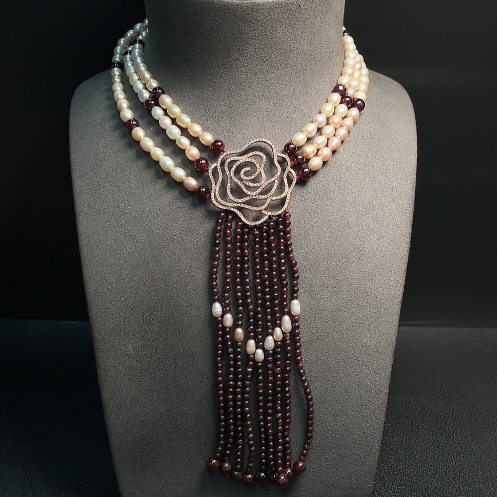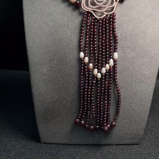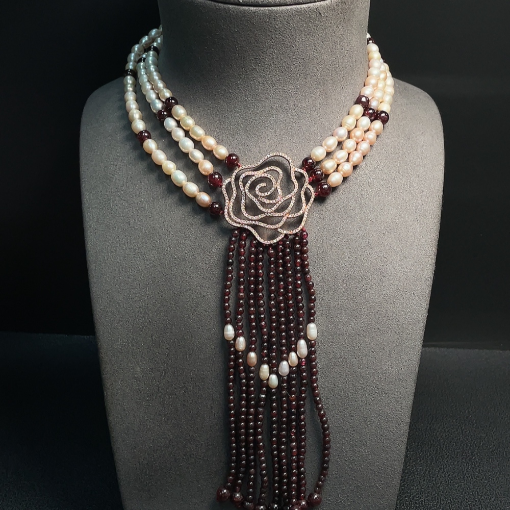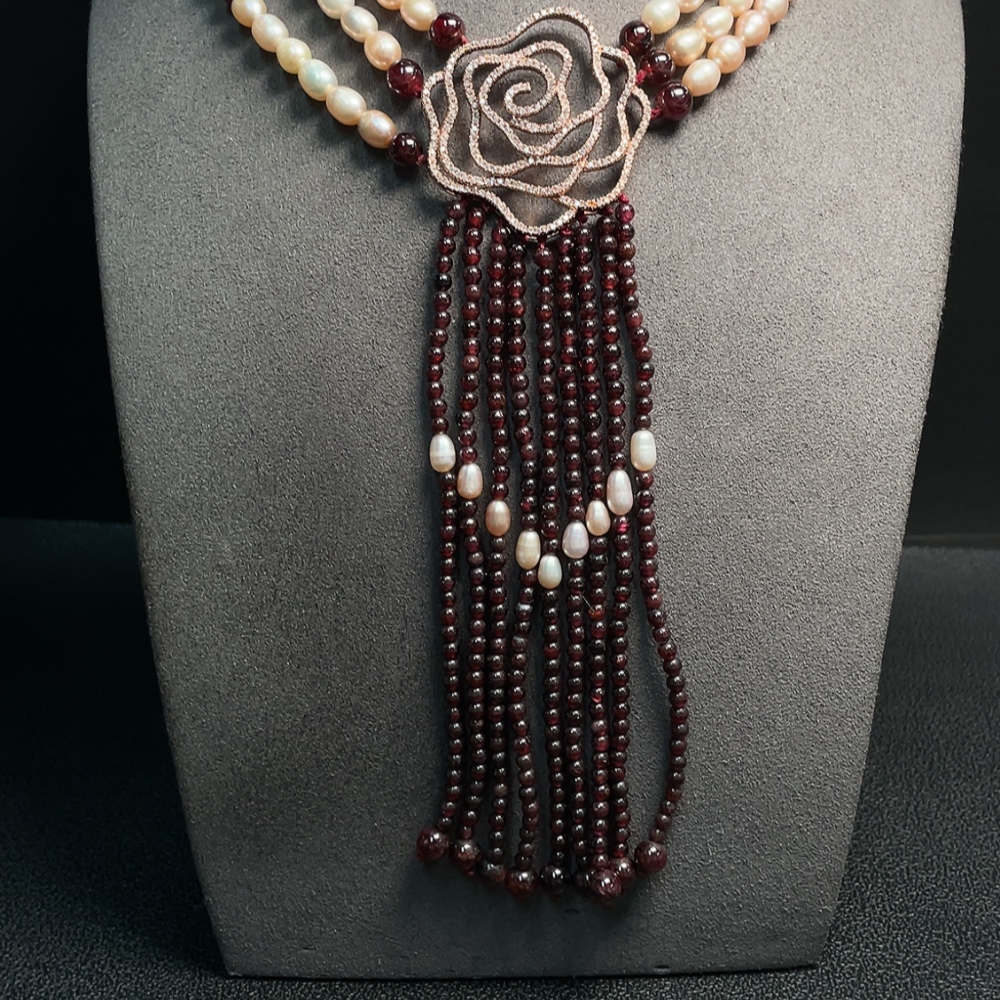 Pearl bead necklace with garnet, non-gold, total weight approx. 143.30g, bead size approx. 5.6mm