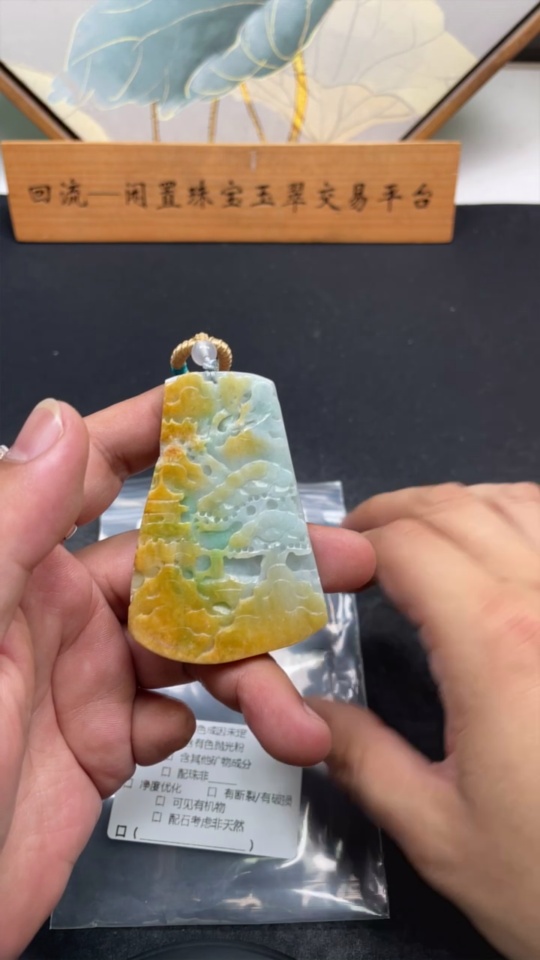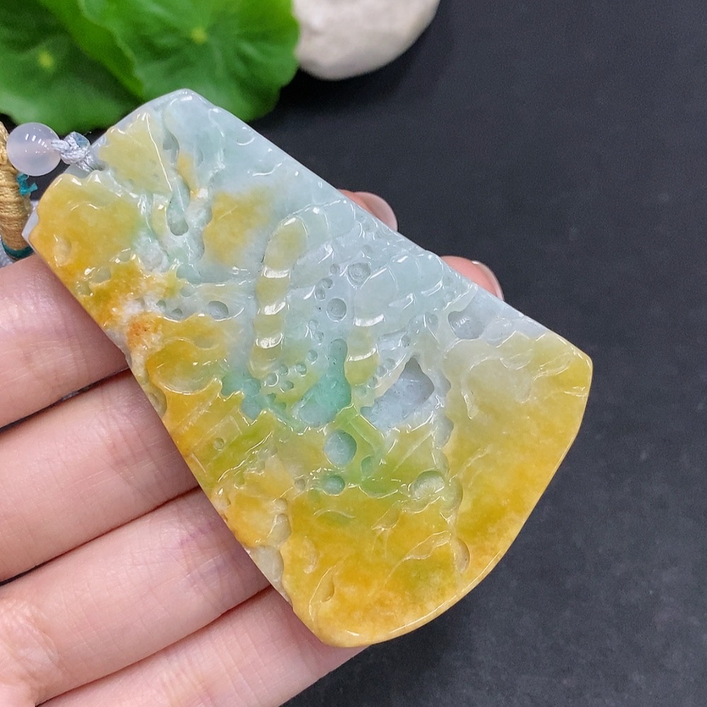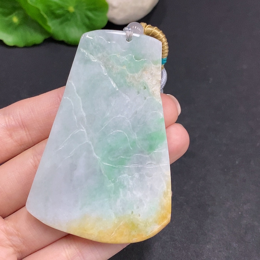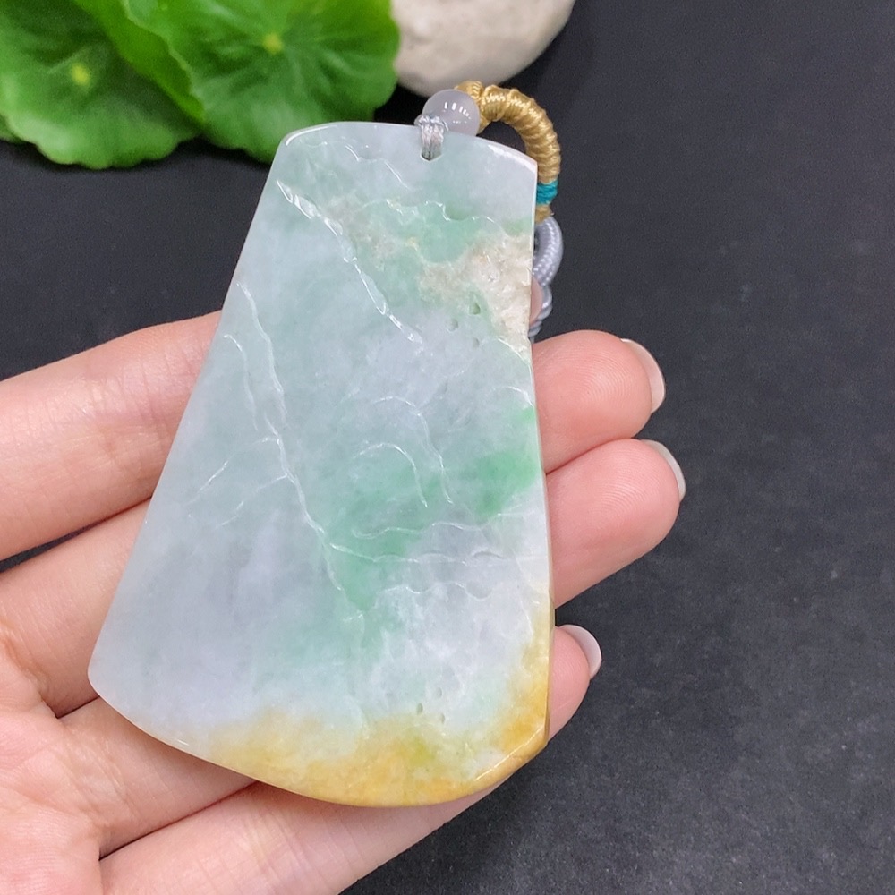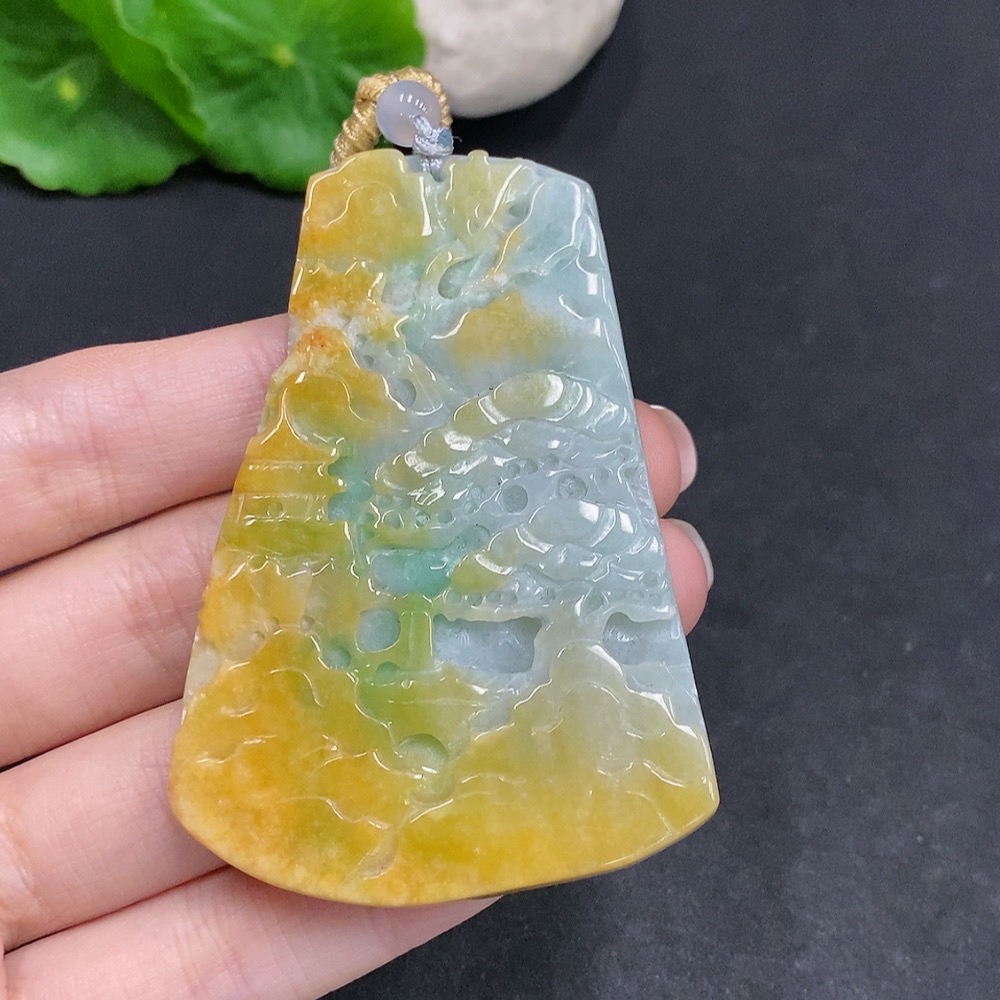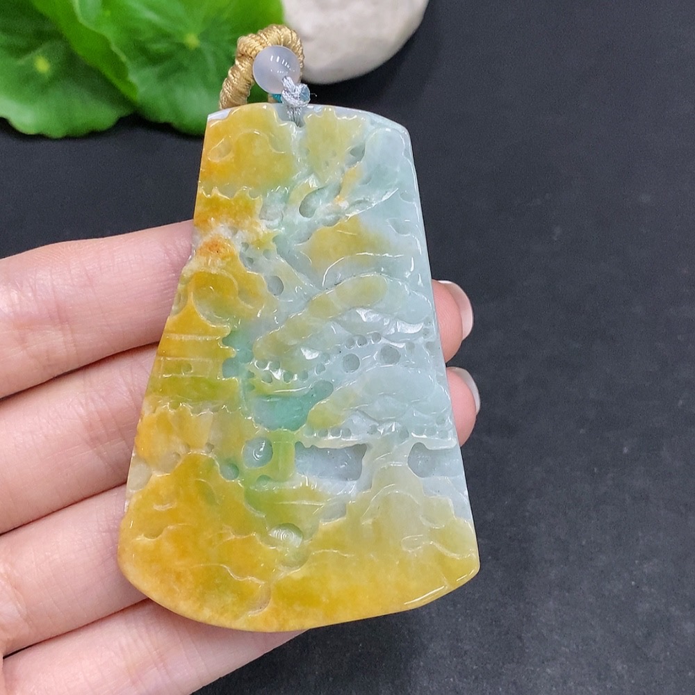 Jadeite landscape pendant, total weight approx. 49g (including cord), yellow color origin undetermined