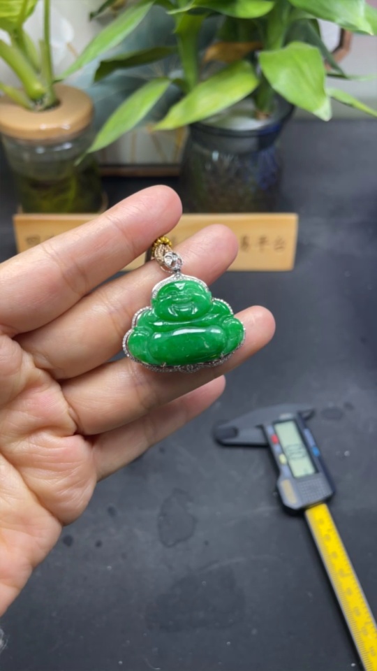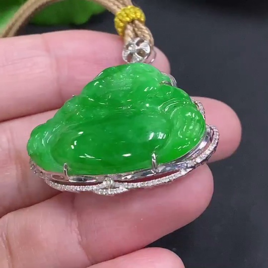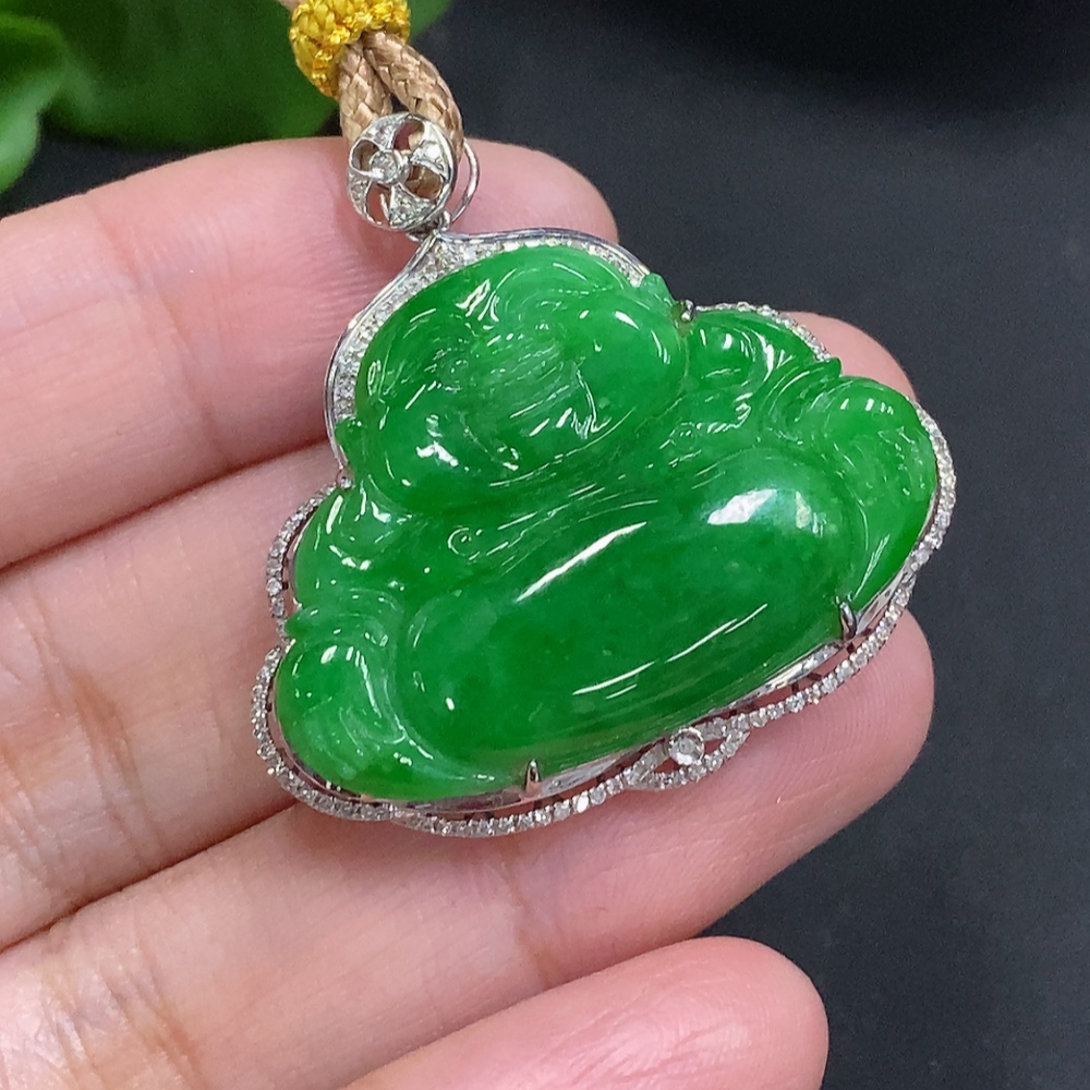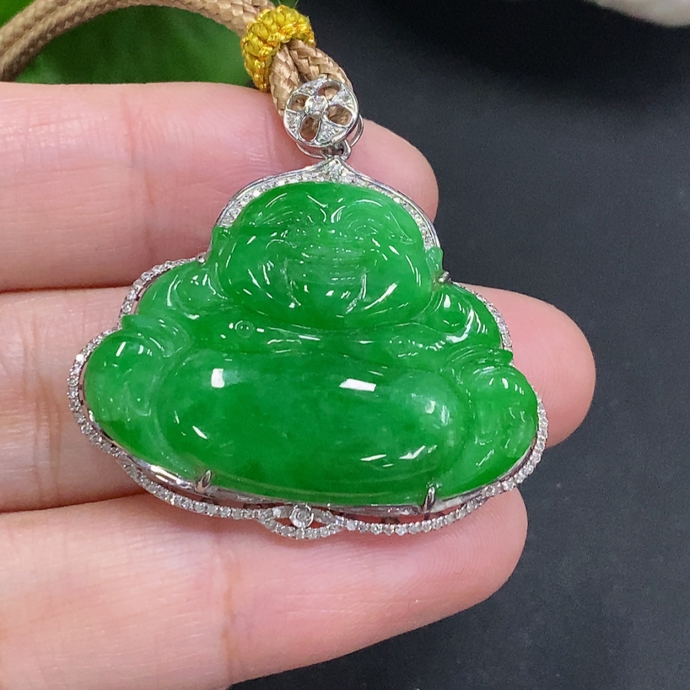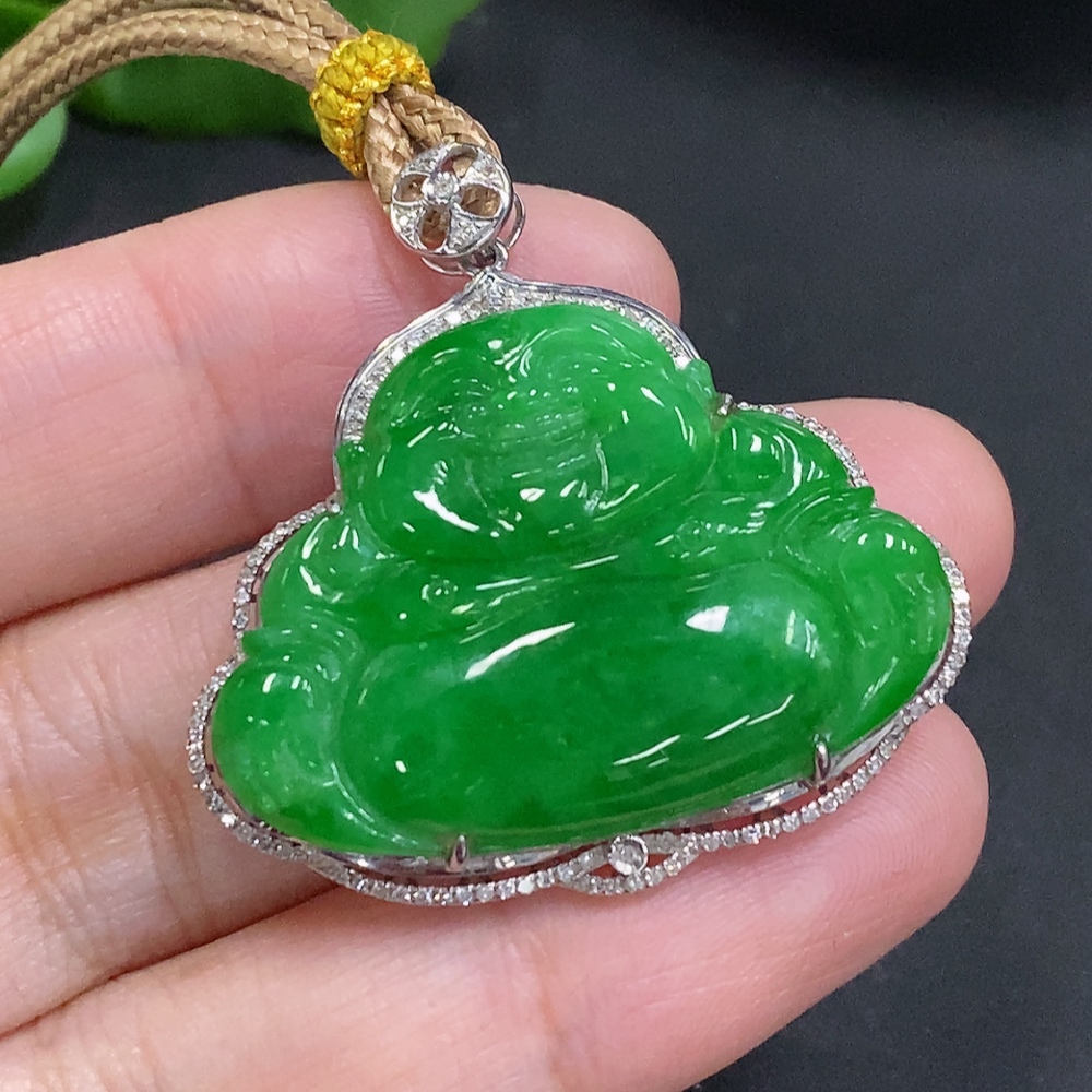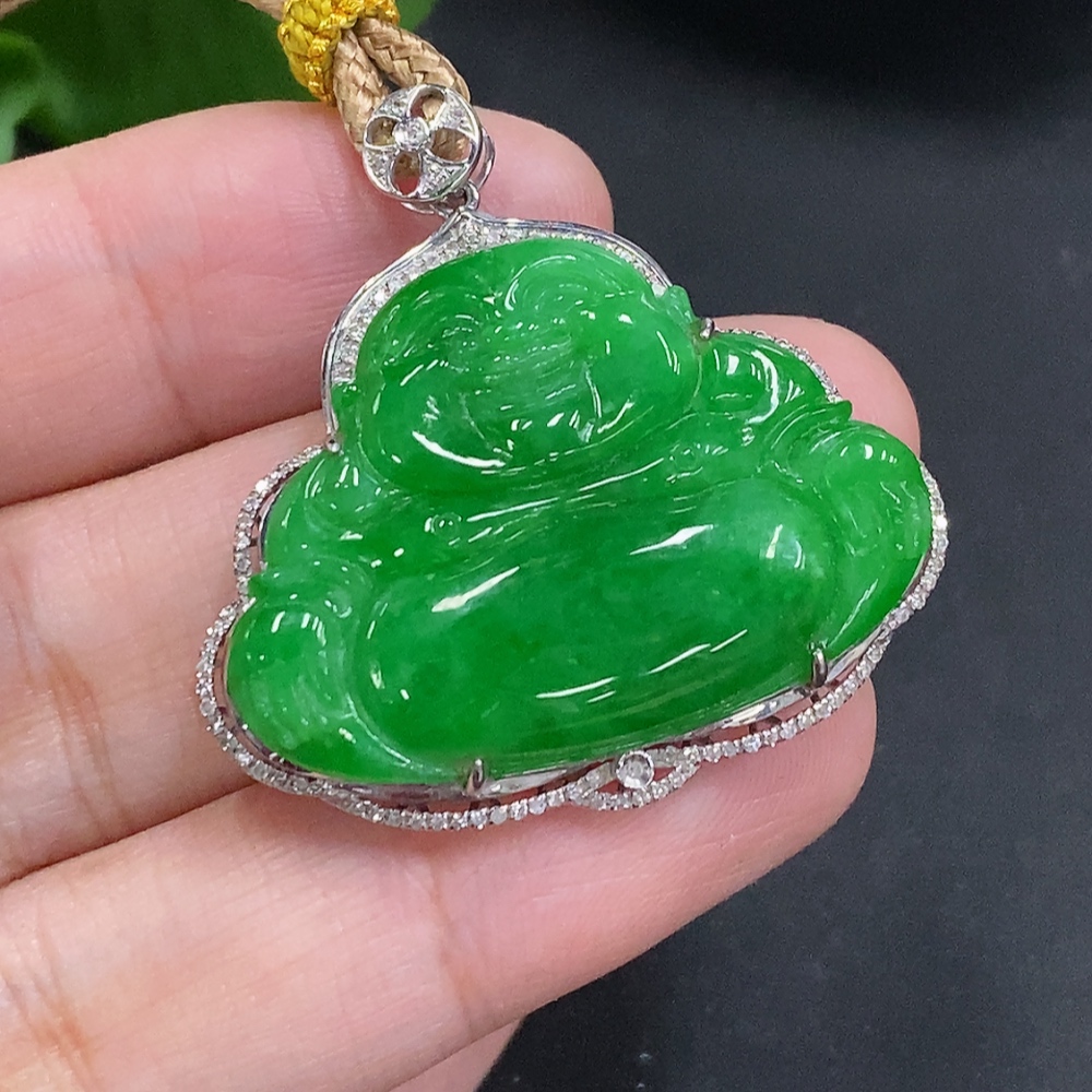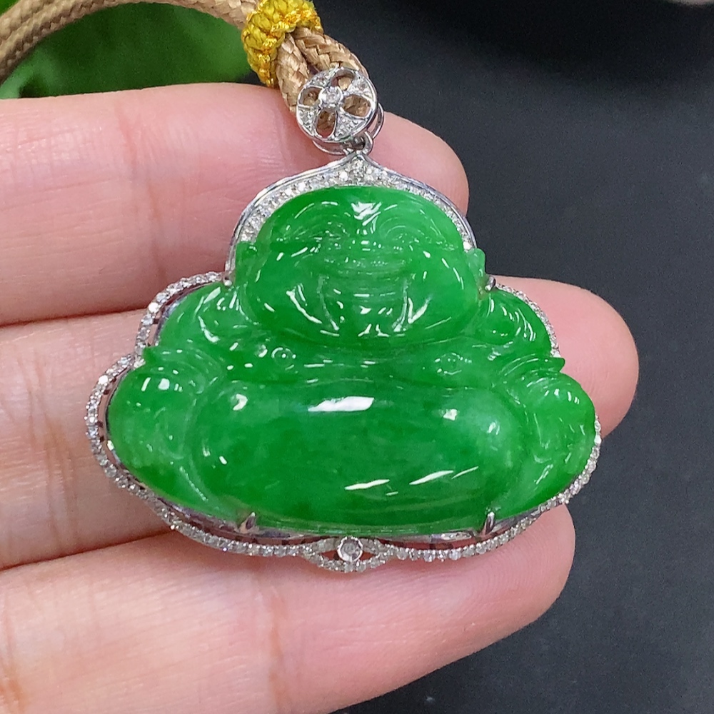 Jadeite Buddha Pendant with 18K Gold Setting, Total Weight Approximately 11.8g Including Cord (Accented with Diamonds)