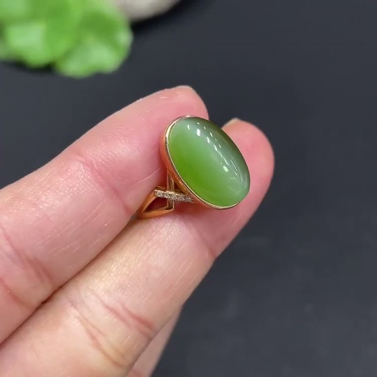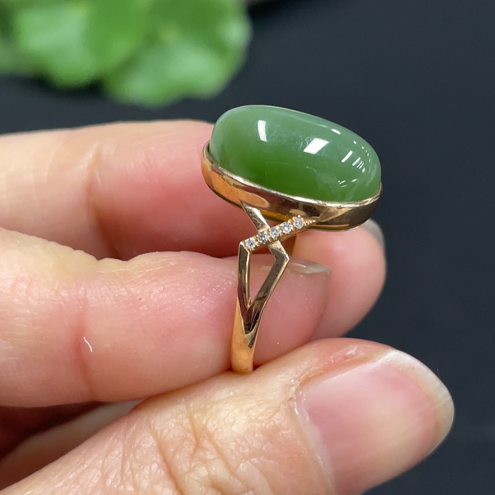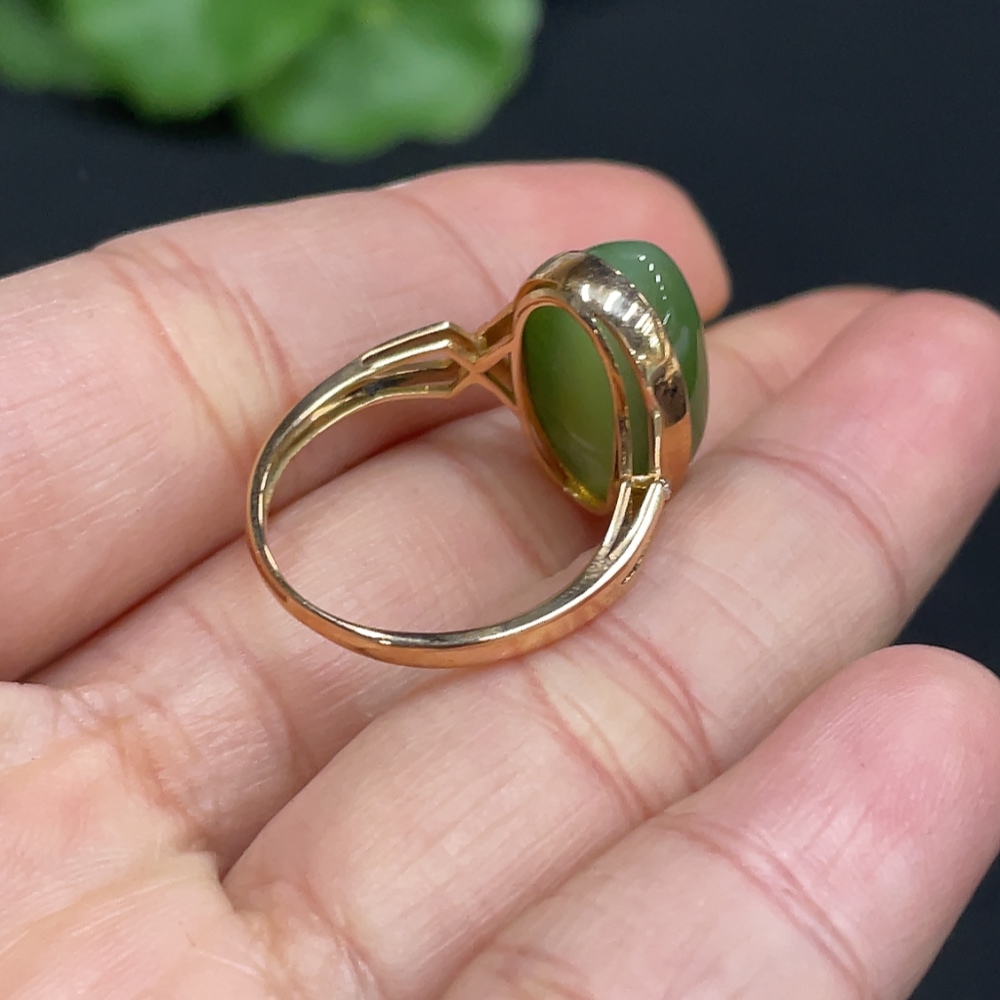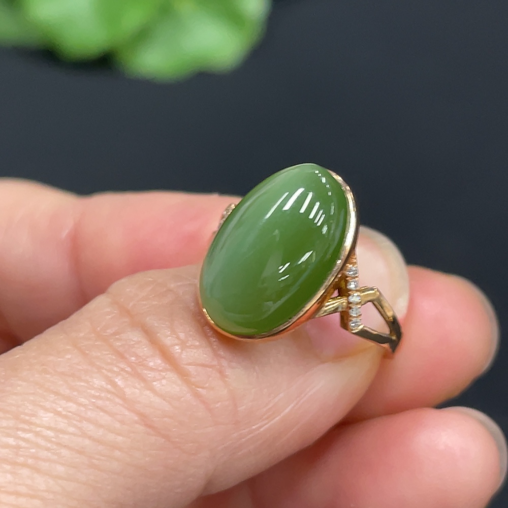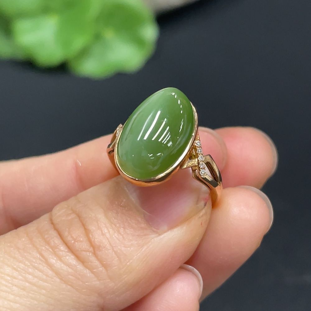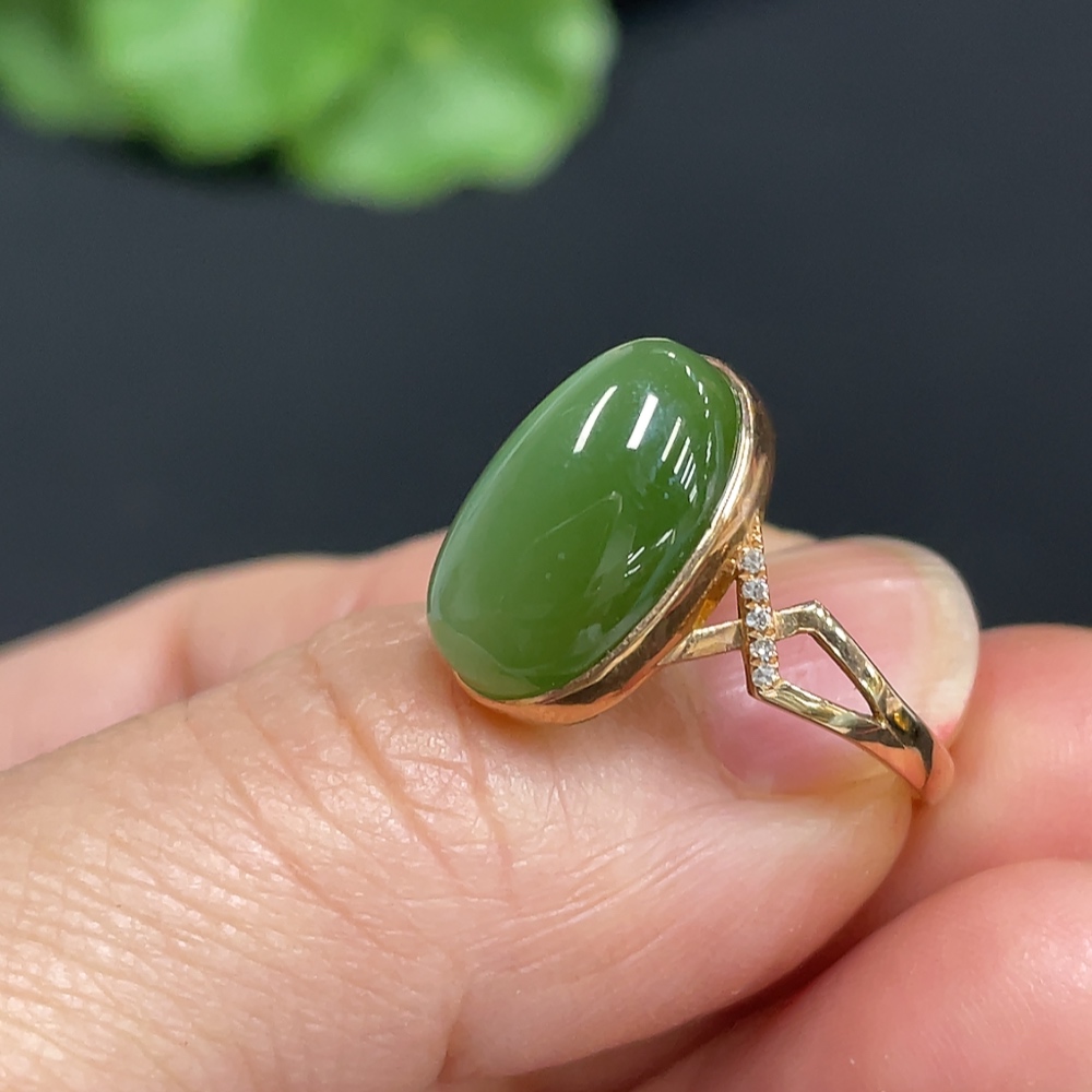 Hetian Jade Jasper Inlaid Ring, 18k Gold, Size 11, Total Weight Approx. 3.2g, Diamond Accents