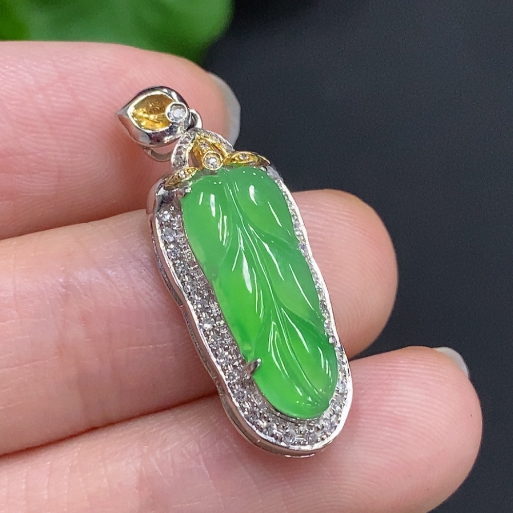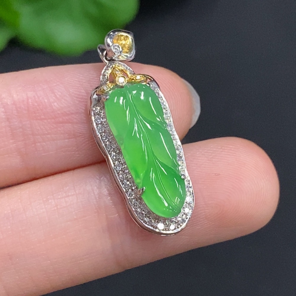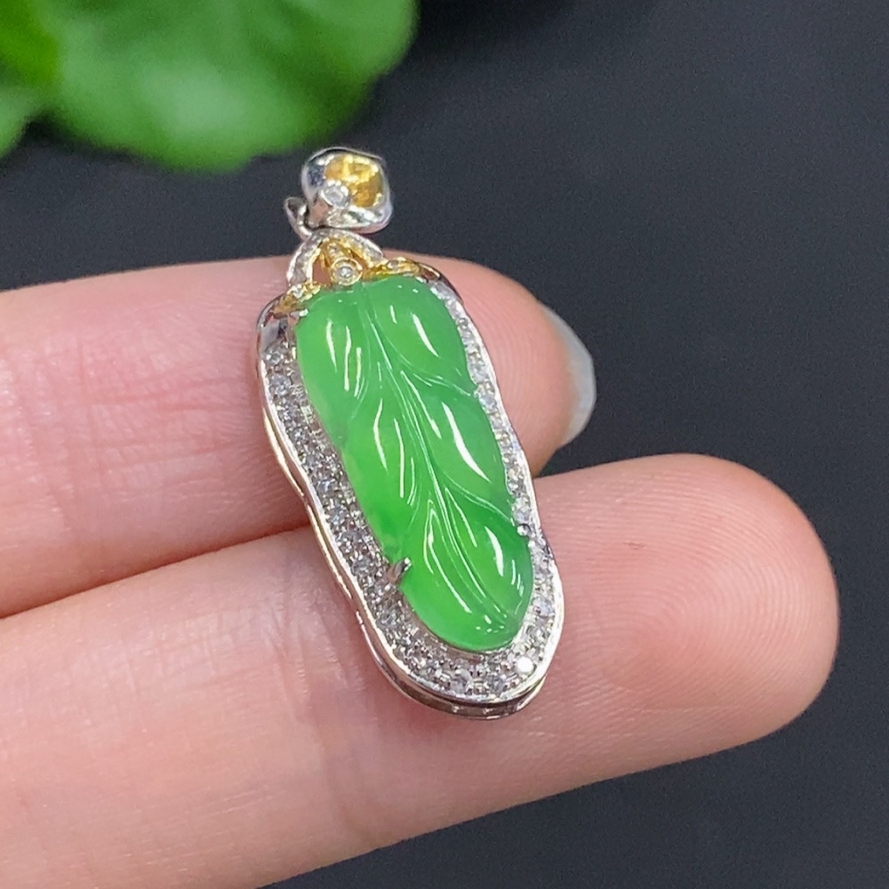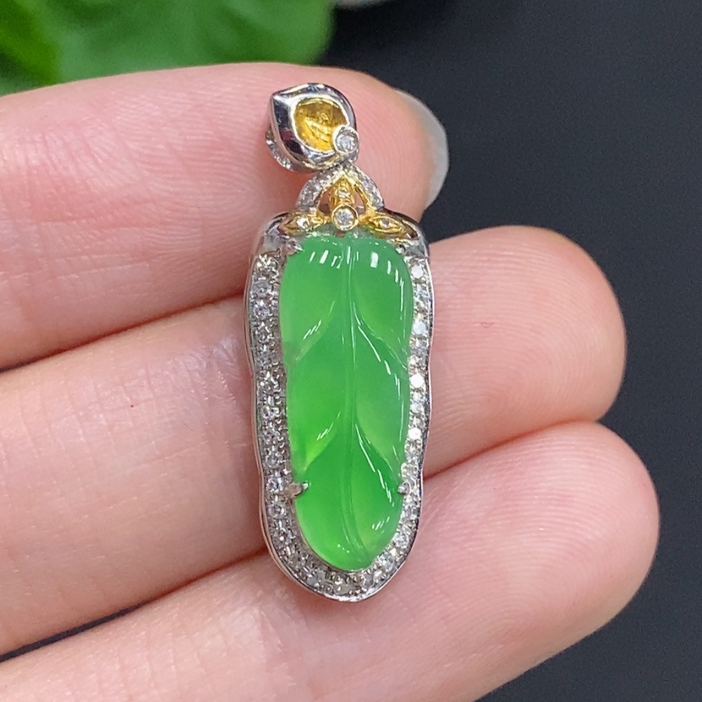 Jadeite Leaf Inlaid Pendant 18K Gold with Diamond Accents Total Weight Approx. 2.37g