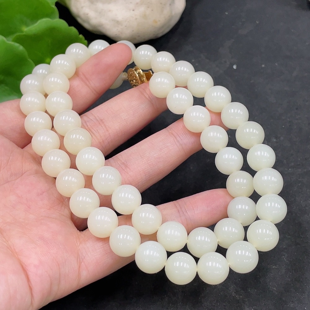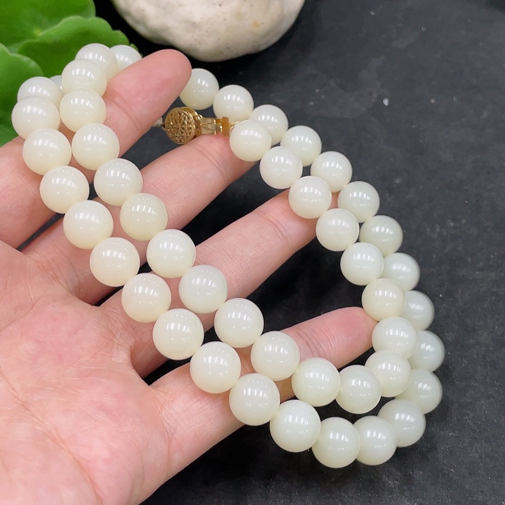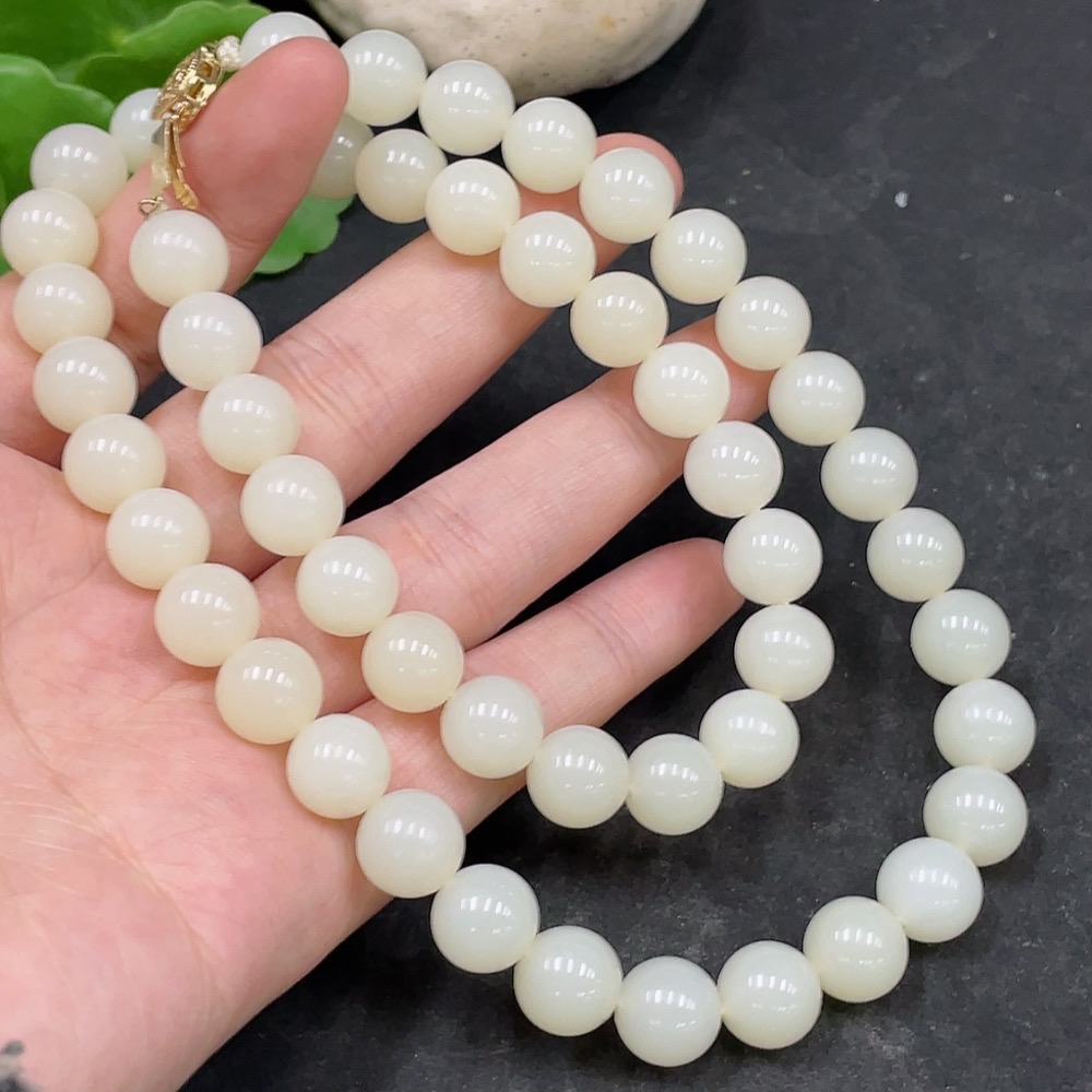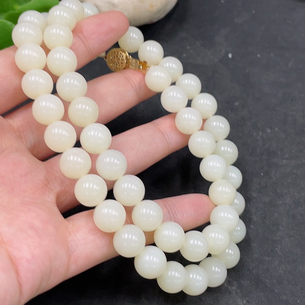 Hetian Jade Bead Necklace, 58% Gold Content, Approx. 9.5mm, Total Weight Approx. 74.3g