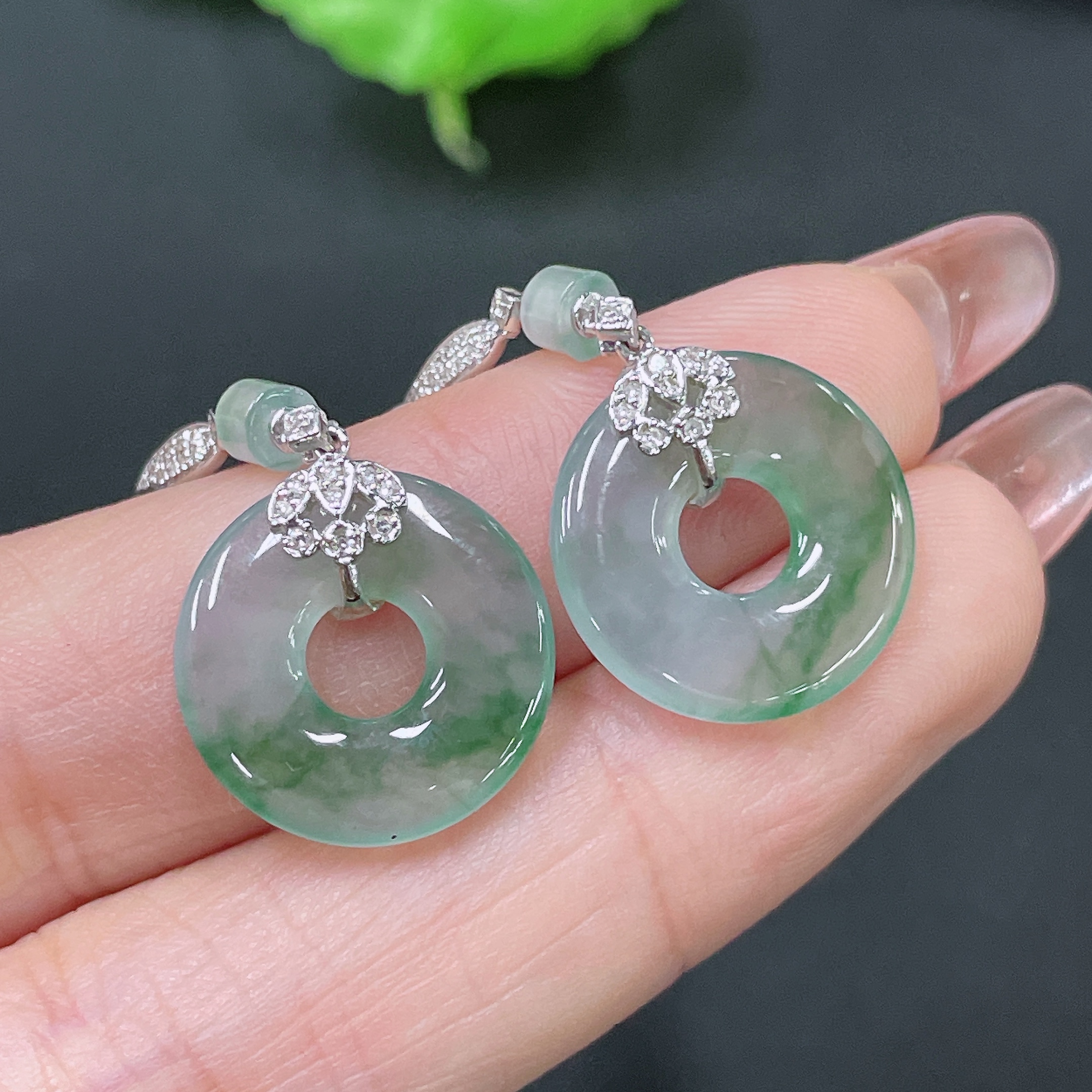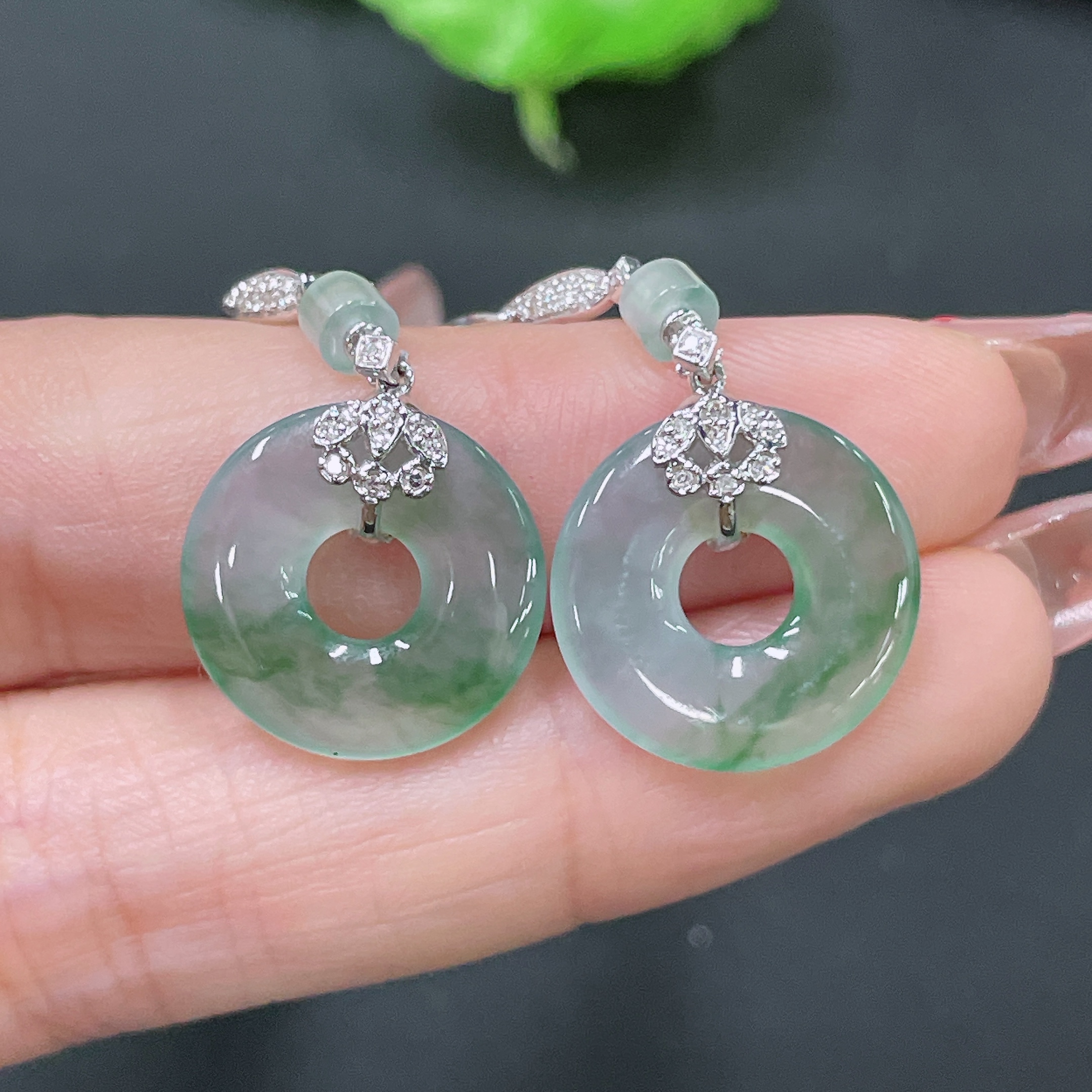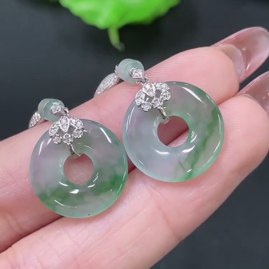 Jadeite Earrings 18k Gold Inlaid with Diamonds Total Weight Approx. 4.75g