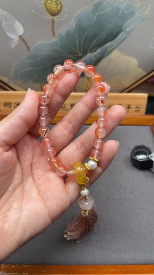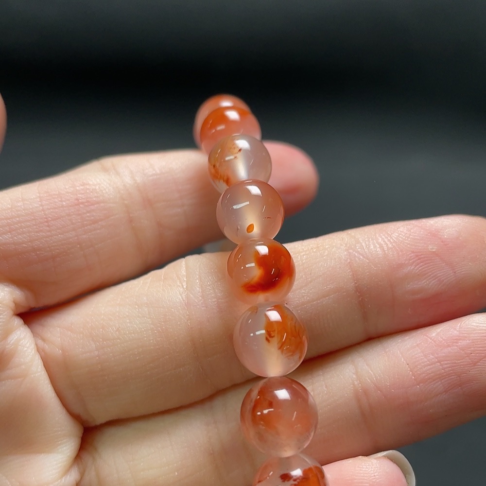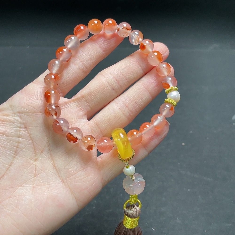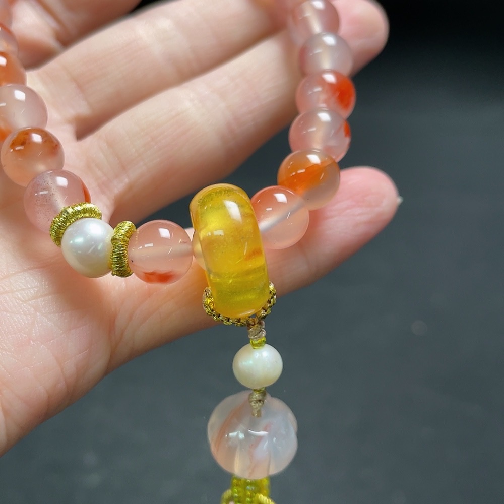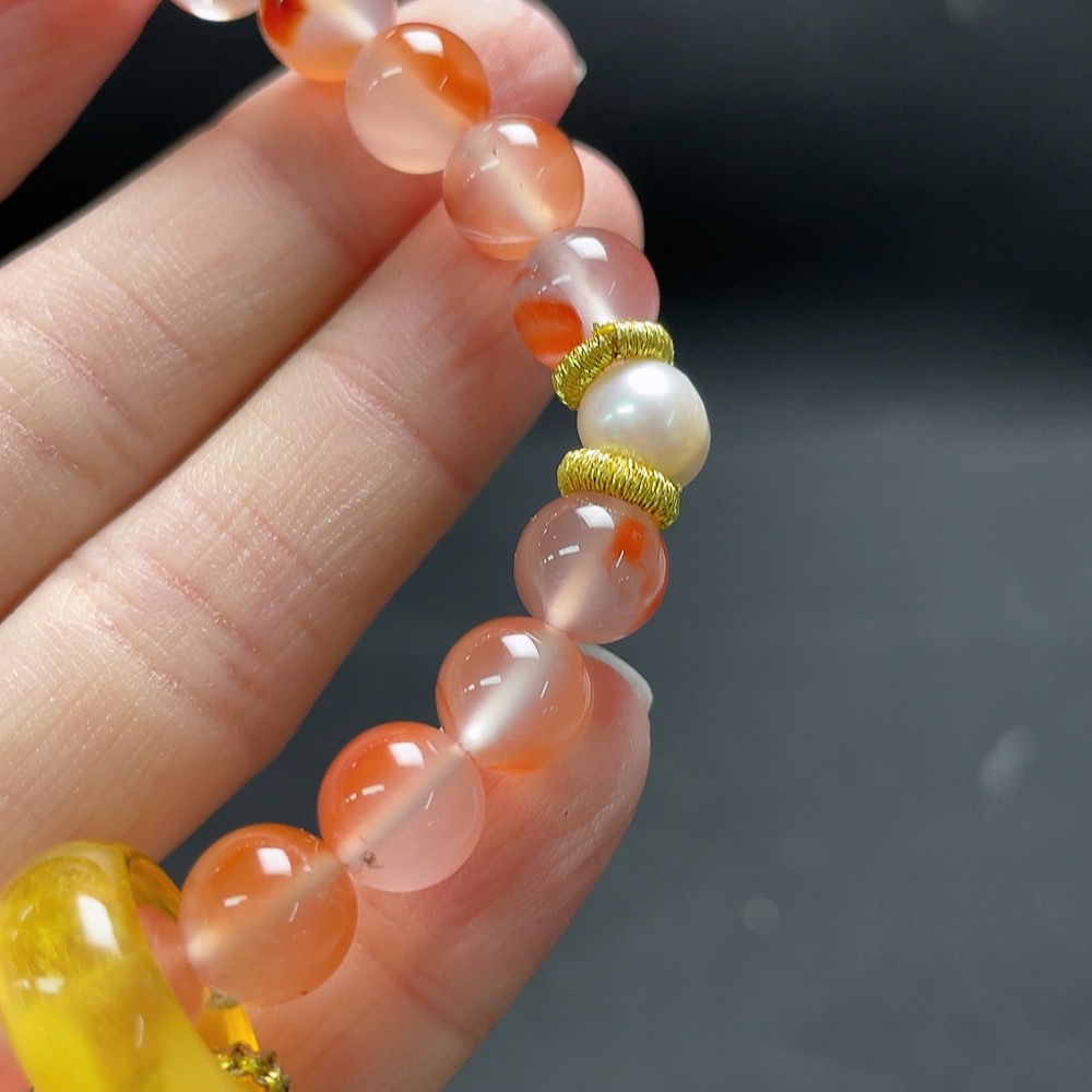 Red Agate Bracelet with Pearl, Amber, Visible Organic Matter, Including String, Total Weight Approx. 25.1g, Size About 8.3mm