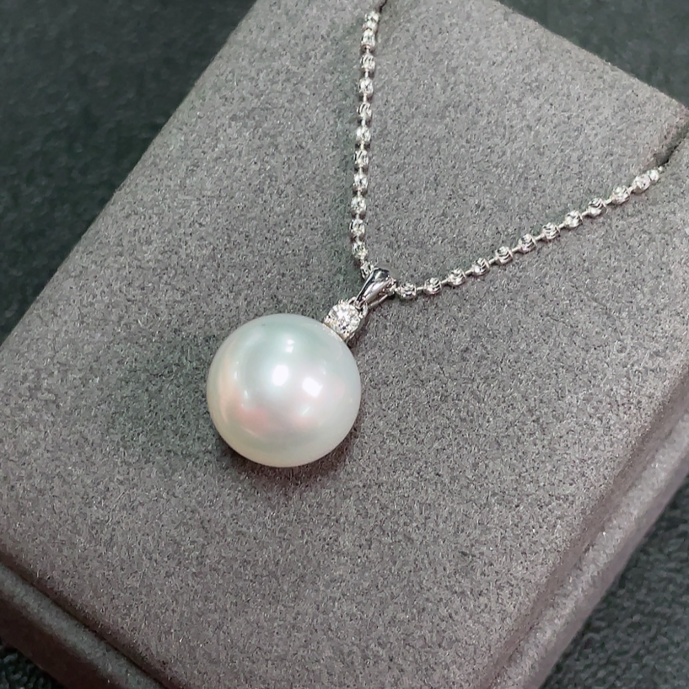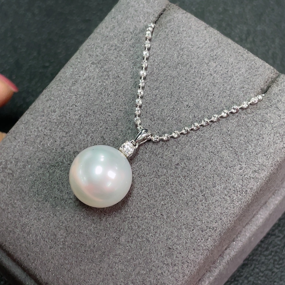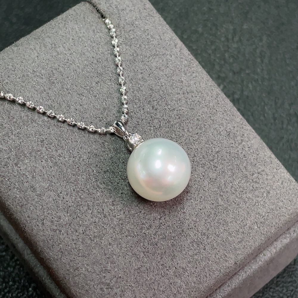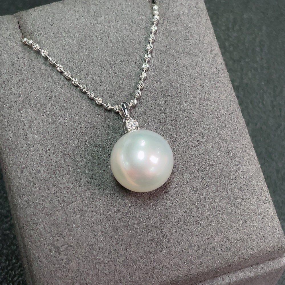 18k Saltwater Pearl Necklace with Diamond Accents, Total Weight Approximately 9.37g, Pearl Size About 13.4mm