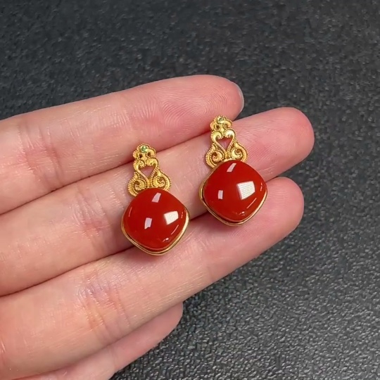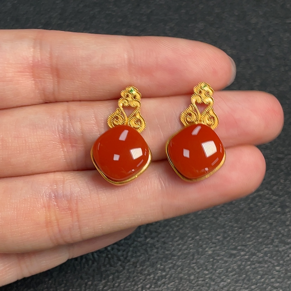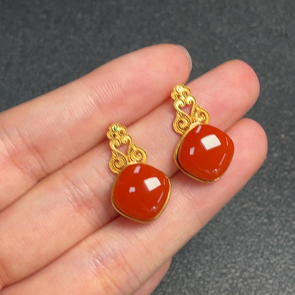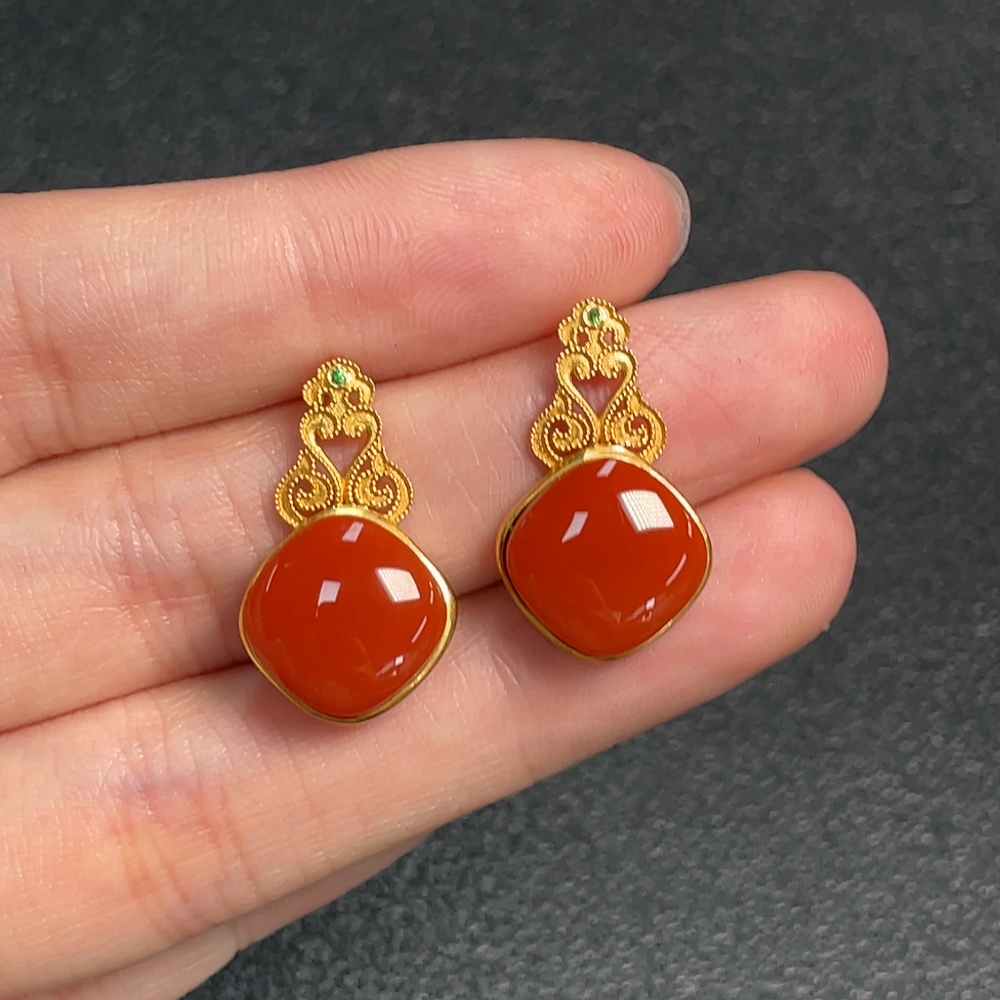 18K Red Agate Earrings with Visible Organic Matter, Diamond Accents, and Possible Non-Natural Gemstones, Total Weight Approximately 4.76g