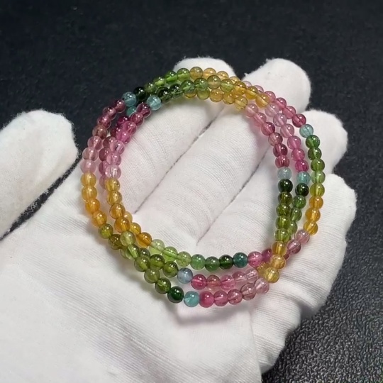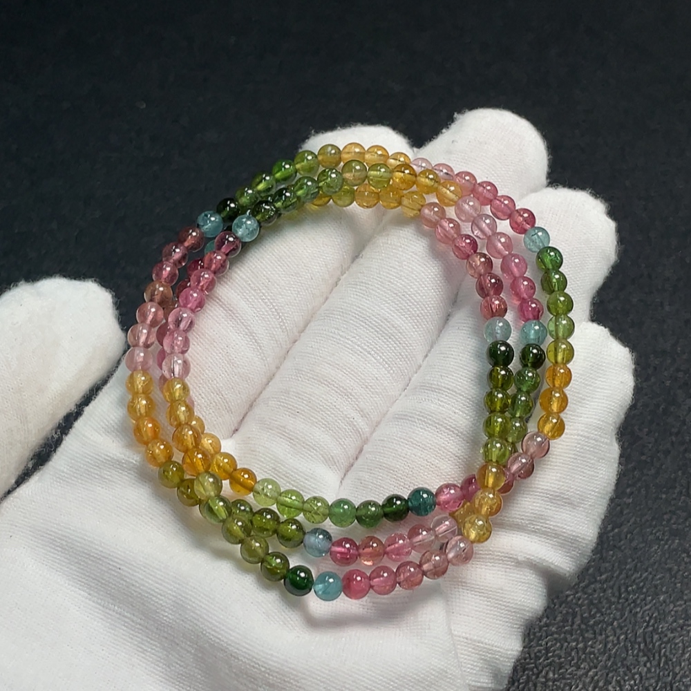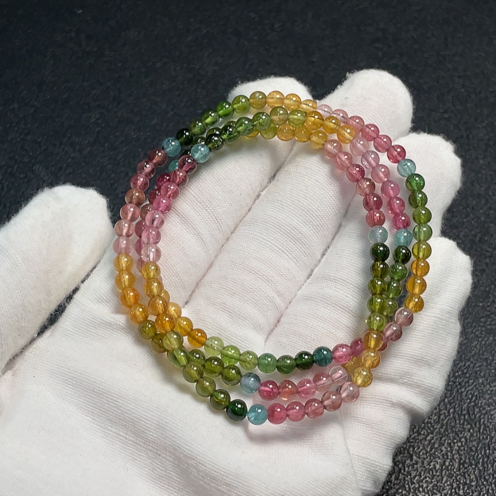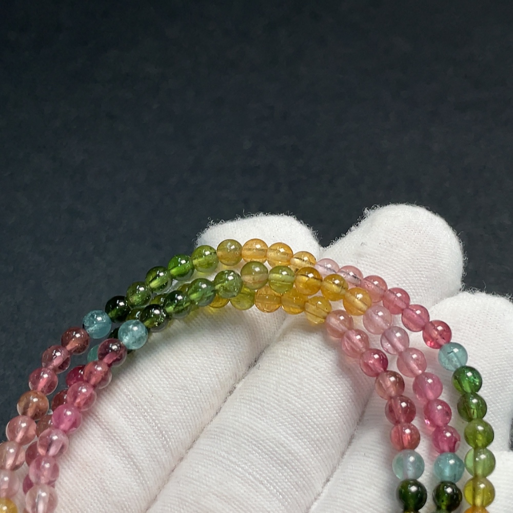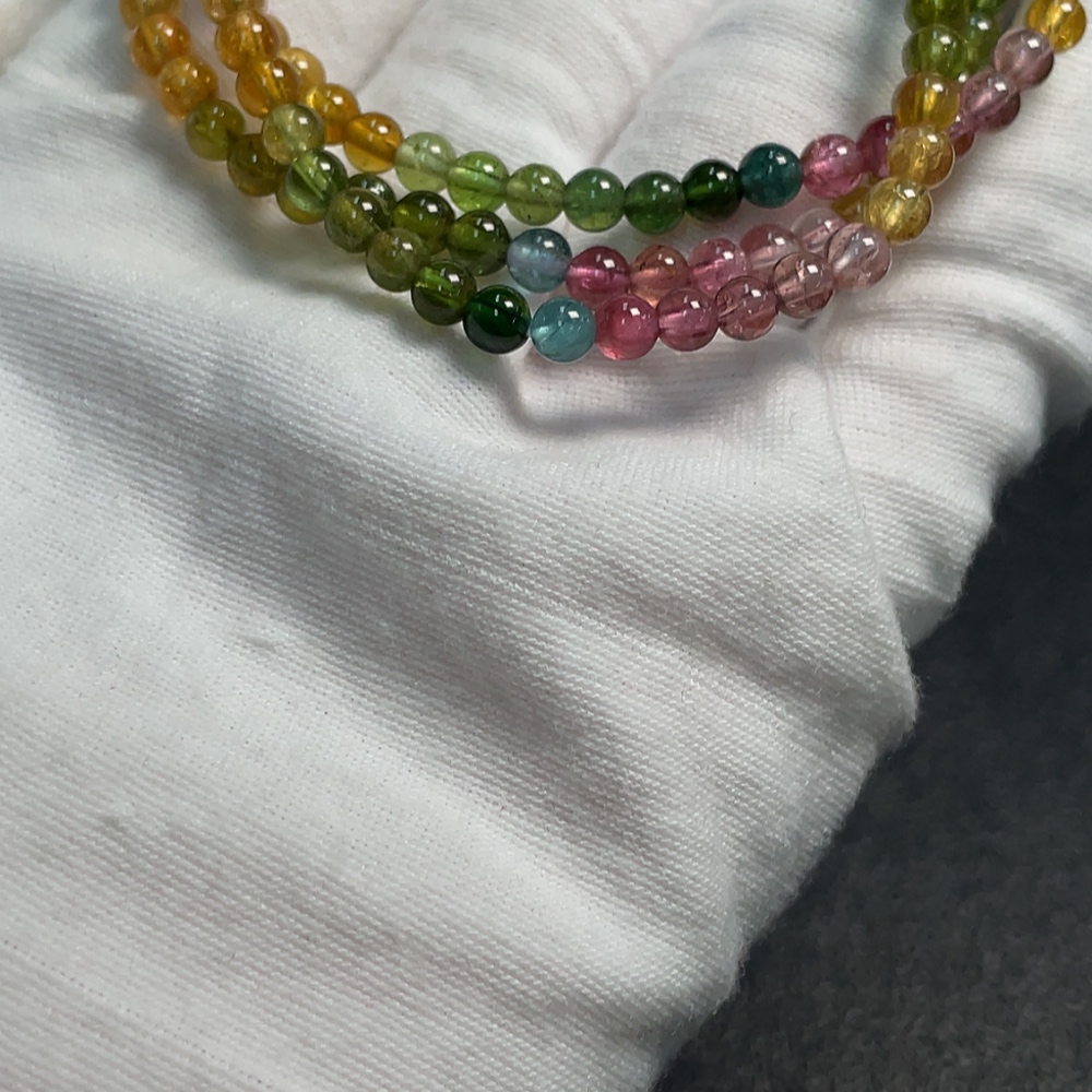 Tourmaline bead strand containing other mineral components with visible organic matter, total weight approximately 14.43g, size about 3.9mm