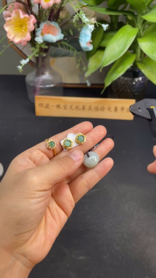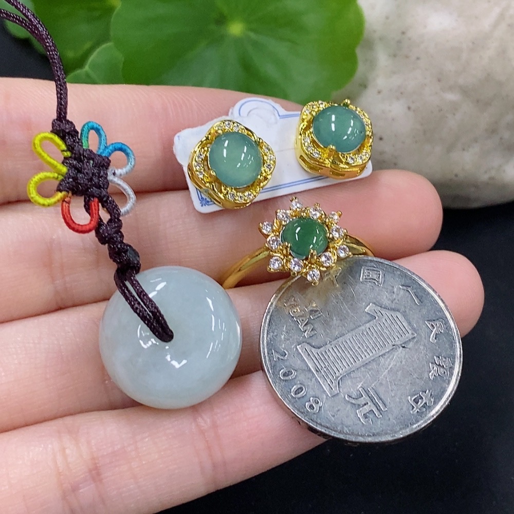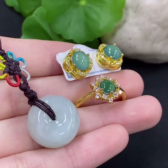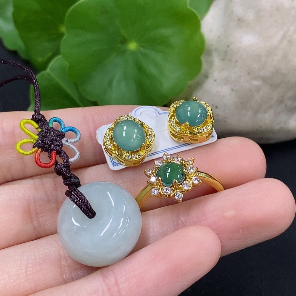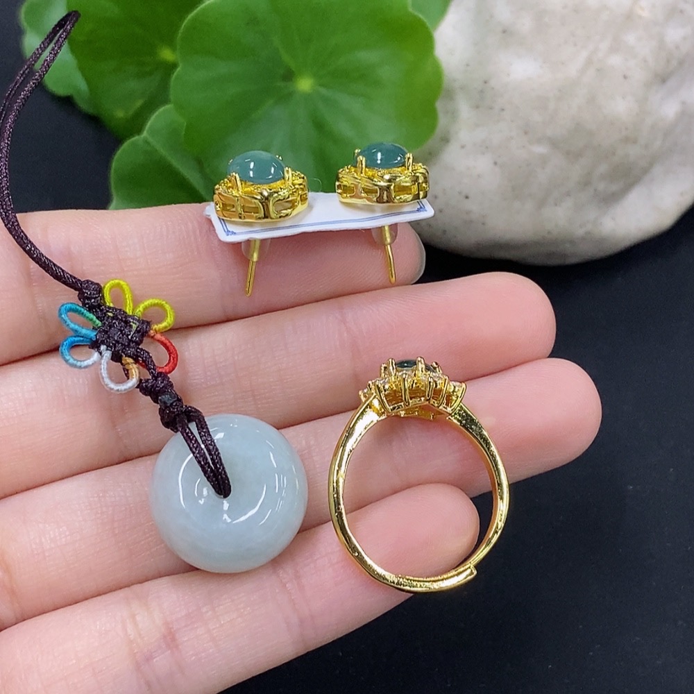 Jadeite Cabochon Earrings/Ping An Kou Pendant/Adjustable Ring Non-Gold Inlaid