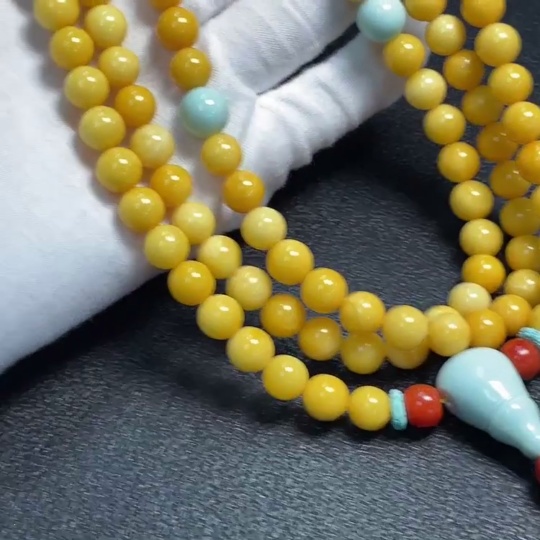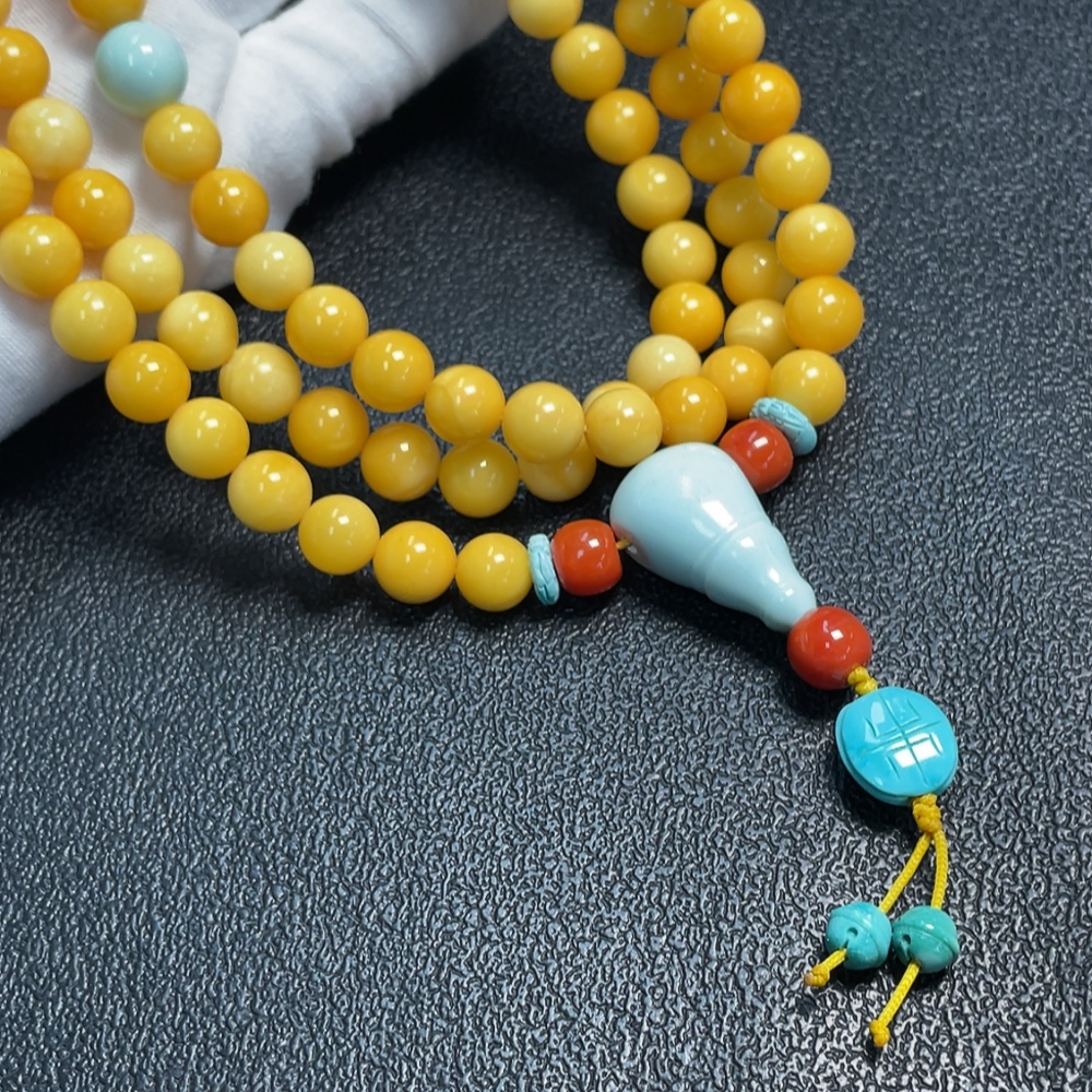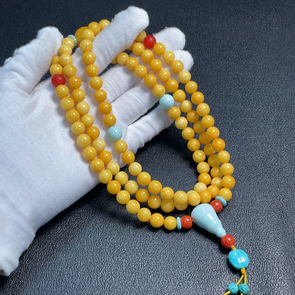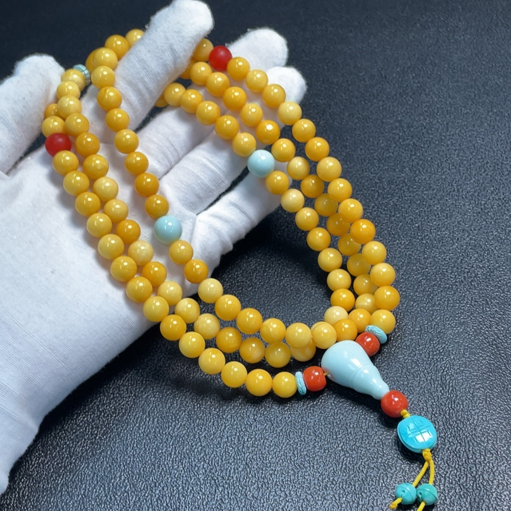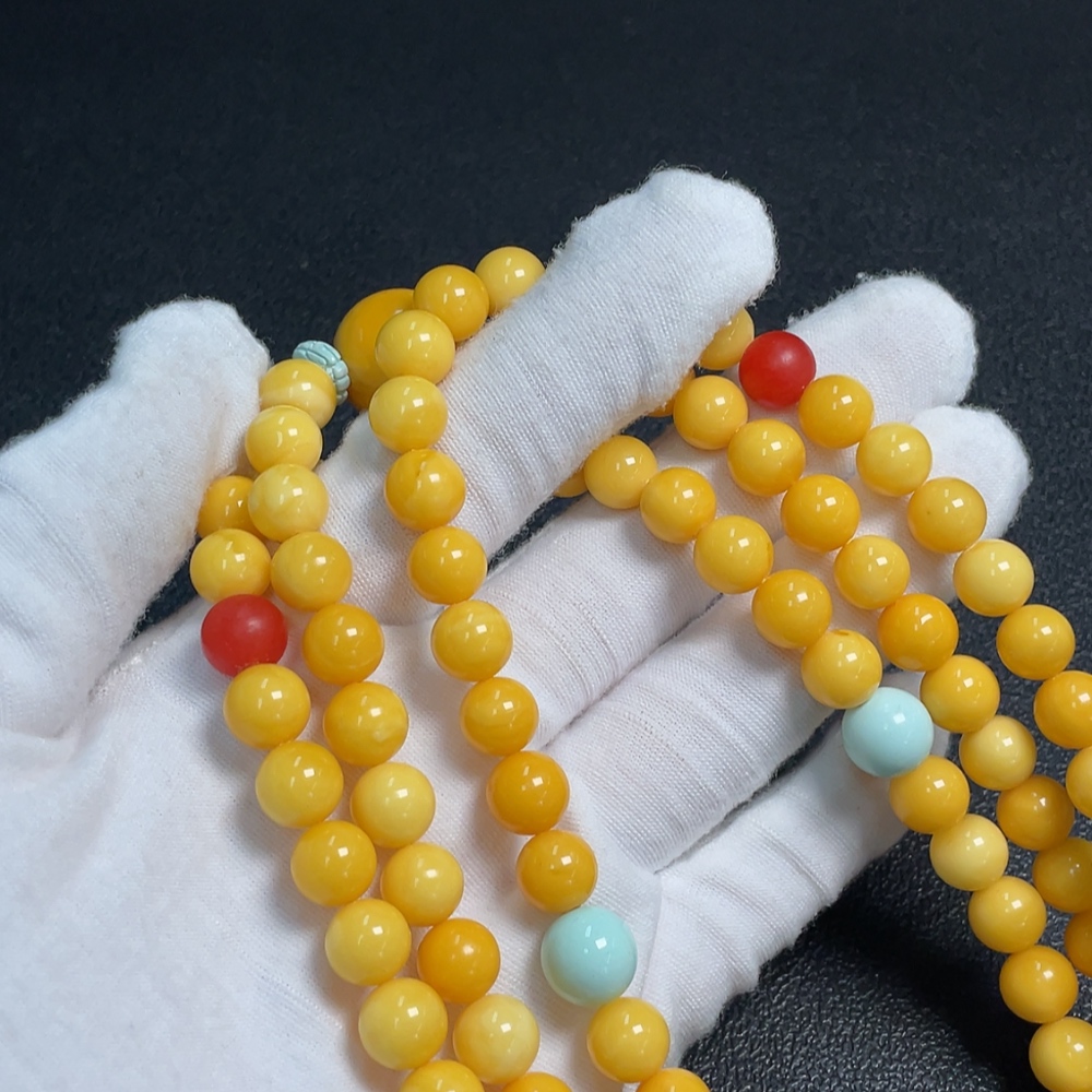 Amber and beeswax bead strand with turquoise accents (non-natural stones considered), total weight approx. 56.79g, size range 8.6-16.1mm