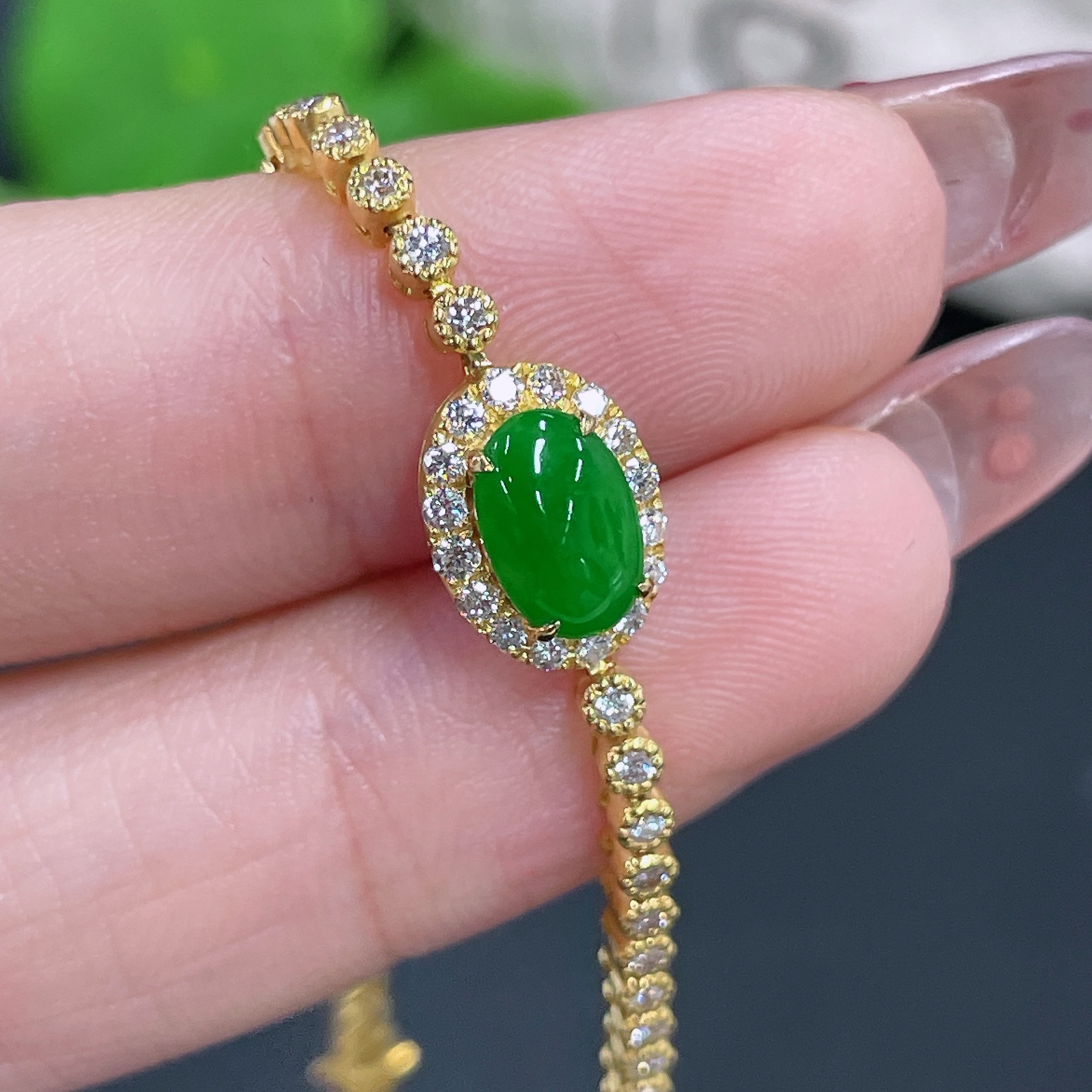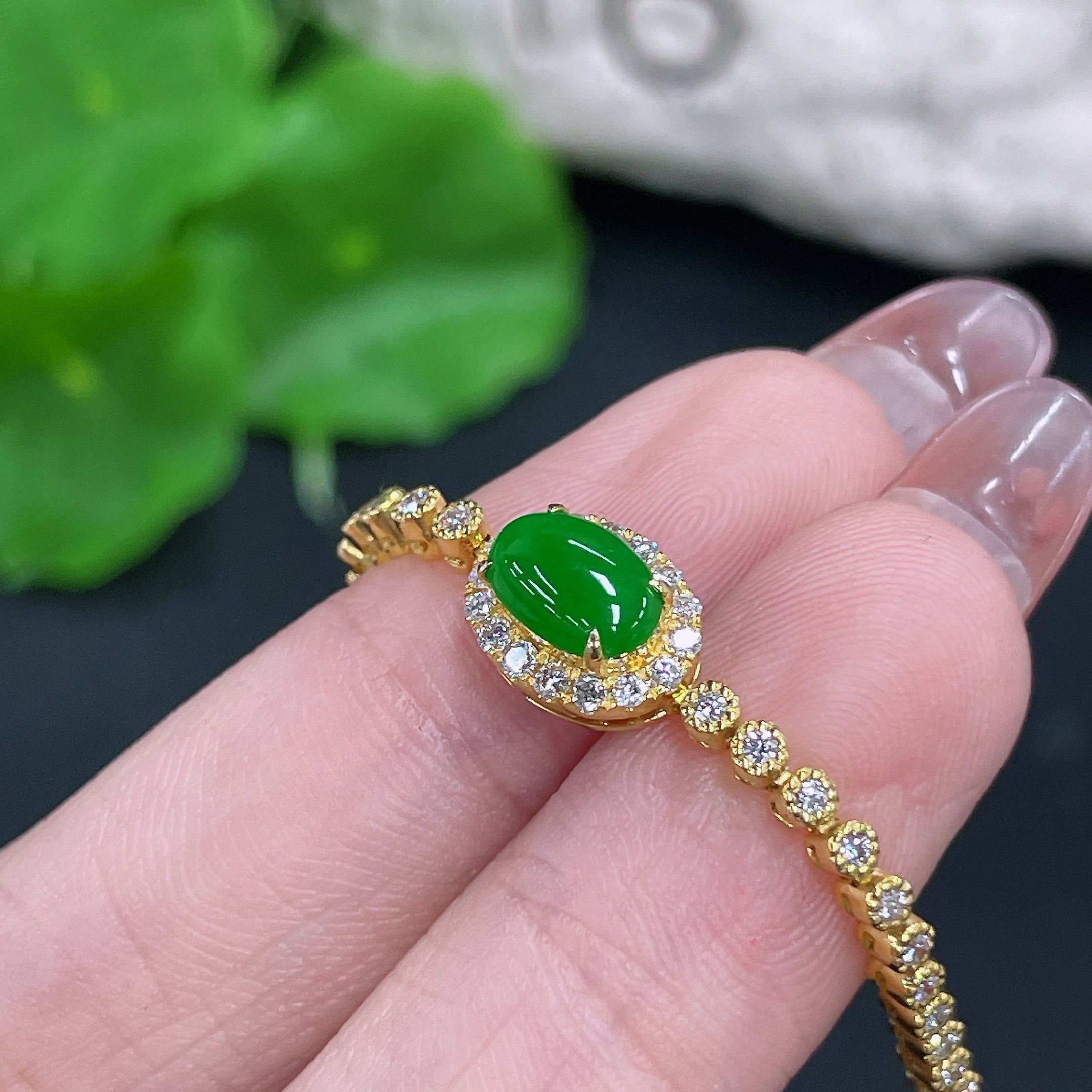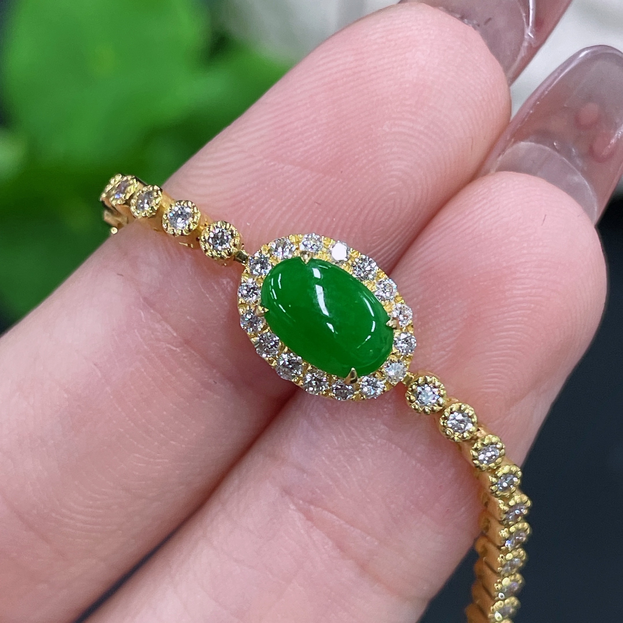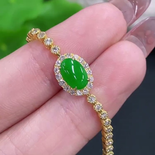 Jadeite Cabochon Inlaid Bracelet 18k with Diamond Accents Total Weight Approx. 7.66g