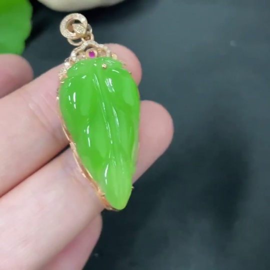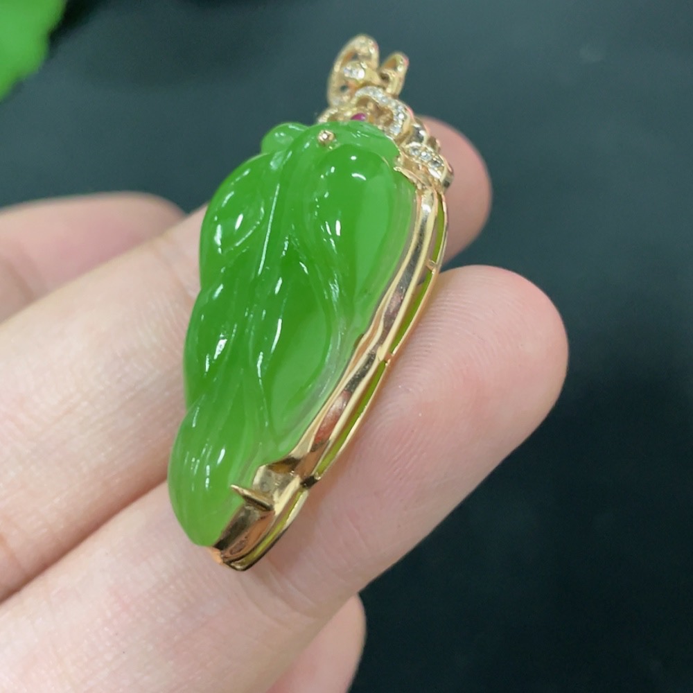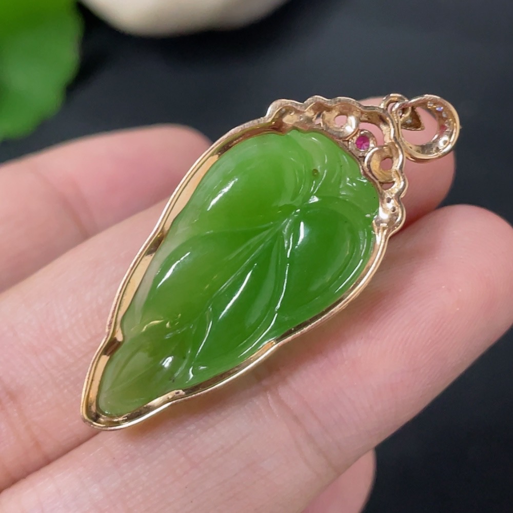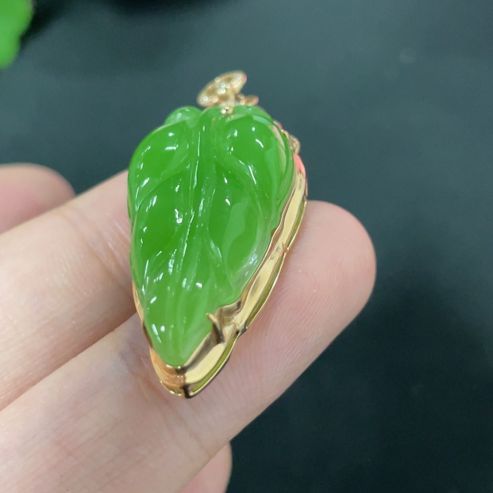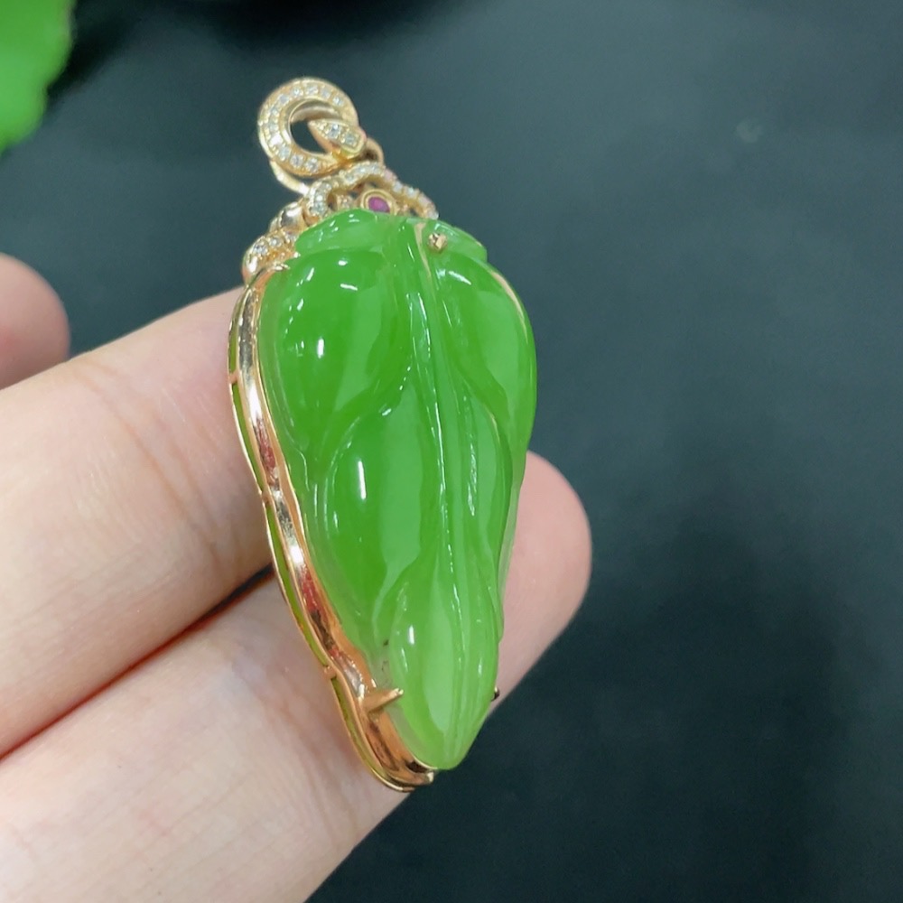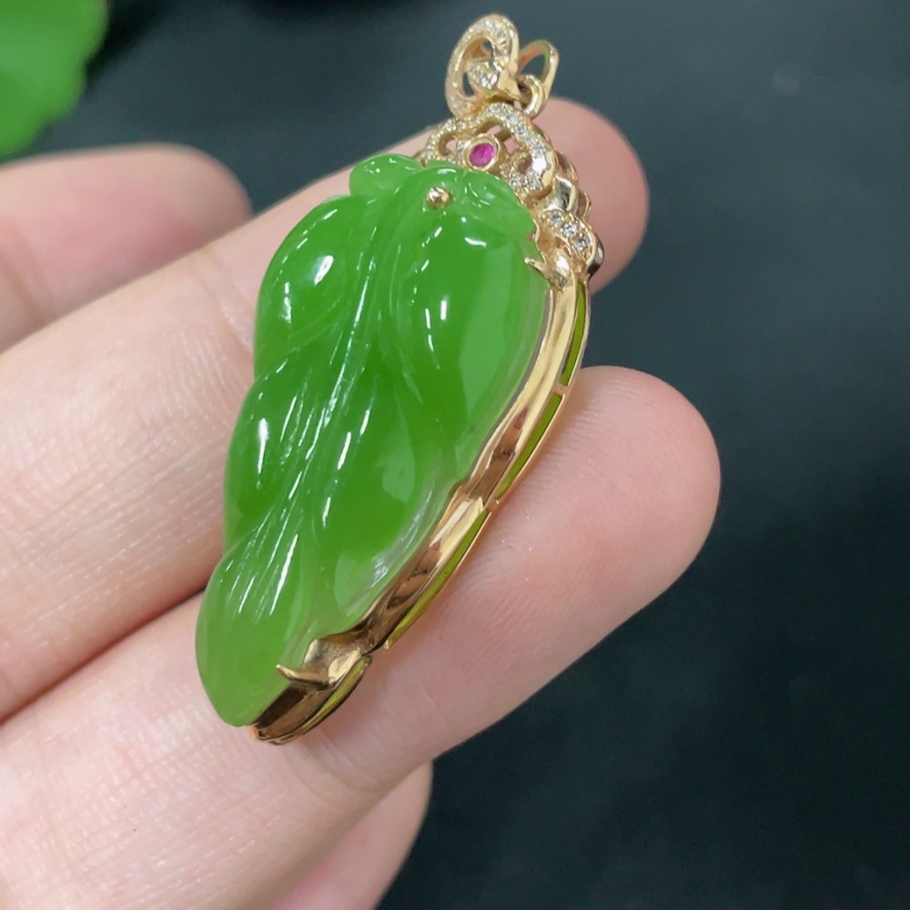 Hetian Jade Jasper Inlaid Pendant Leaf with Diamond (Colorless) 18K Gold Total Weight Approx. 4.5g
