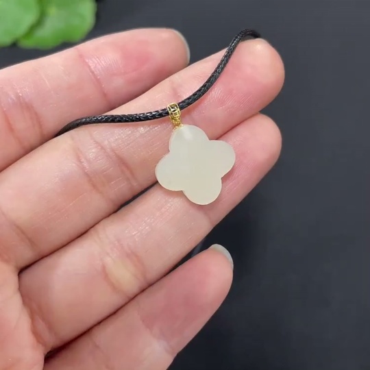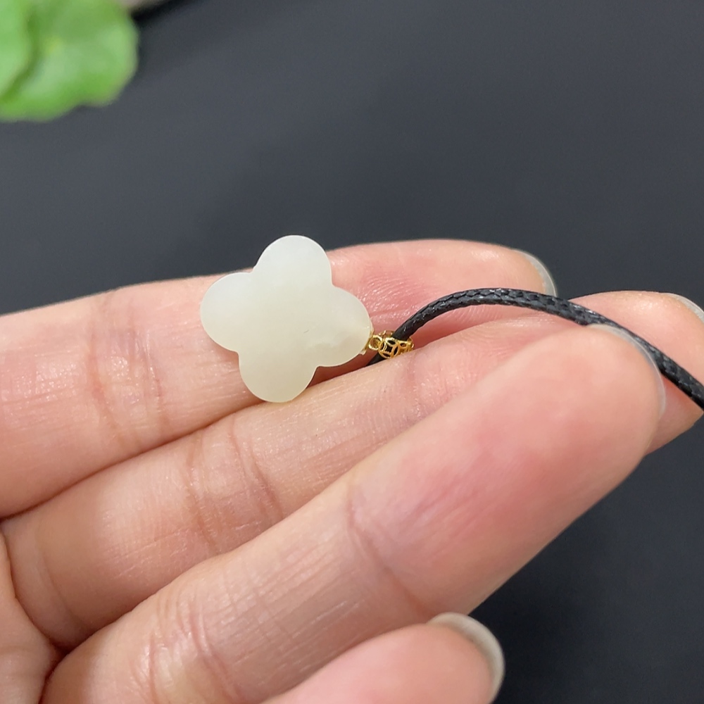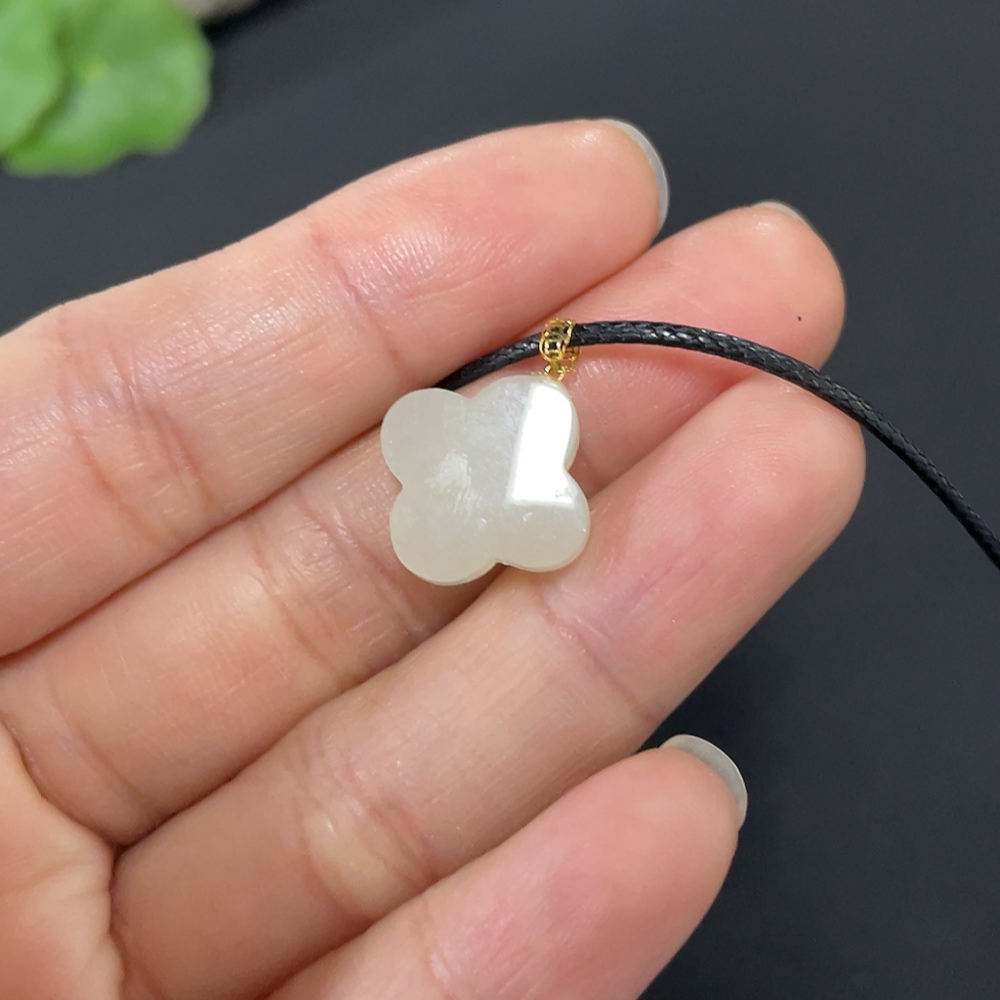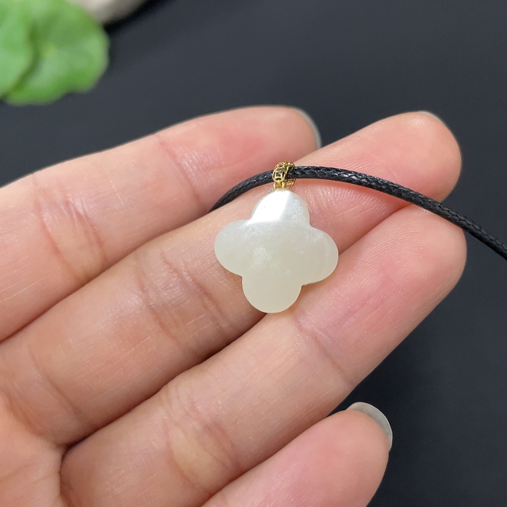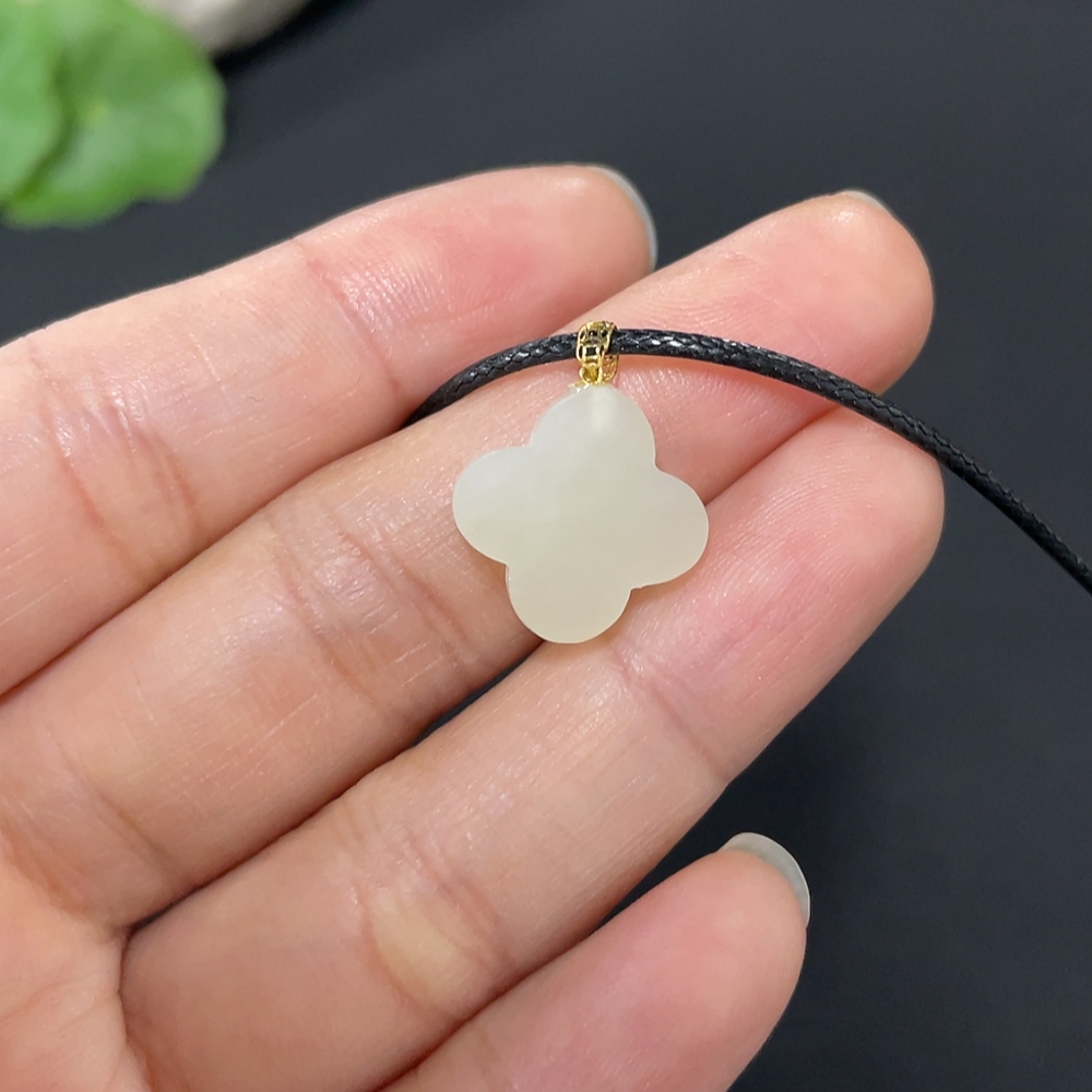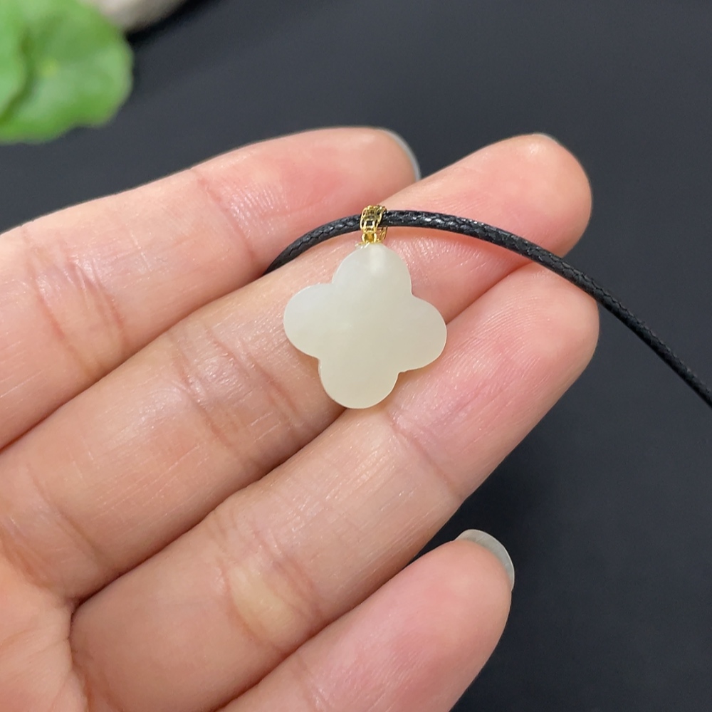 Hetian Jade Pendant Four-Leaf Clover with 18K Gold Clasp Total Weight Approx. 1.9g (including cord)