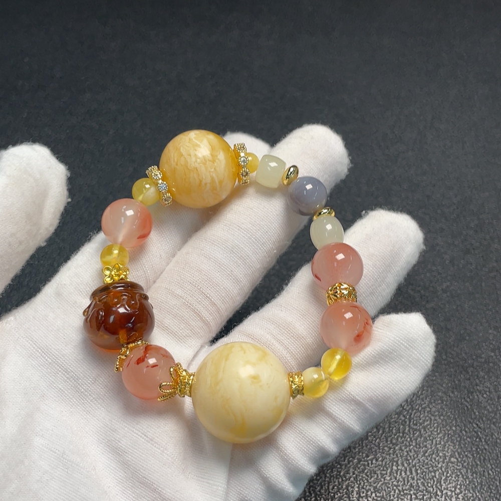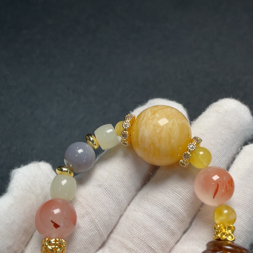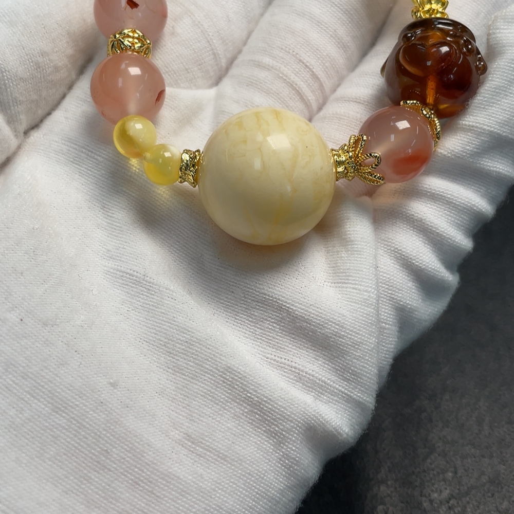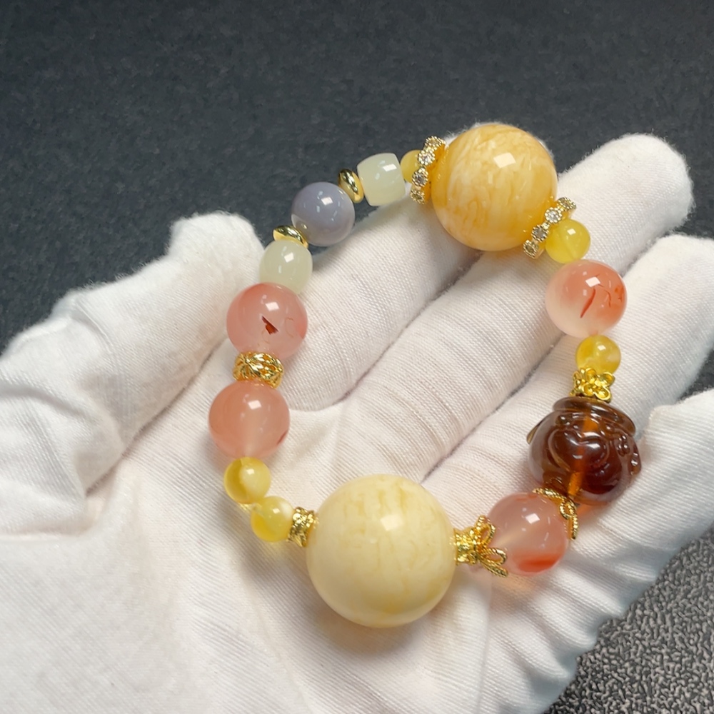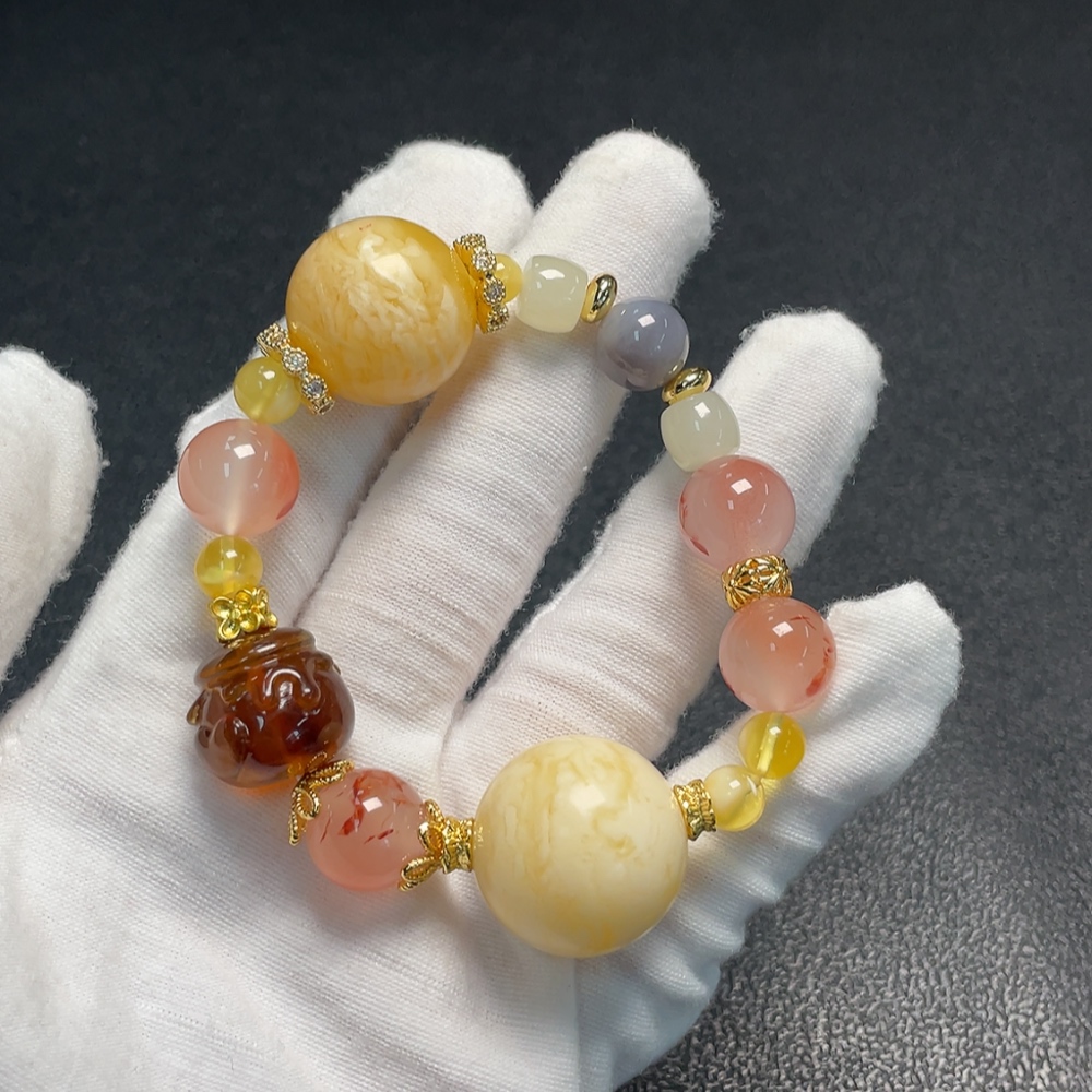 Amber Beeswax Bracelet with Southern Red Agate and Hetian Jade, Non-Gold, Total Weight Approx. 30.6g, Size 6.6-21.2mm