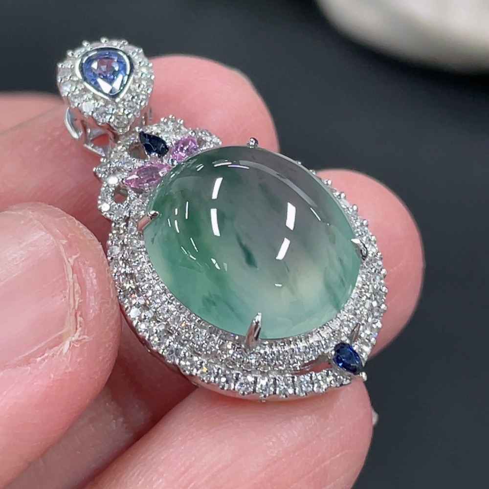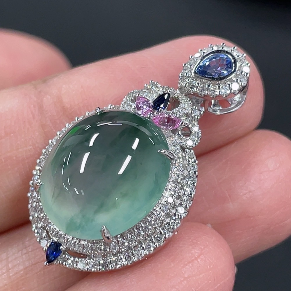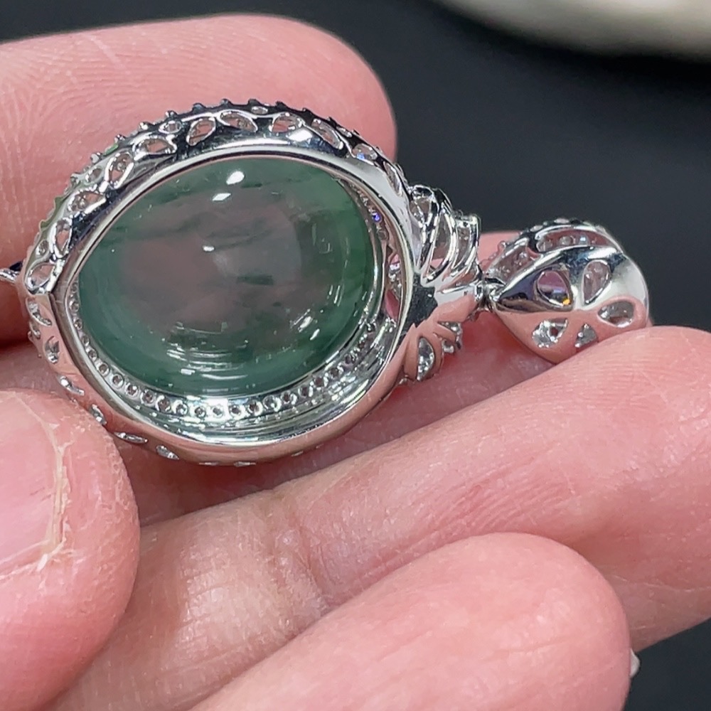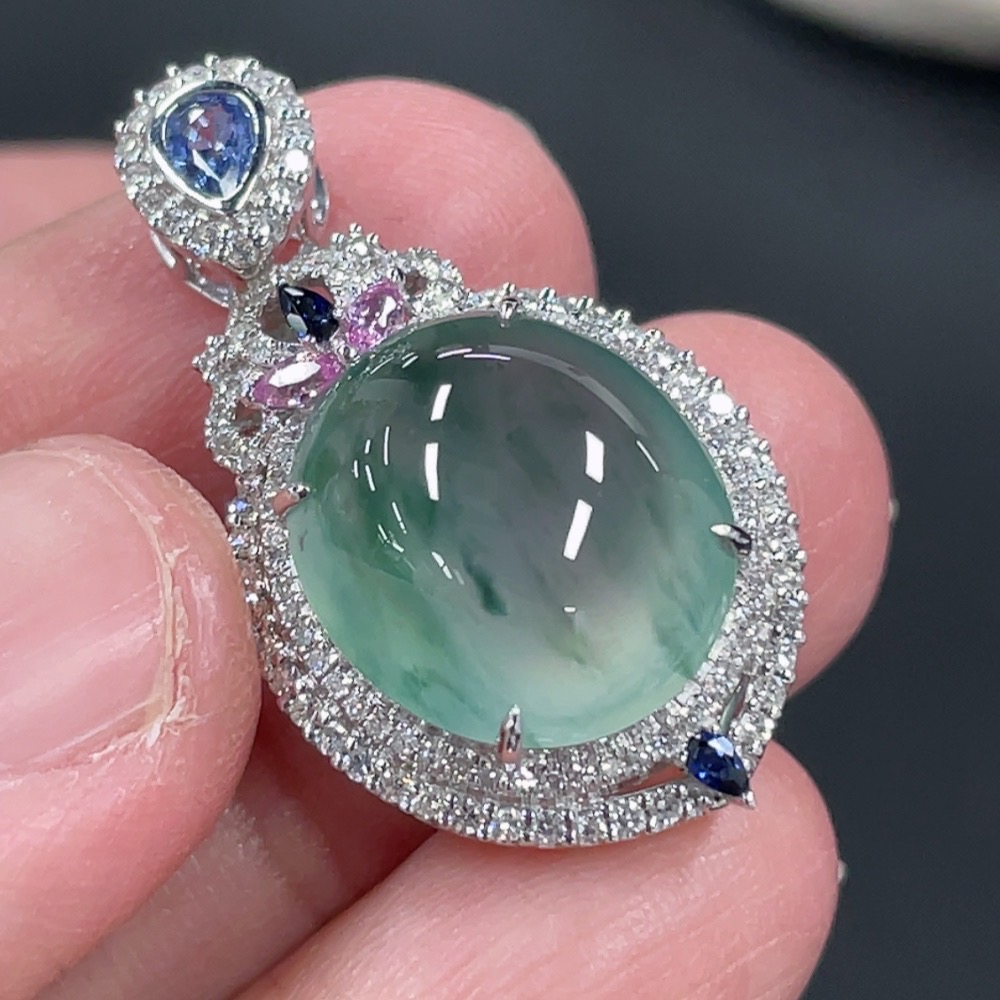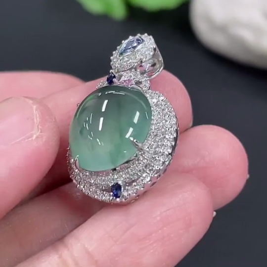 Jadeite Cabochon Pendant with 18K Gold Setting and Diamond Accents (Colorless), Total Weight Approximately 5.38g