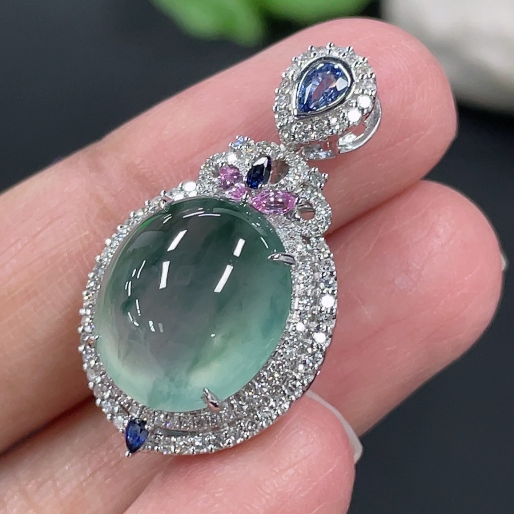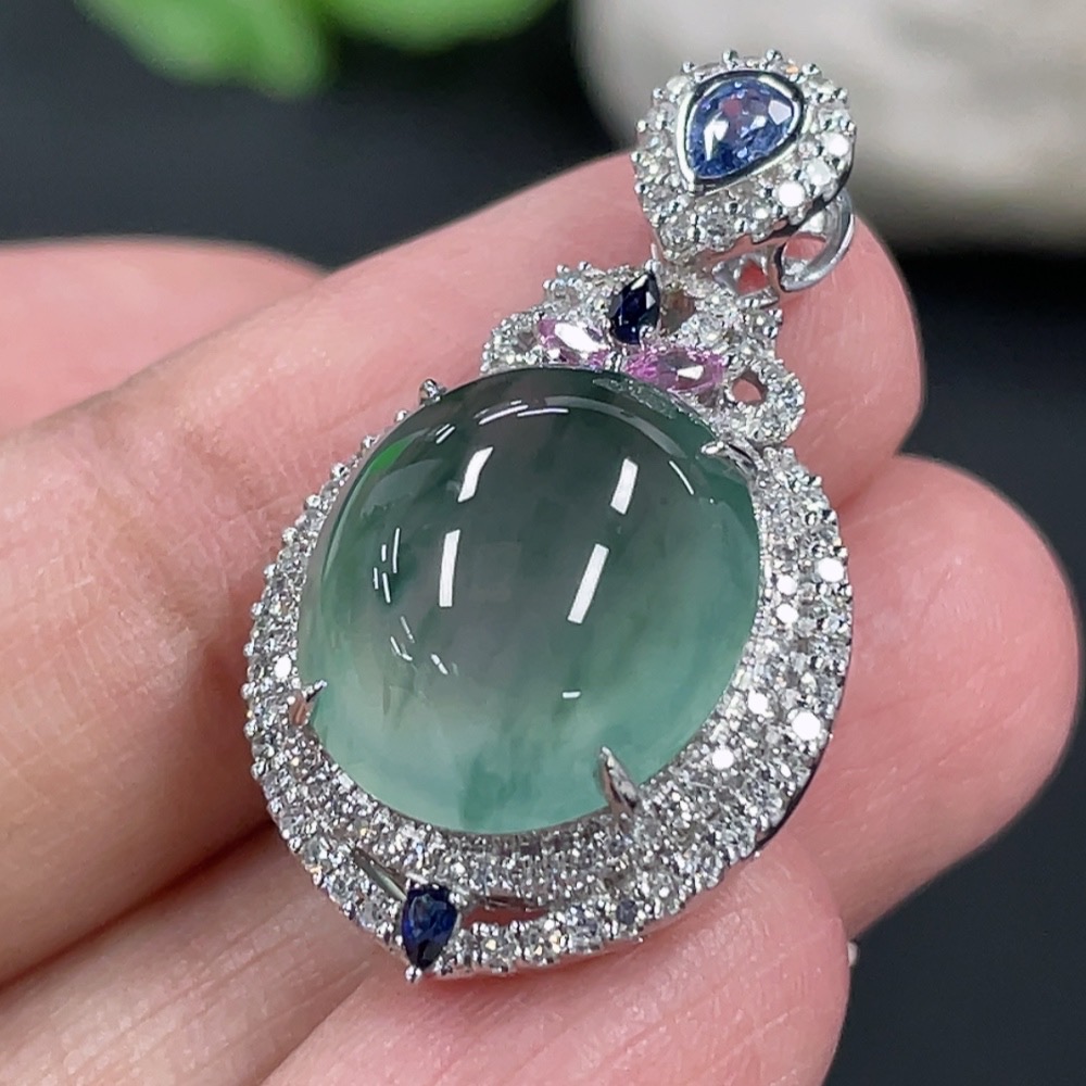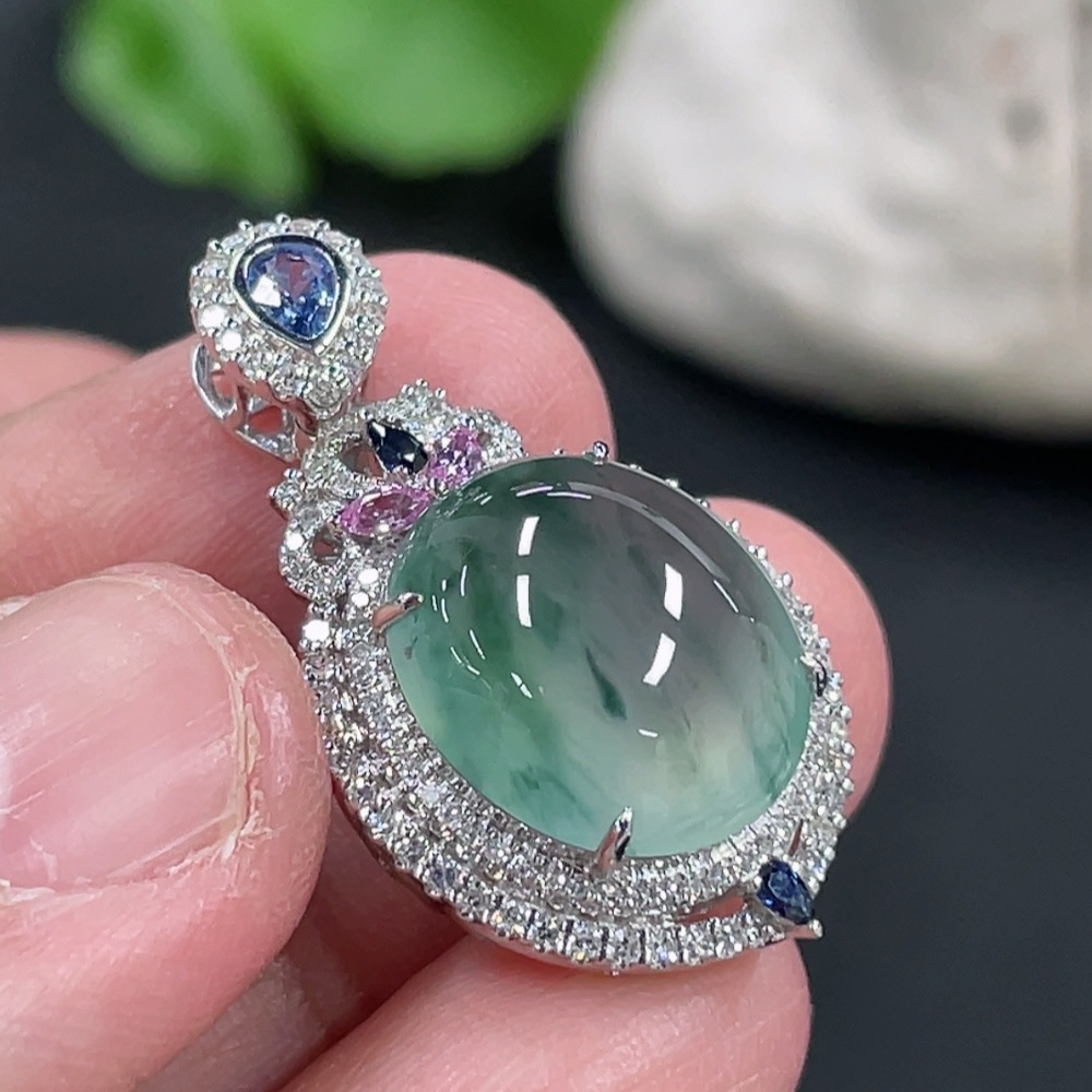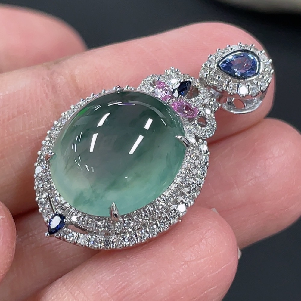 Jadeite Cabochon Pendant with 18K Gold Setting and Diamond Accents (Colorless), Total Weight Approximately 5.38g