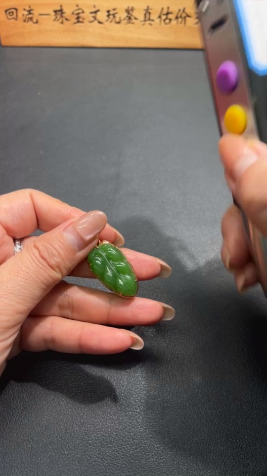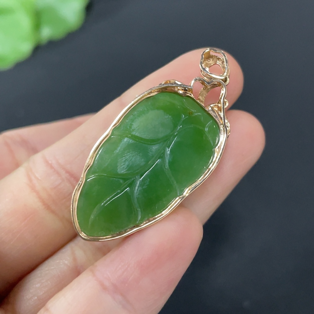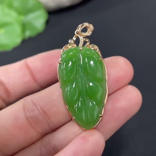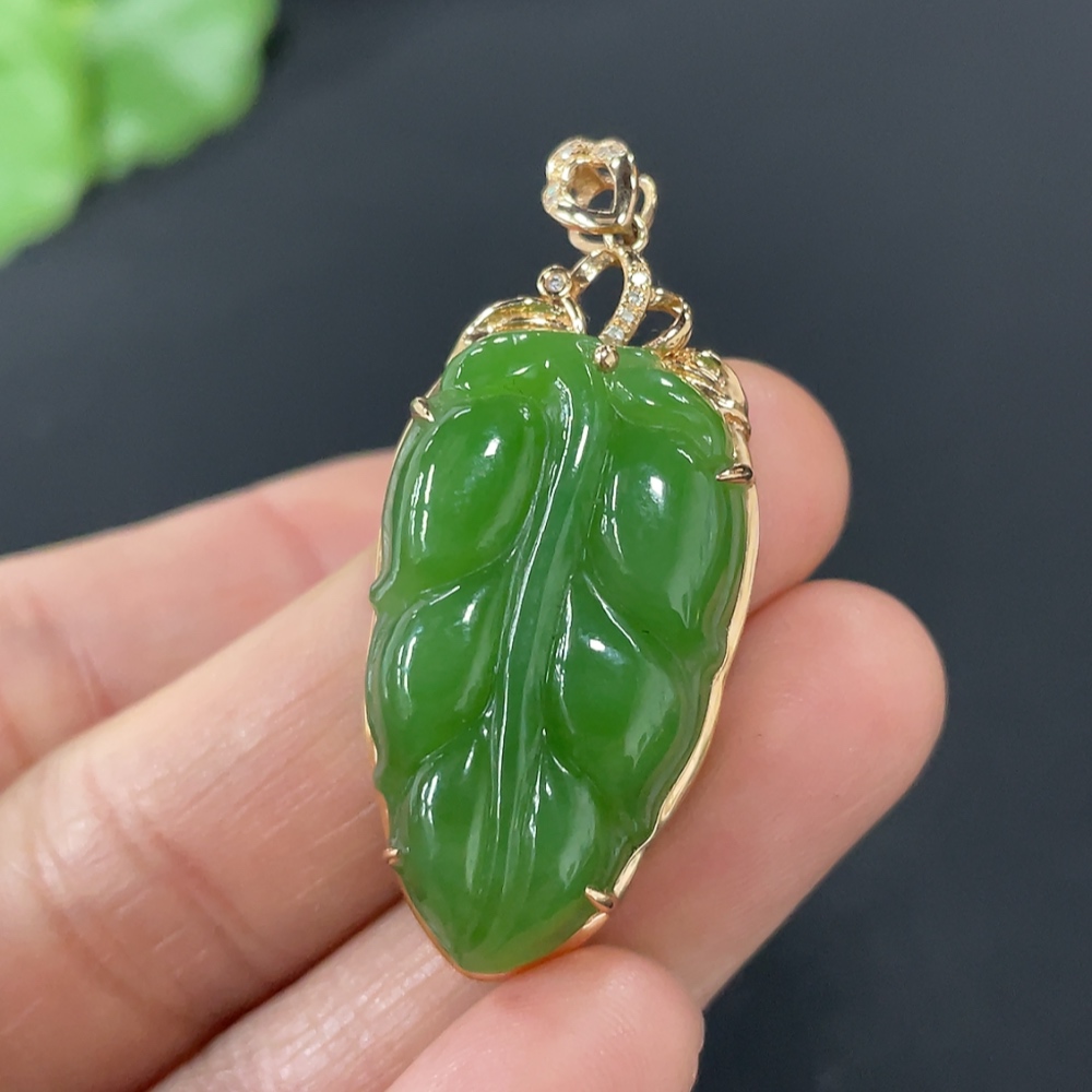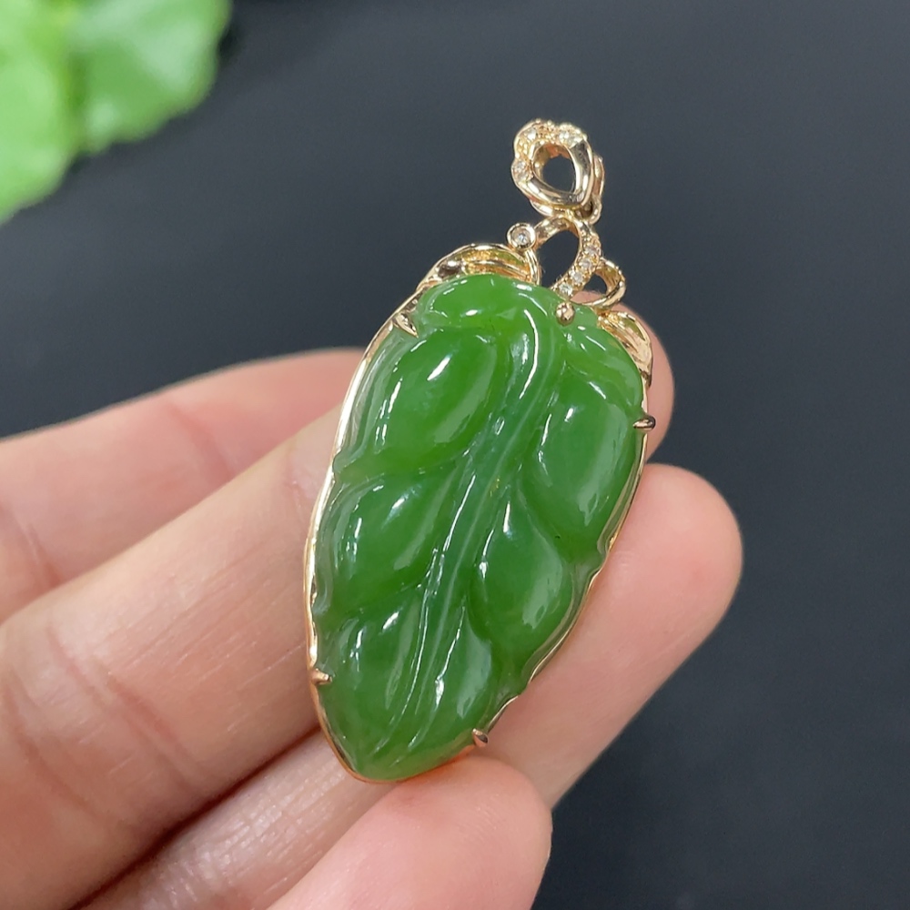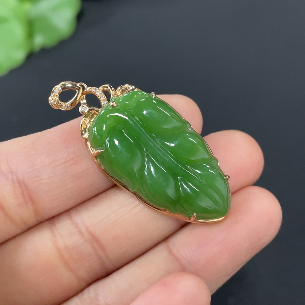 Hetian Jade Jasper Inlaid Leaf 18K Gold Total Weight Approx. 5g Diamond Accents