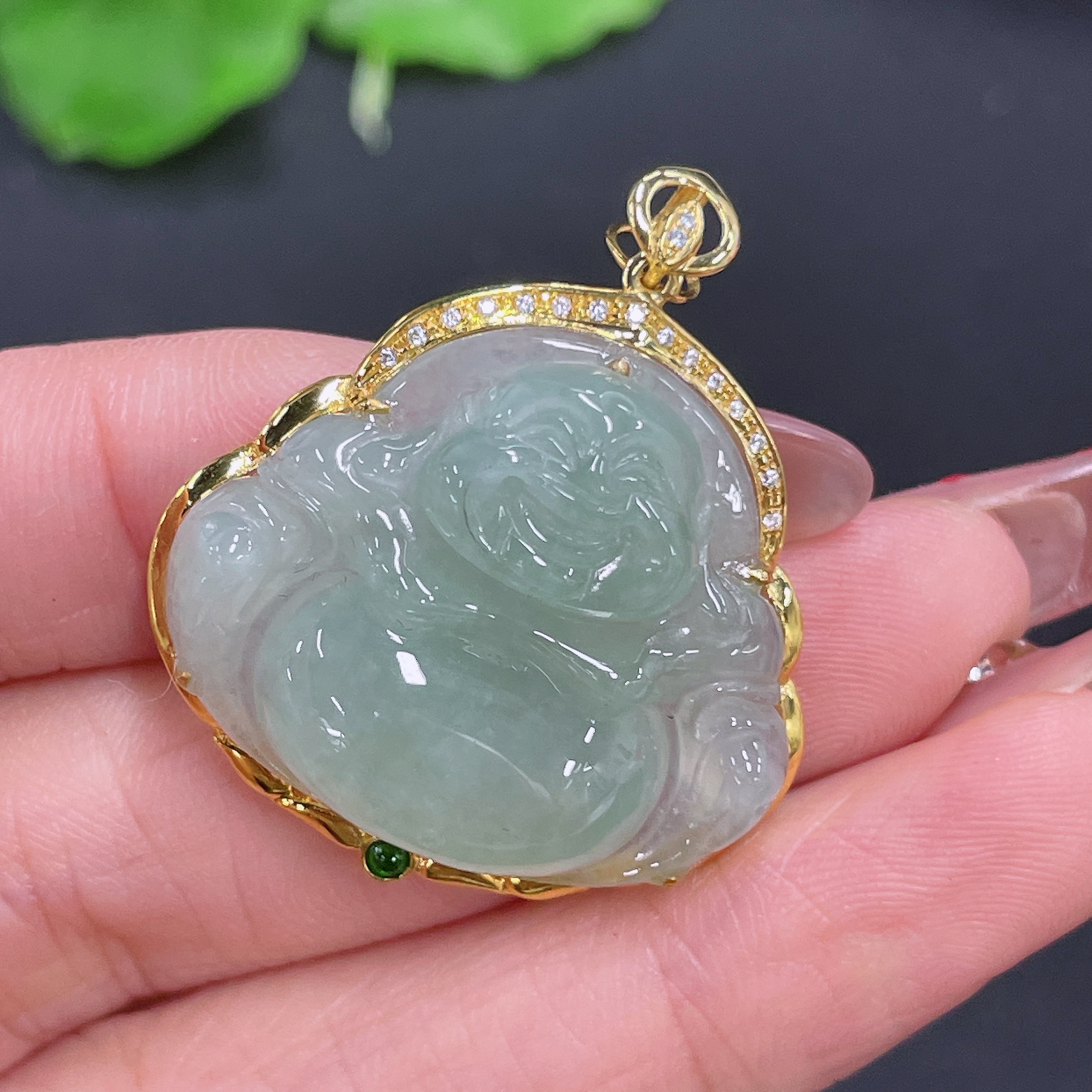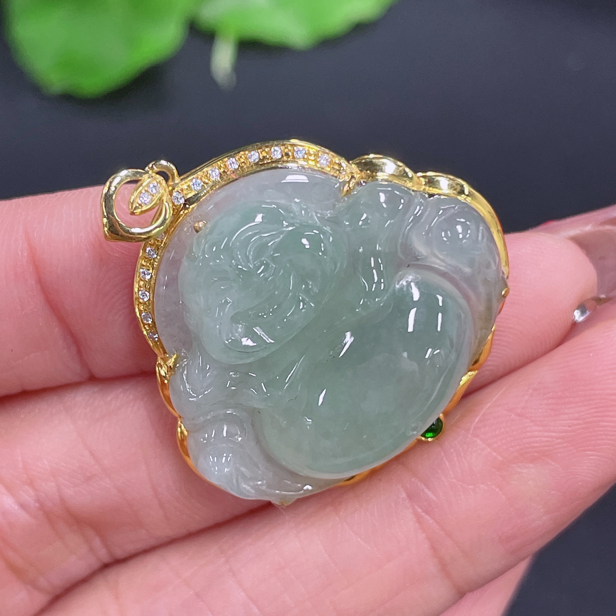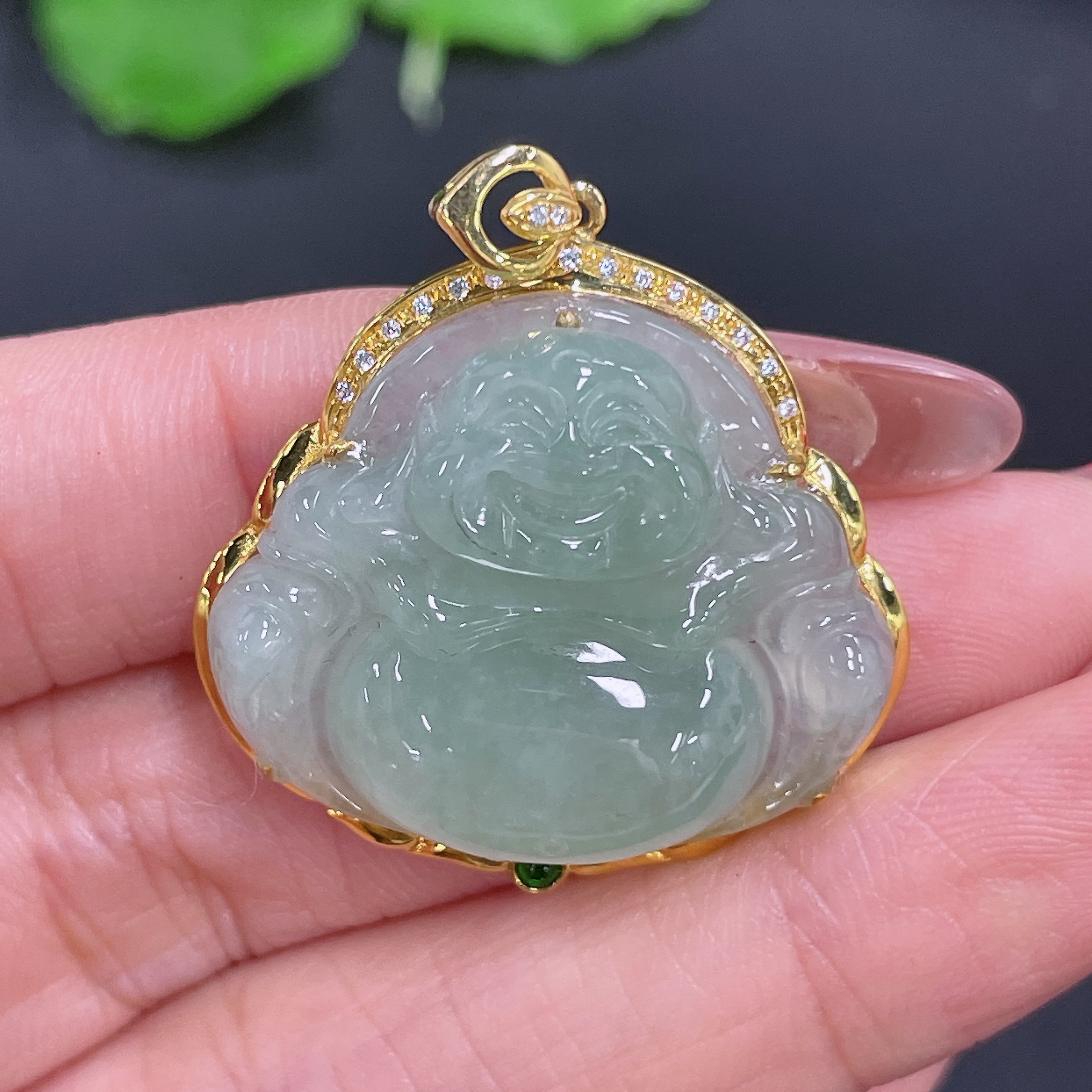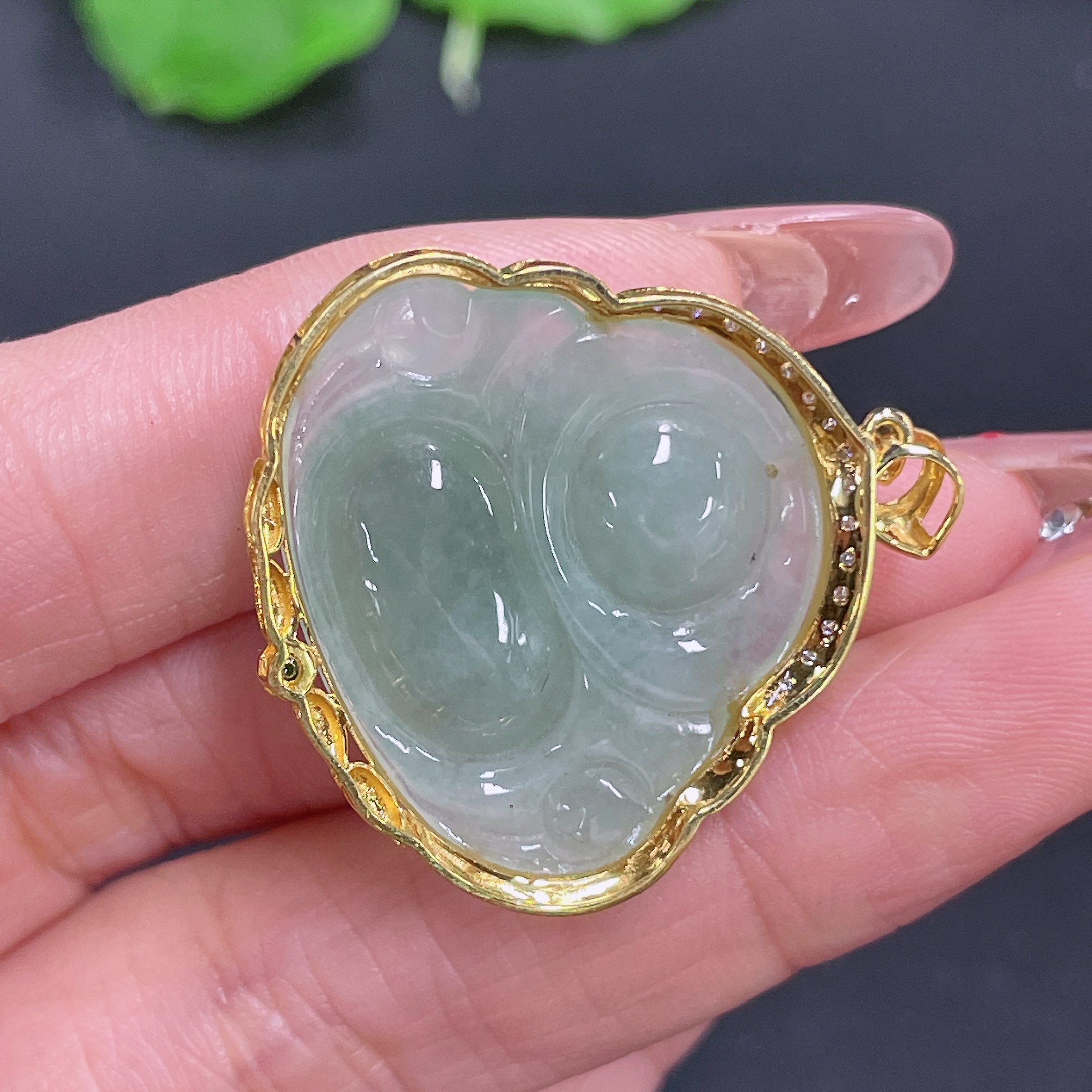 Jadeite Pendant Buddha 18k Gold Inlaid Non-Diamond Total Weight Approx. 6.8g