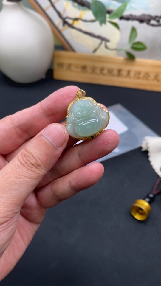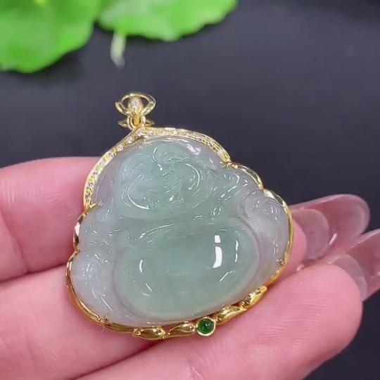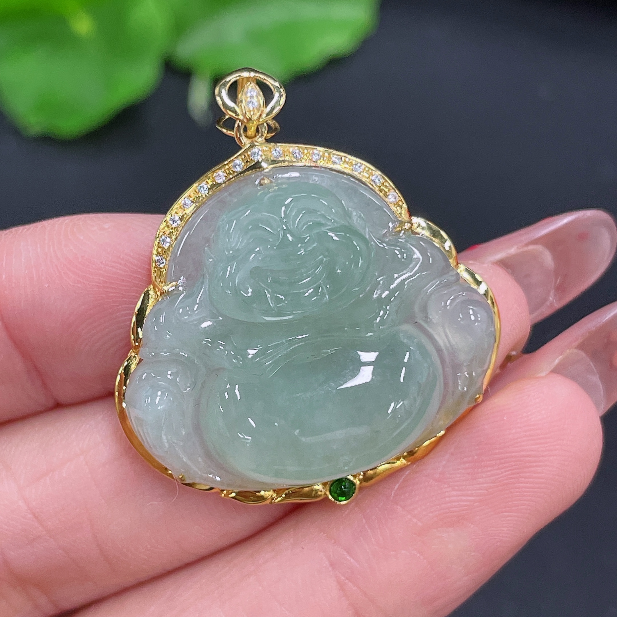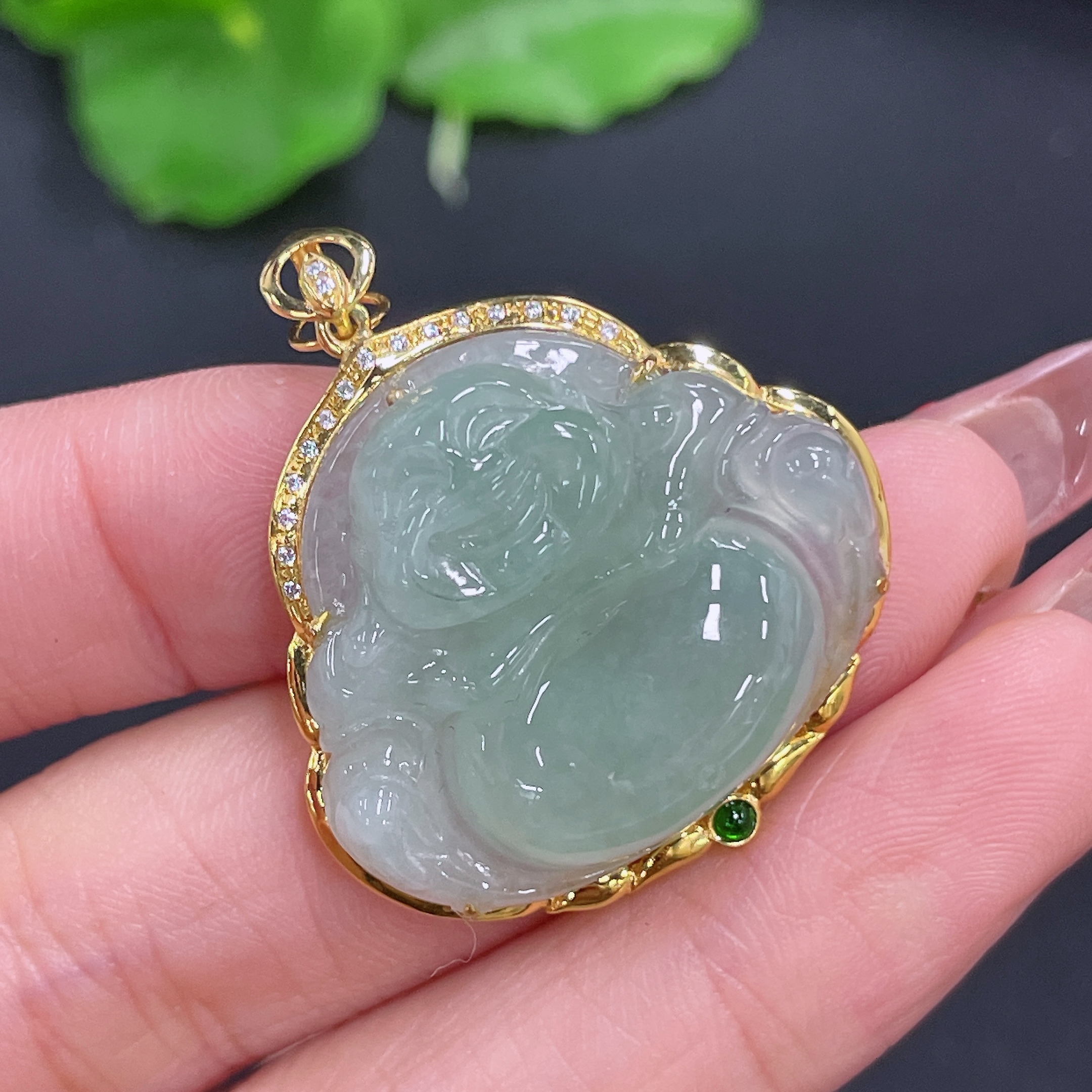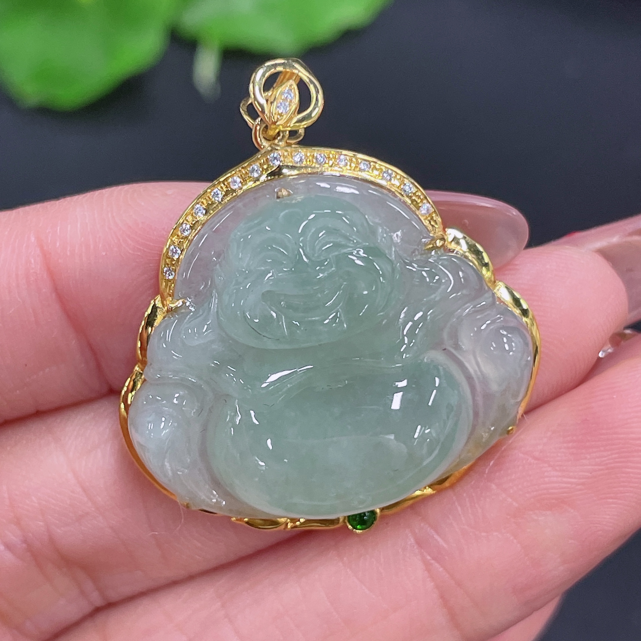 Jadeite Pendant Buddha 18k Gold Inlaid Non-Diamond Total Weight Approx. 6.8g