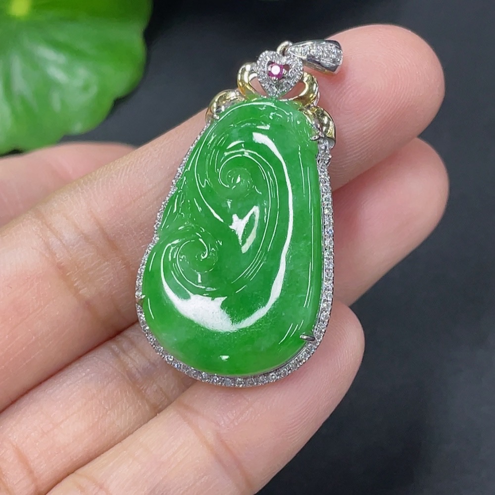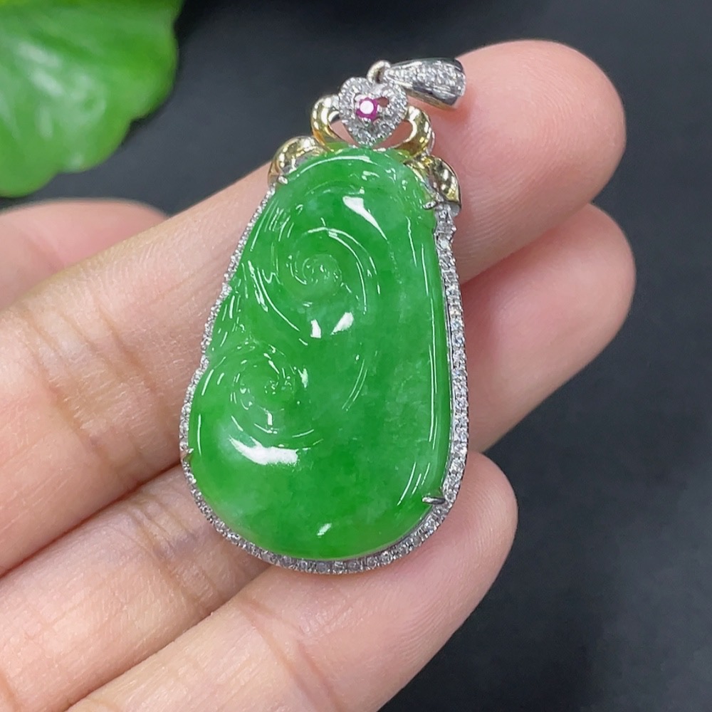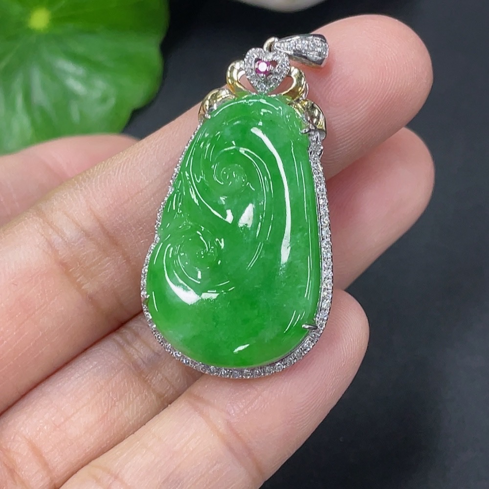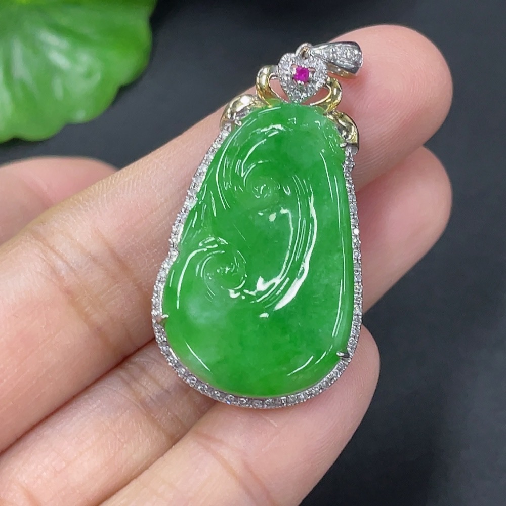 Jadeite Inlaid Ruyi Pendant 18k Set with Diamonds (Colorless) Total Weight Approx. 5.23g