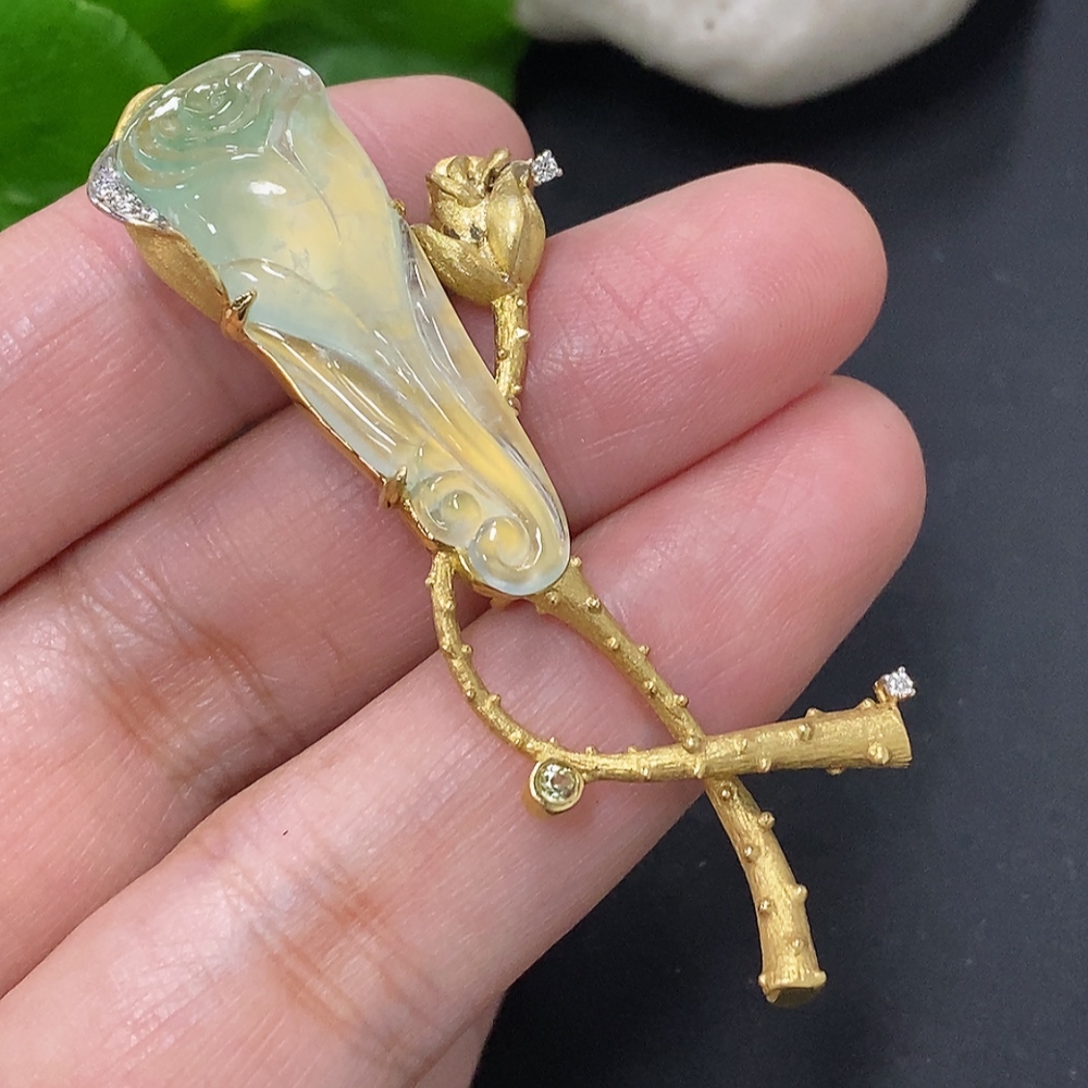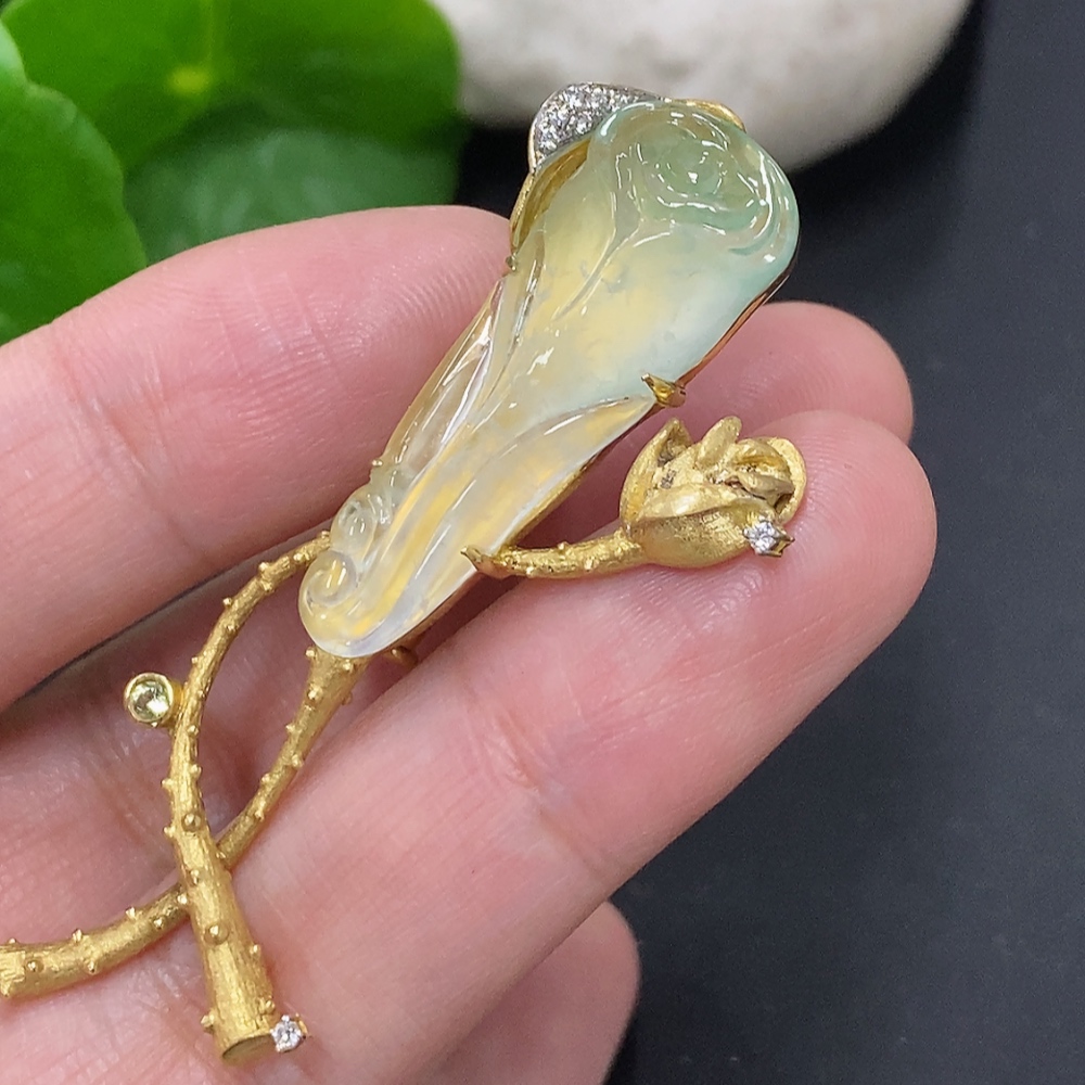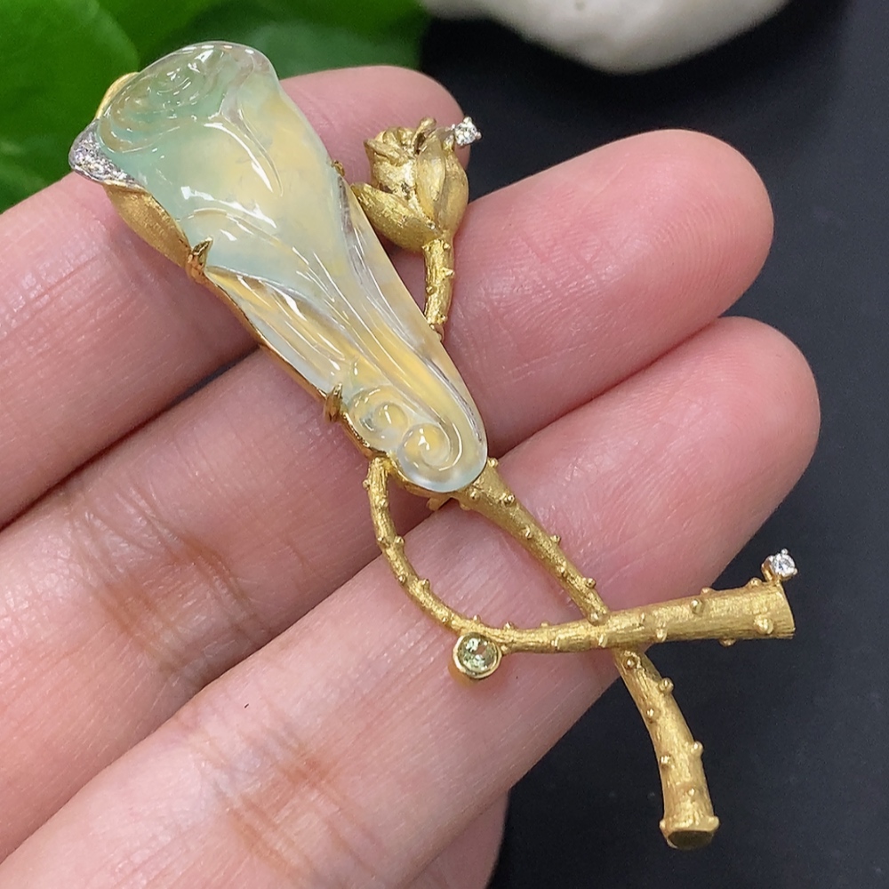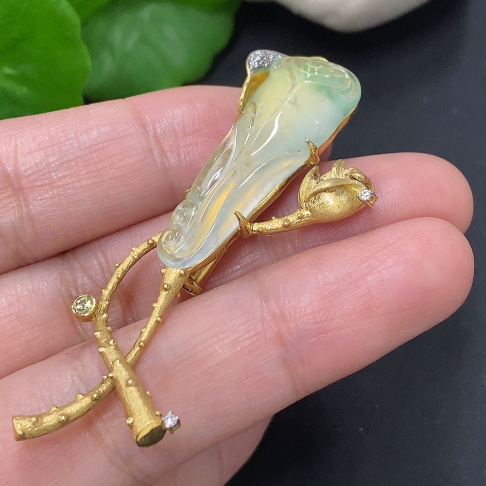 Jadeite inlaid brooch 18K gold total weight approx. 12.1g (colorless accent stones are diamonds)