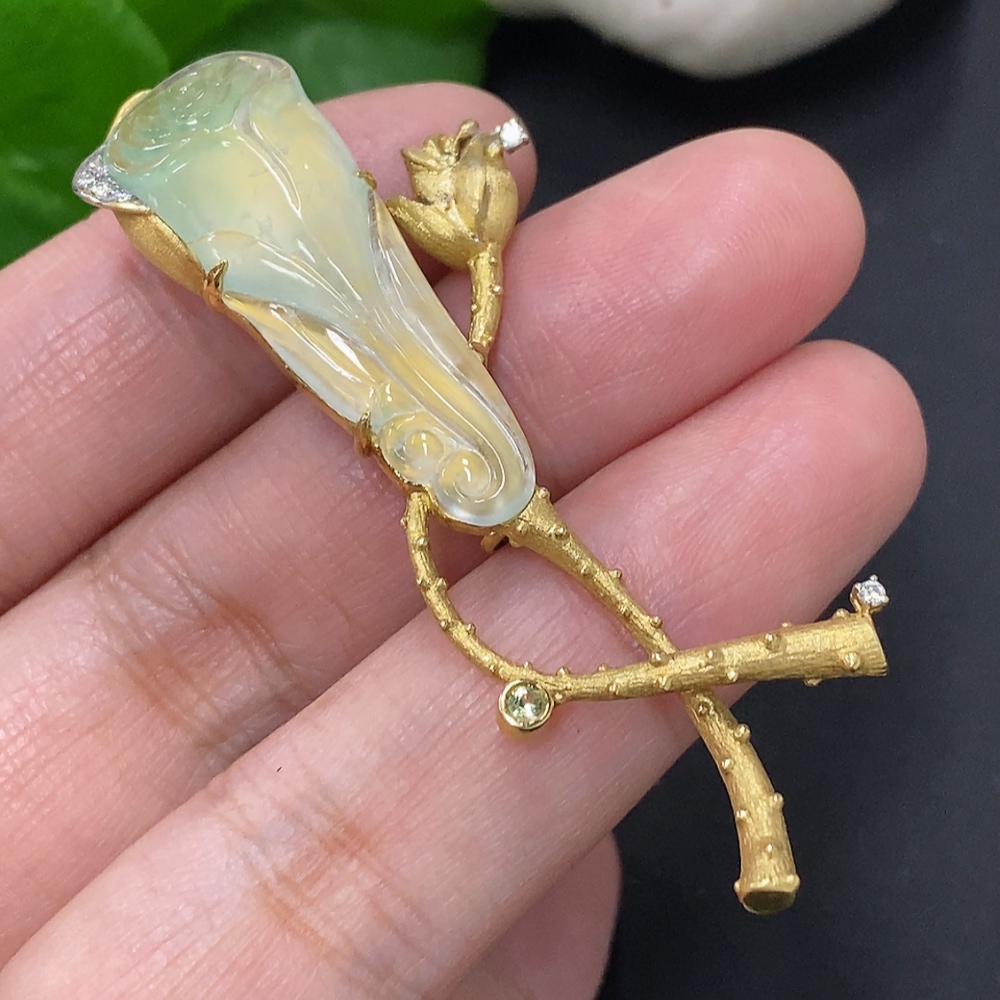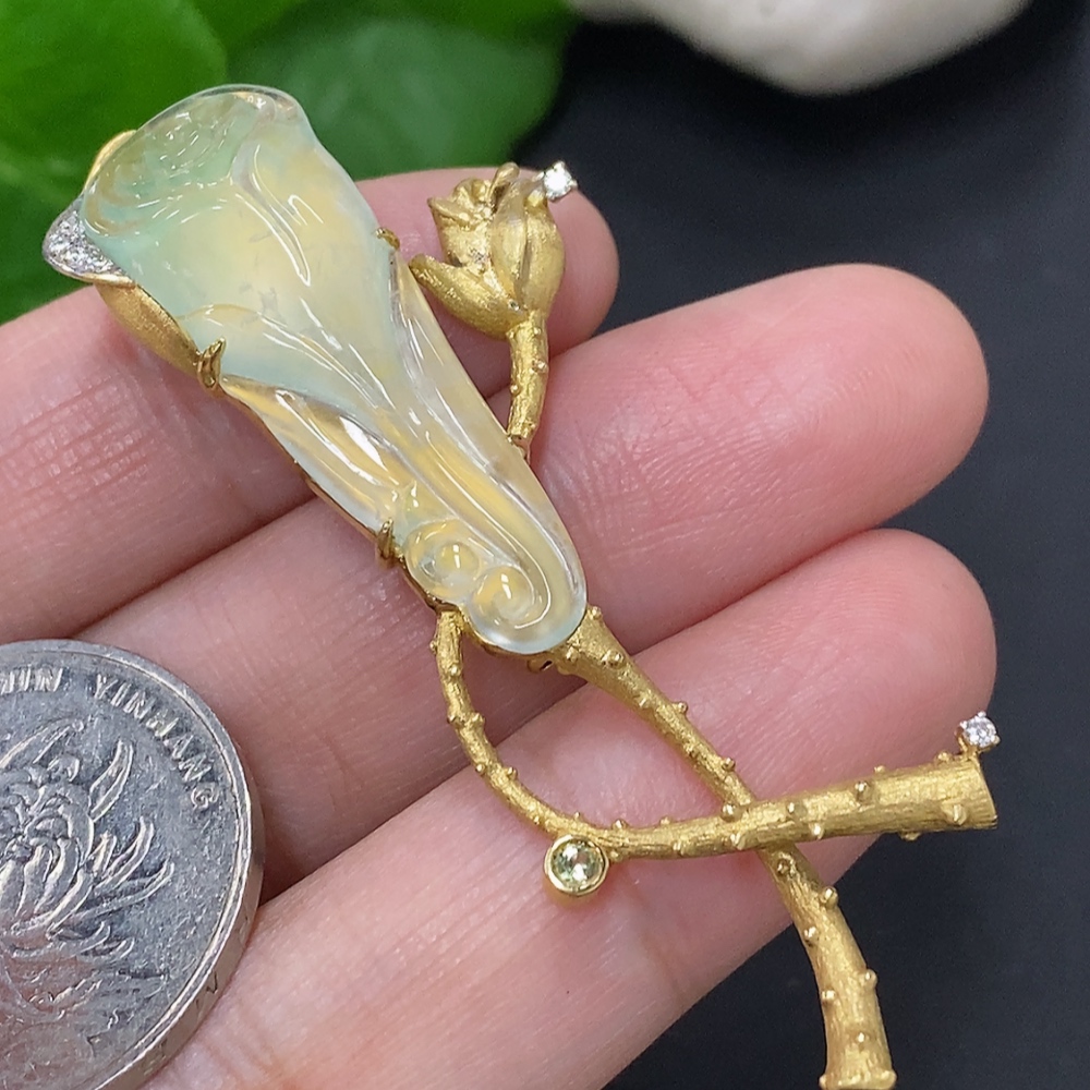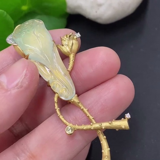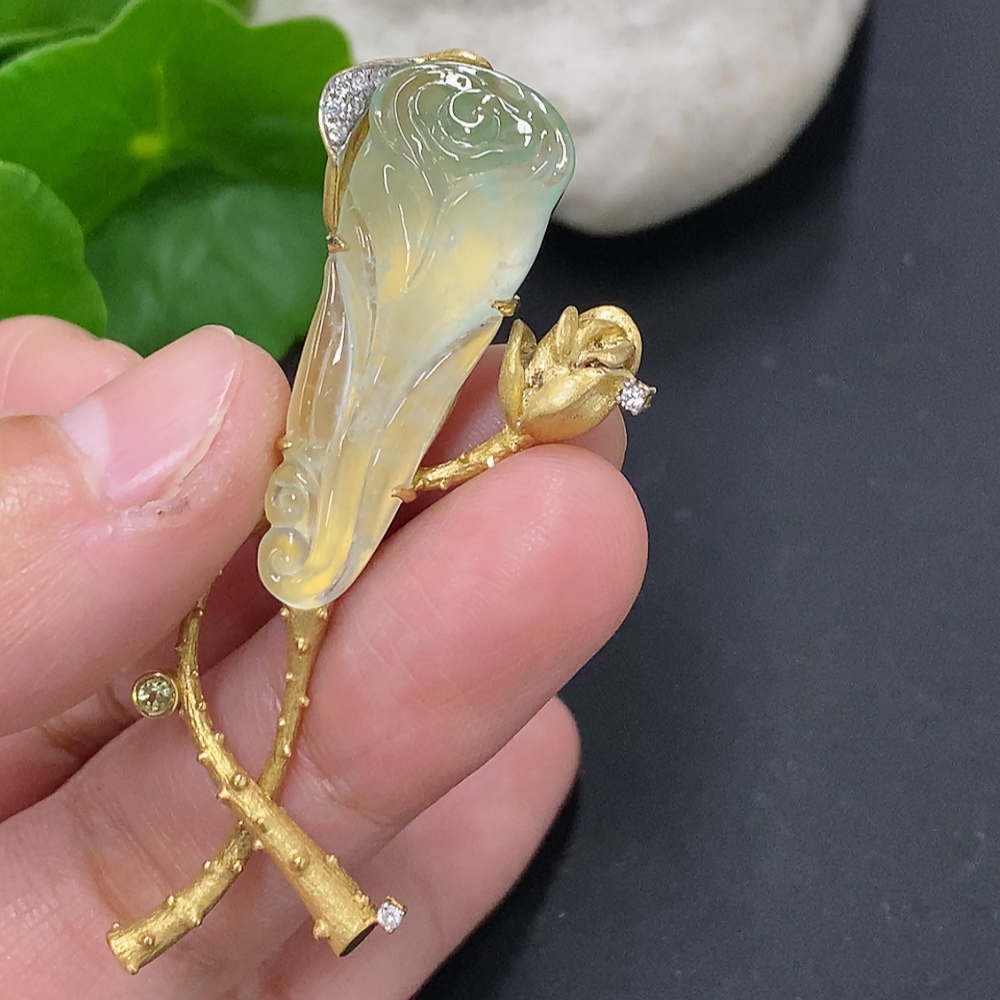 Jadeite inlaid brooch 18K gold total weight approx. 12.1g (colorless accent stones are diamonds)