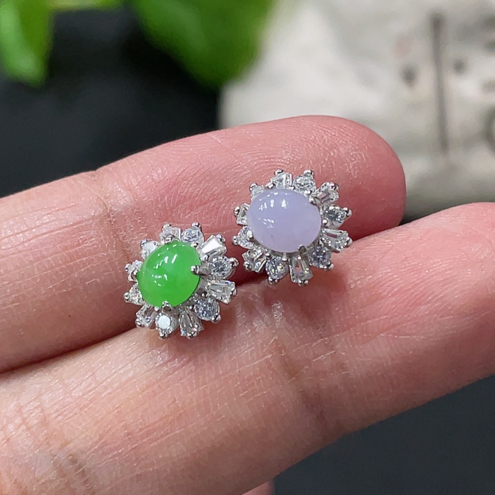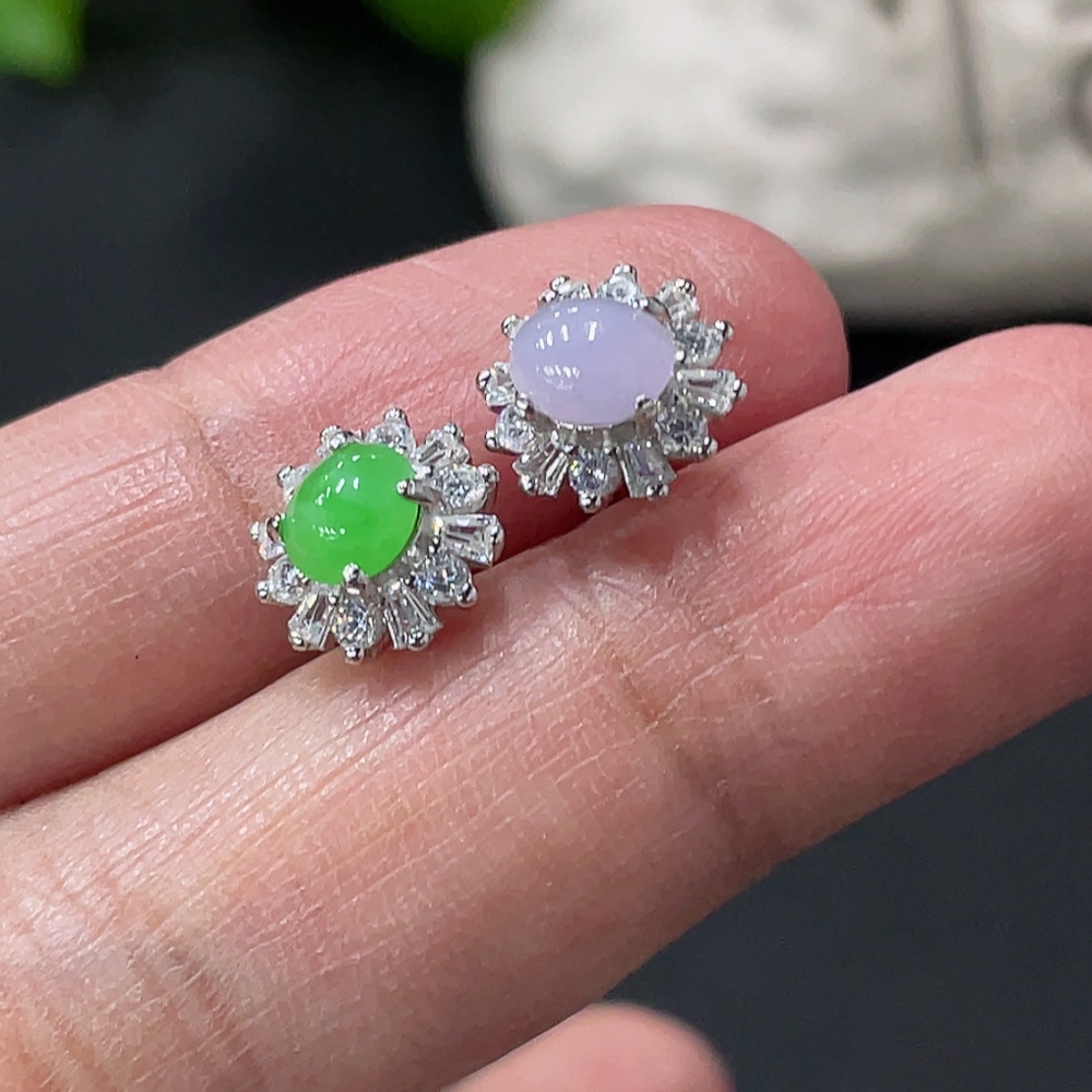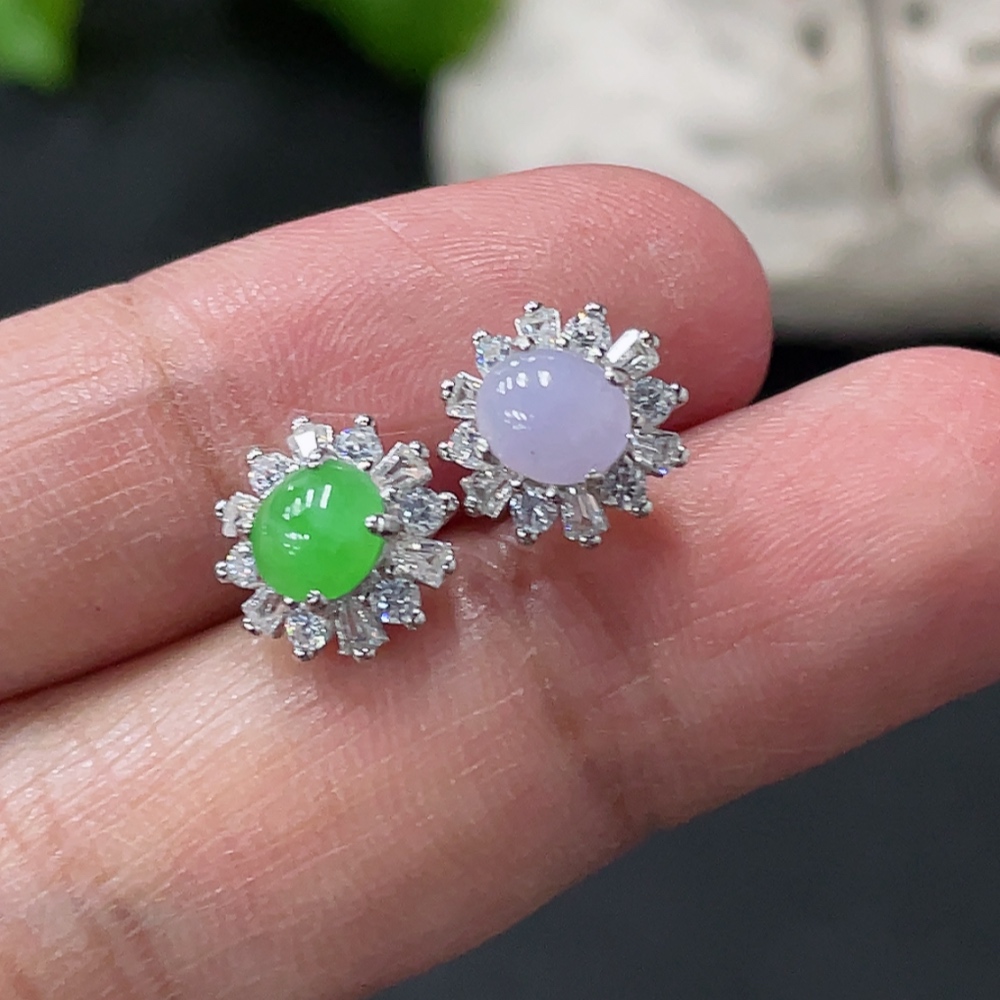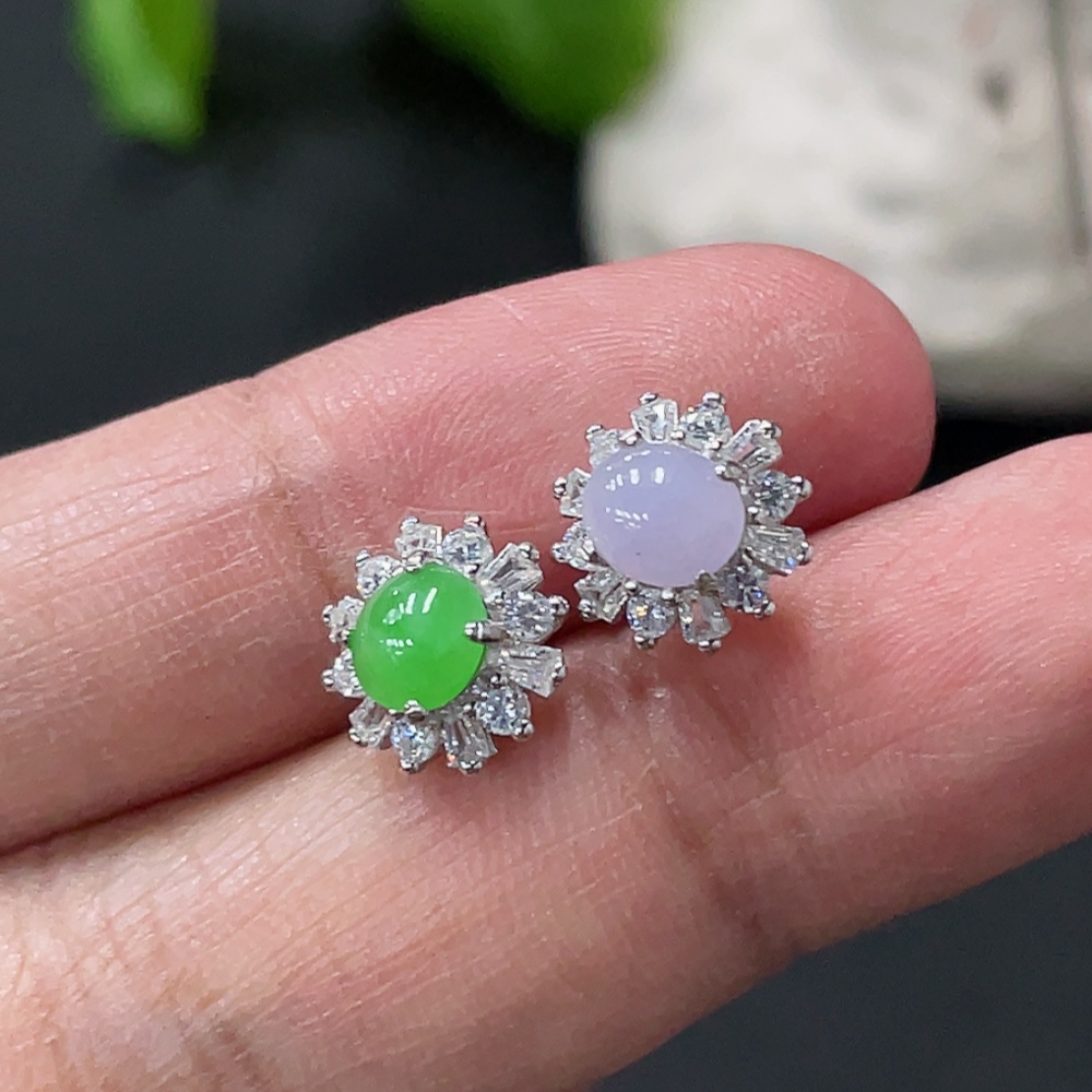 Jadeite cabochon stud earrings pair, non-gold setting