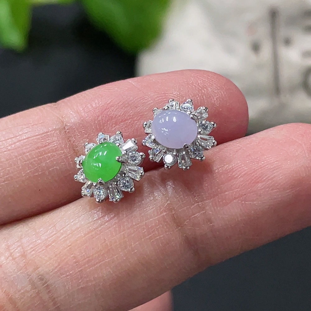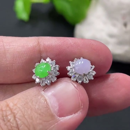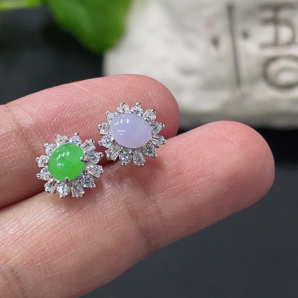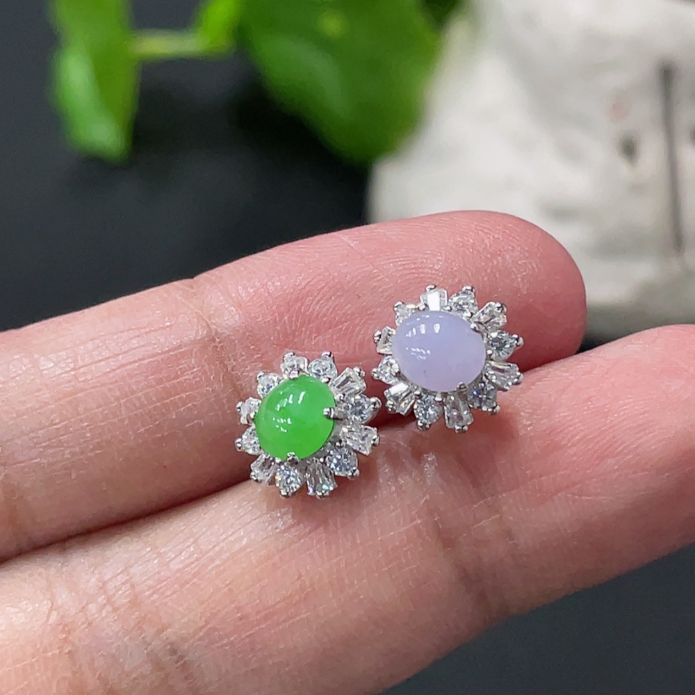 Jadeite cabochon stud earrings pair, non-gold setting