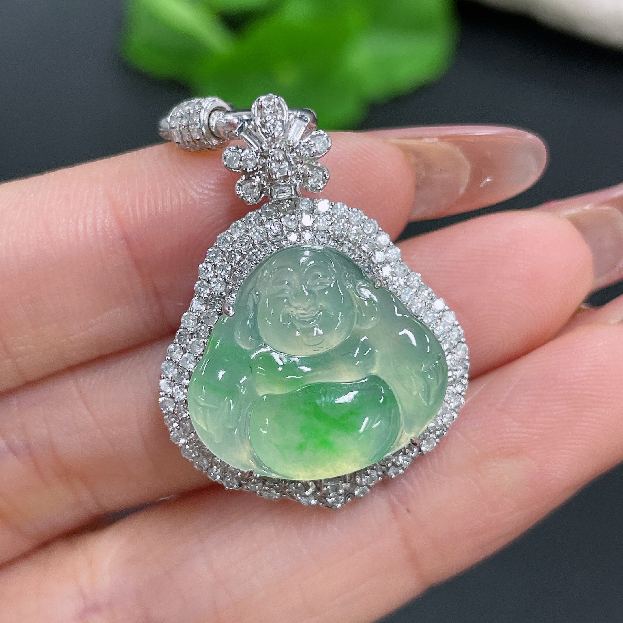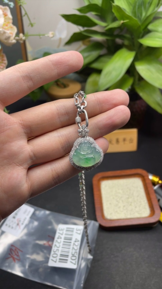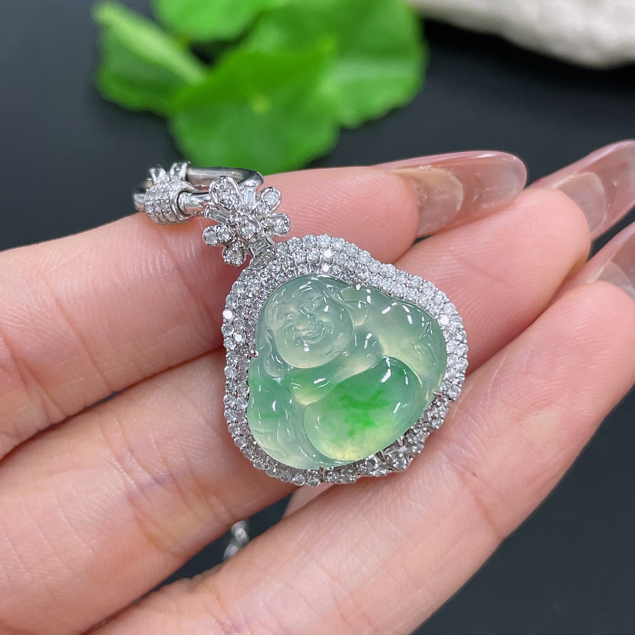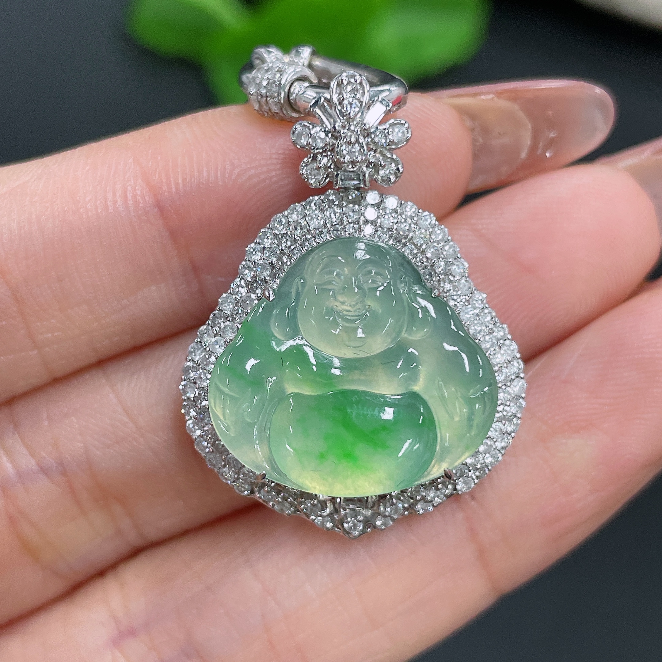 Jadeite Pendant Buddha 18k Gold Inlaid with Diamonds Including Chain Total Weight Approx. 17.5g