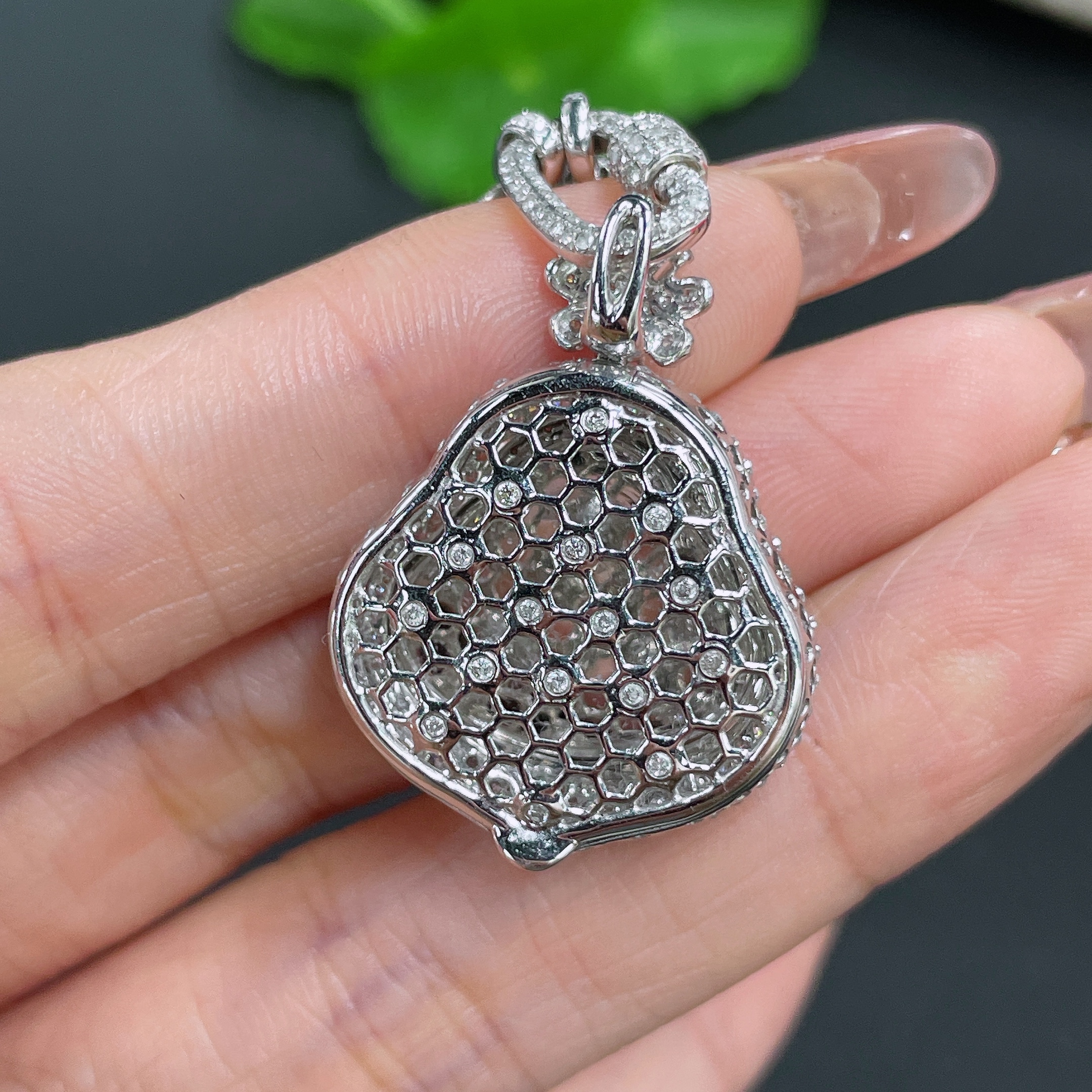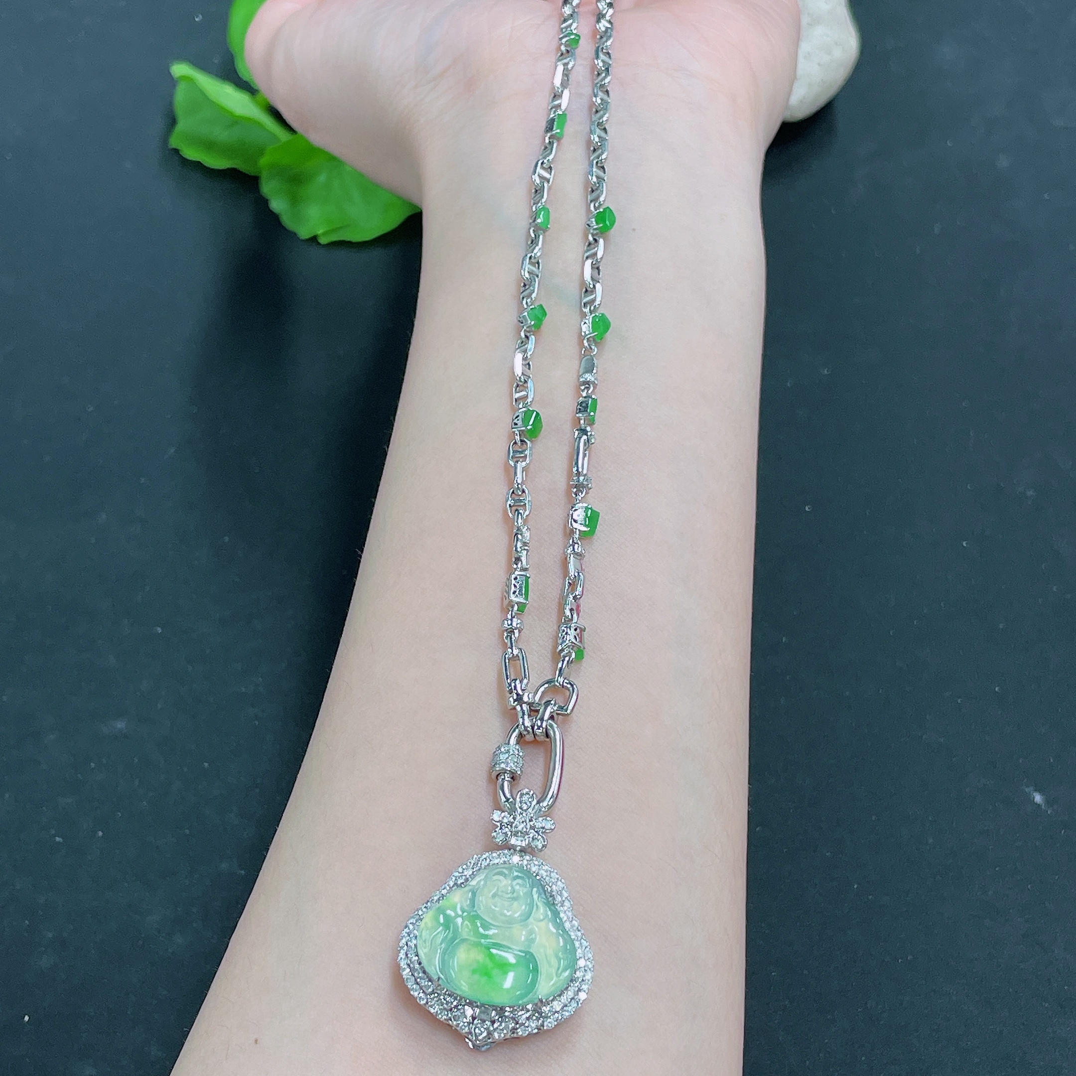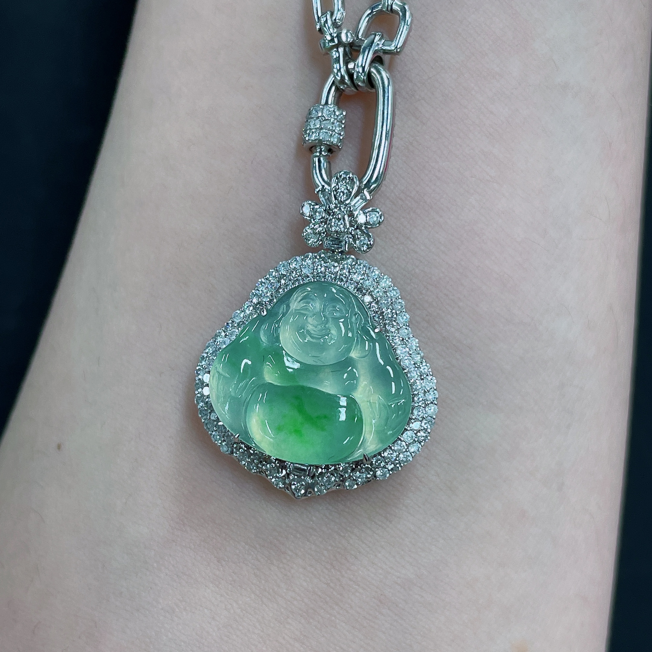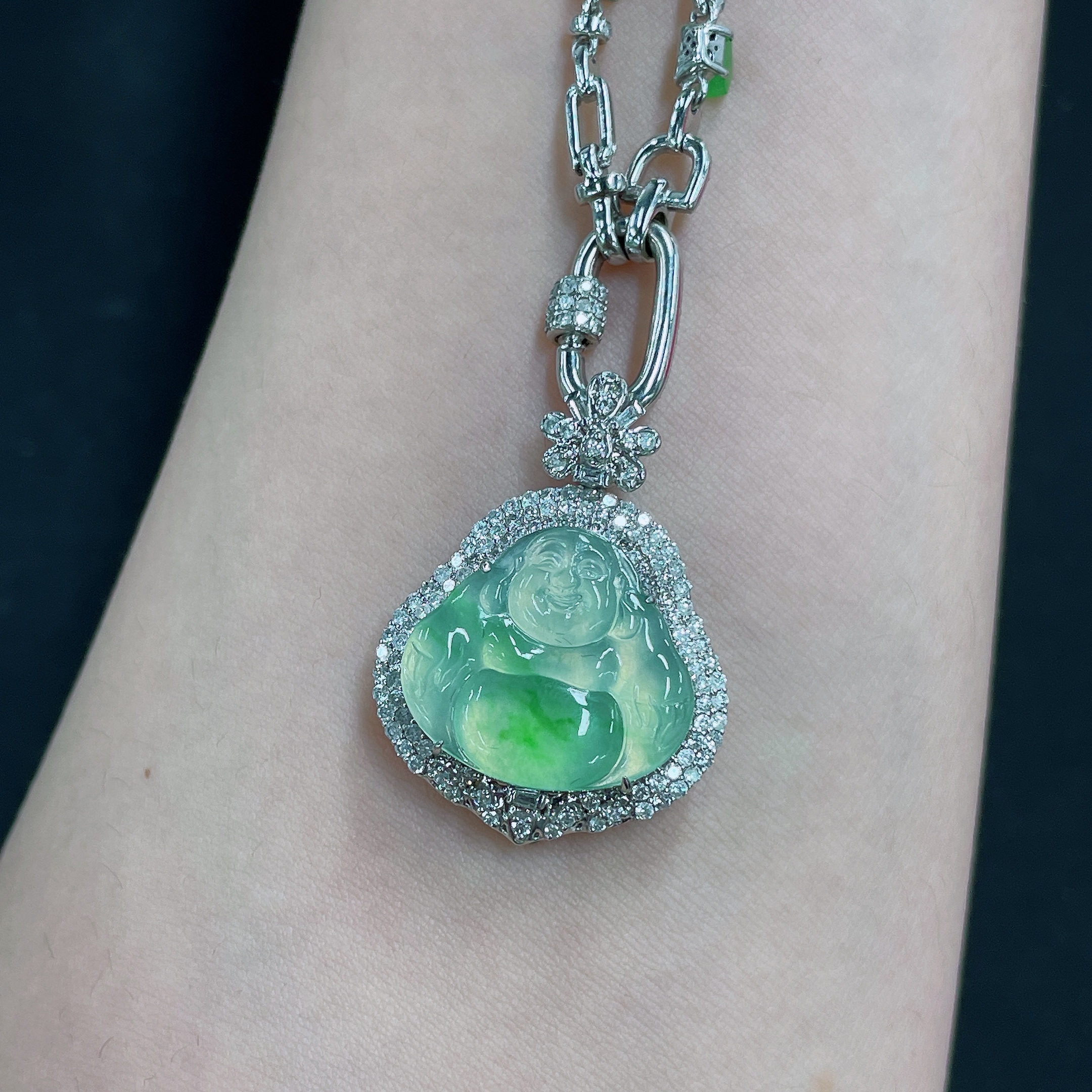 Jadeite Pendant Buddha 18k Gold Inlaid with Diamonds Including Chain Total Weight Approx. 17.5g