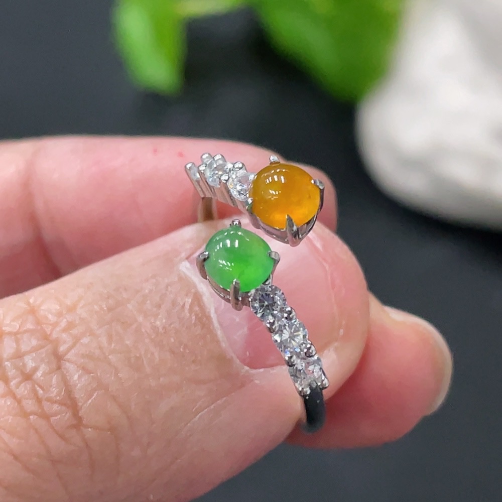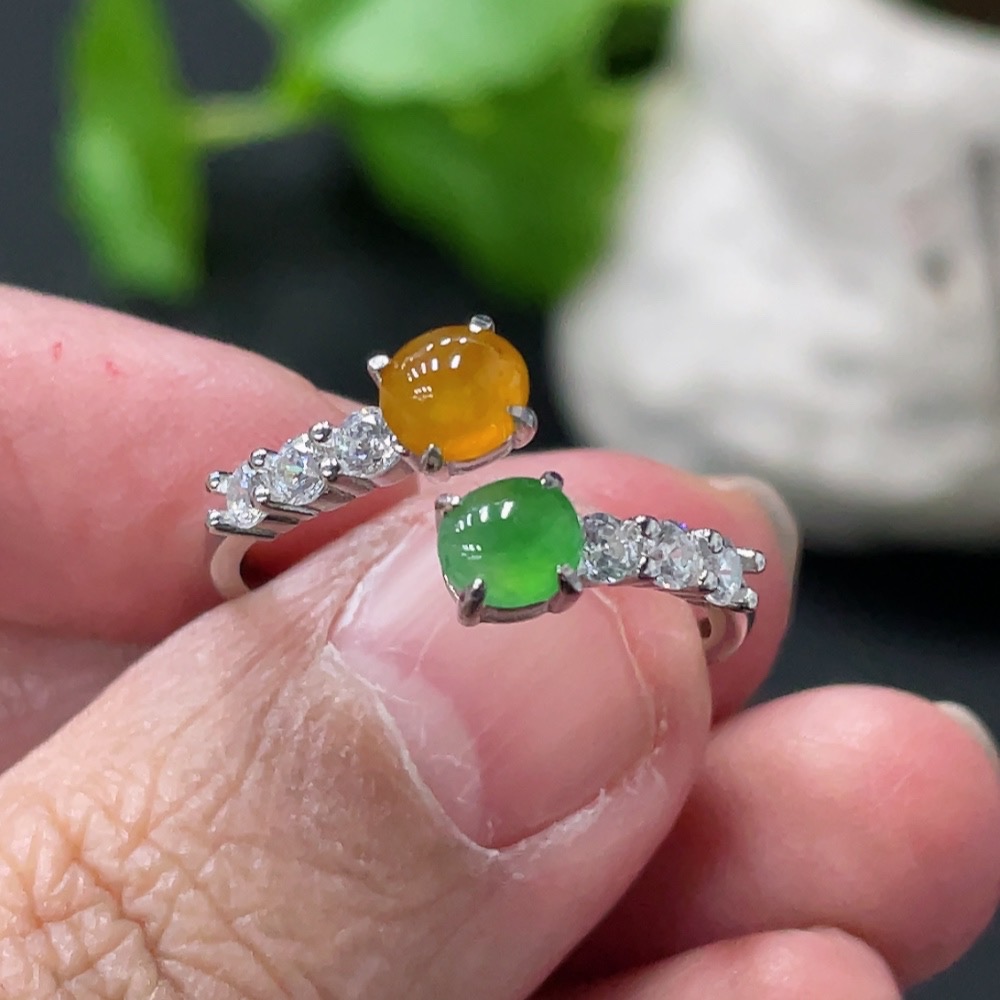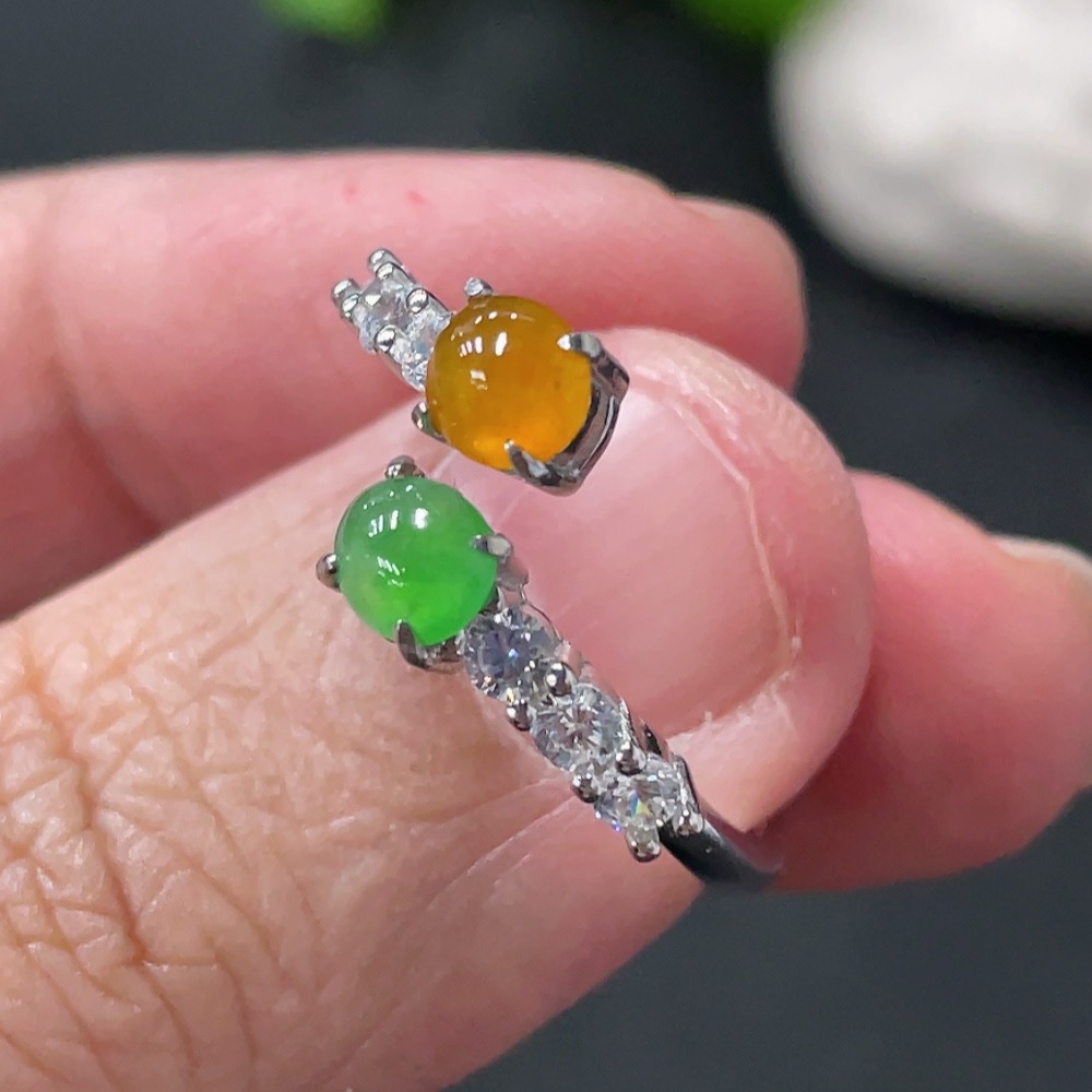 Jadeite Cabochon Inlaid Ring, Non-Gold Setting, Adjustable, Total Weight Approx. 2.1g, Yellow Cabochon Color Origin Undetermined
