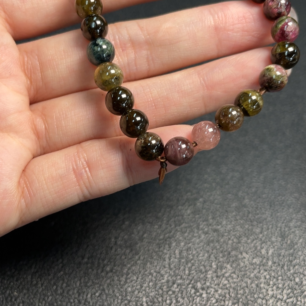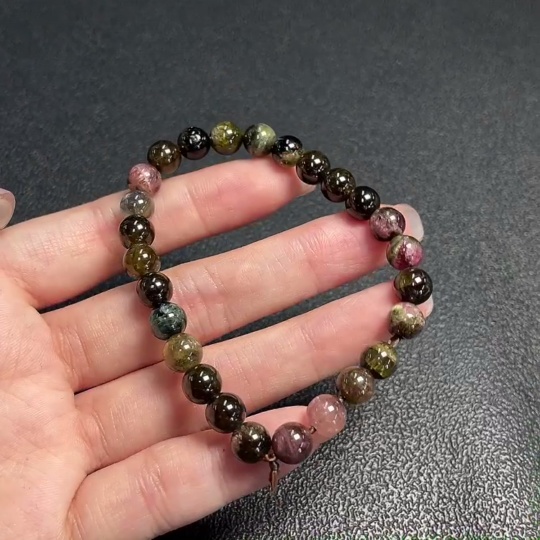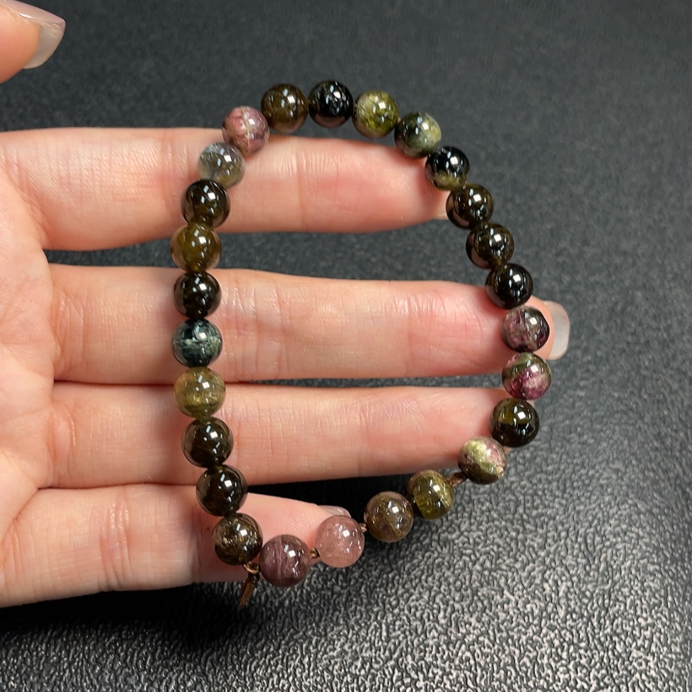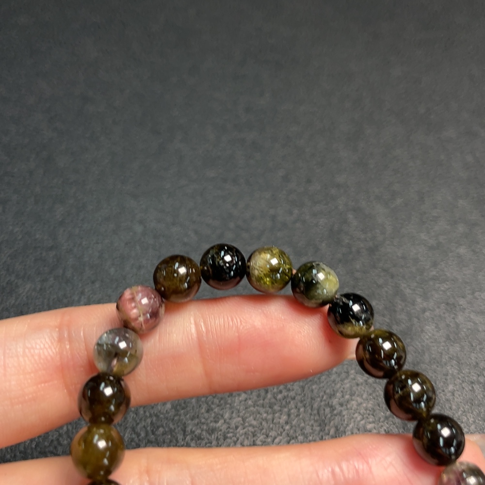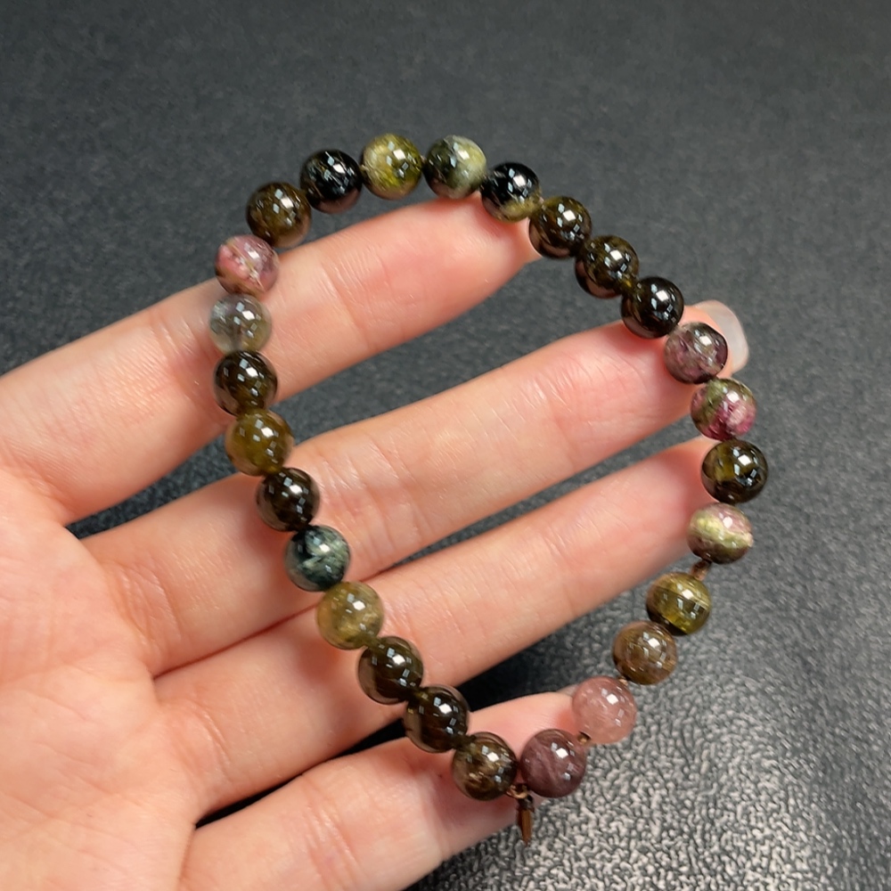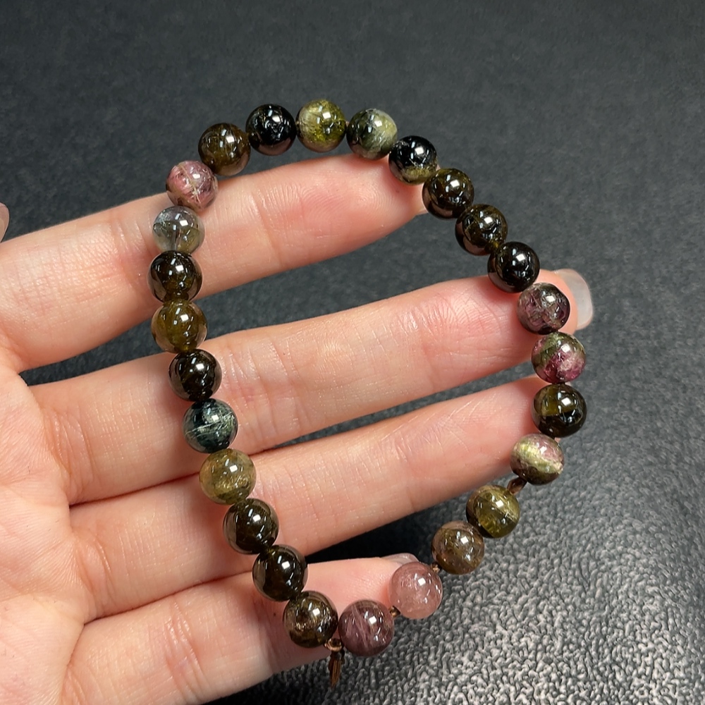 Tourmaline Bracelet with Visible Organic Matter and Other Mineral Components, Total Weight Approximately 15.45g, Bead Size About 7.1mm