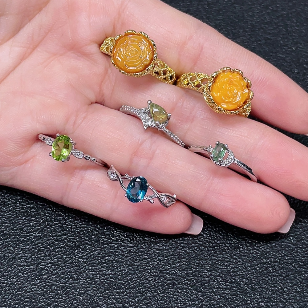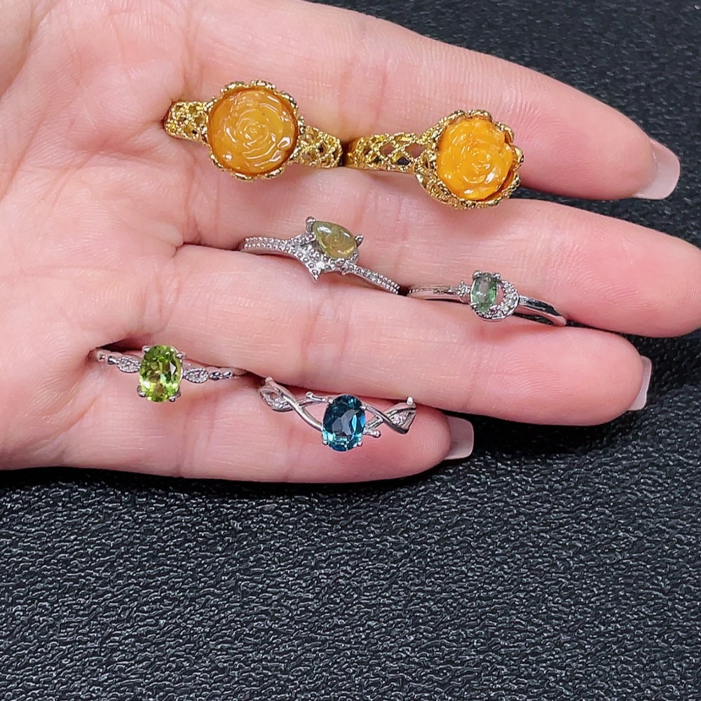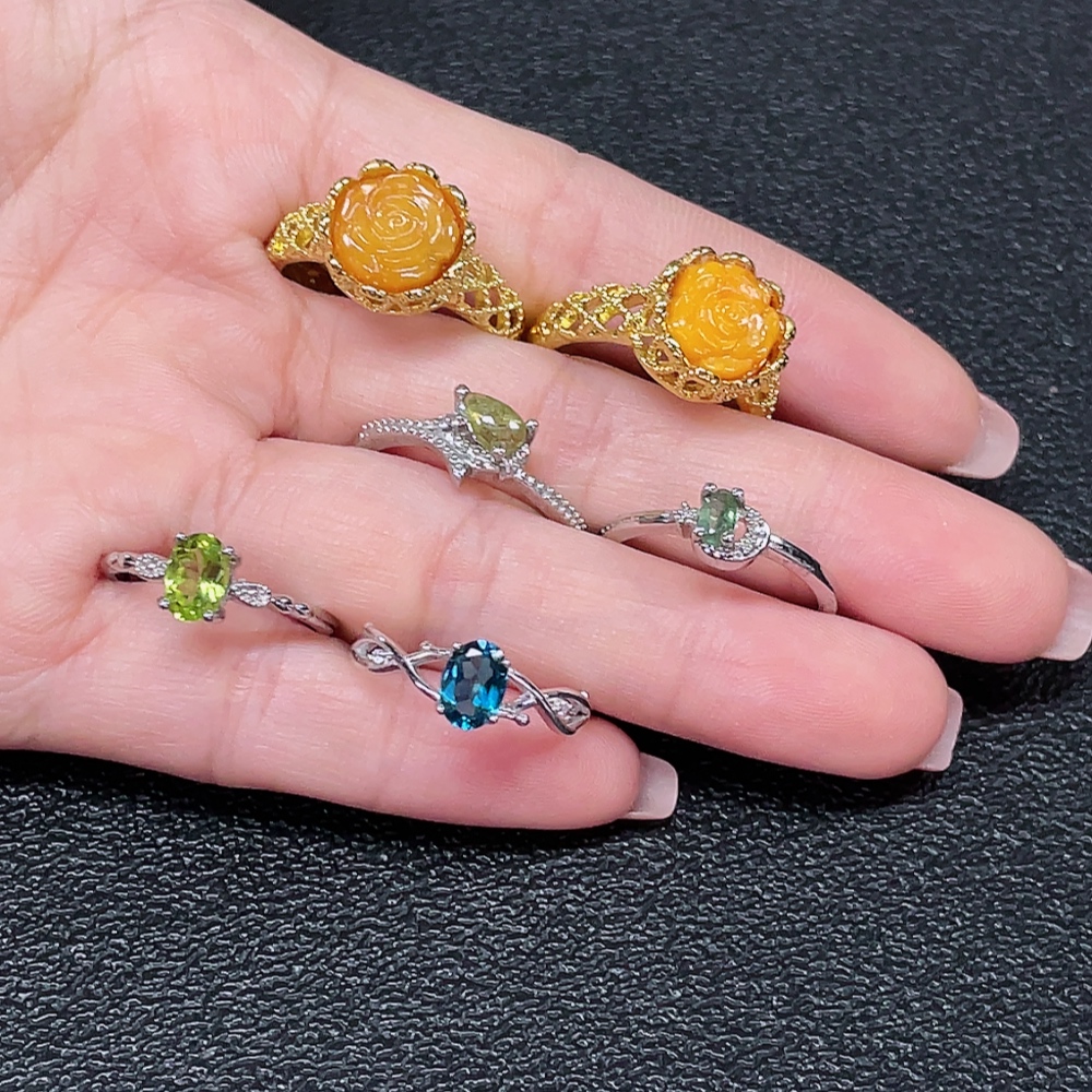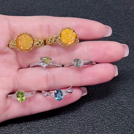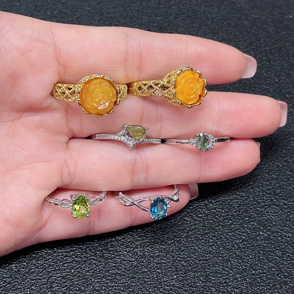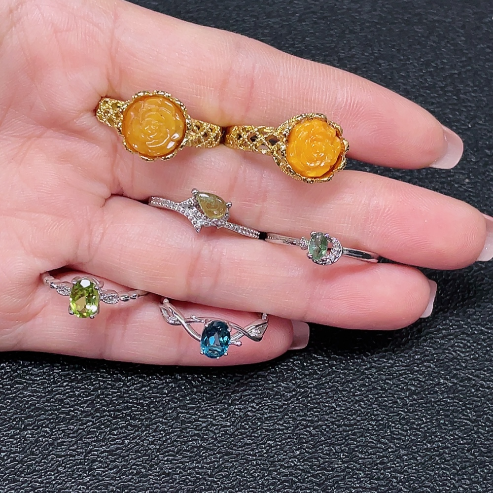 Amber Beeswax with Colorless Coating + Topaz (Color Origin Undetermined) + Peridot + Tourmaline Ring with Visible Organic Matter, Non-Gold, Adjustable, Total Weight Approx. 14.25g, Sell as a Lot