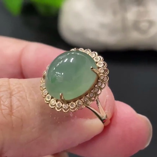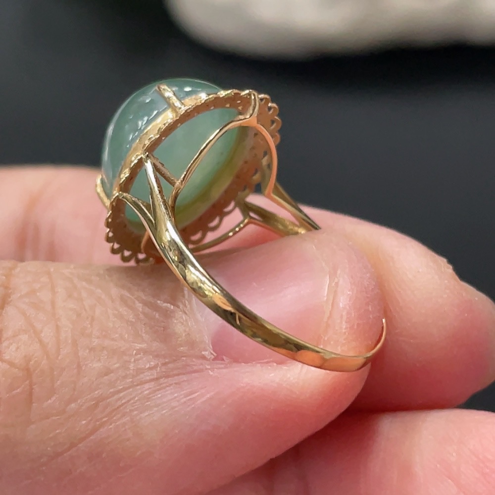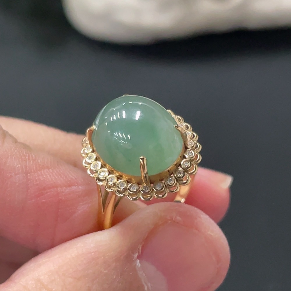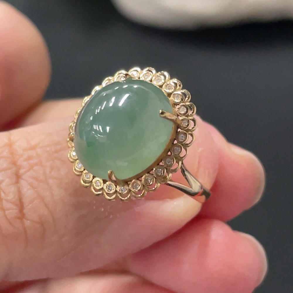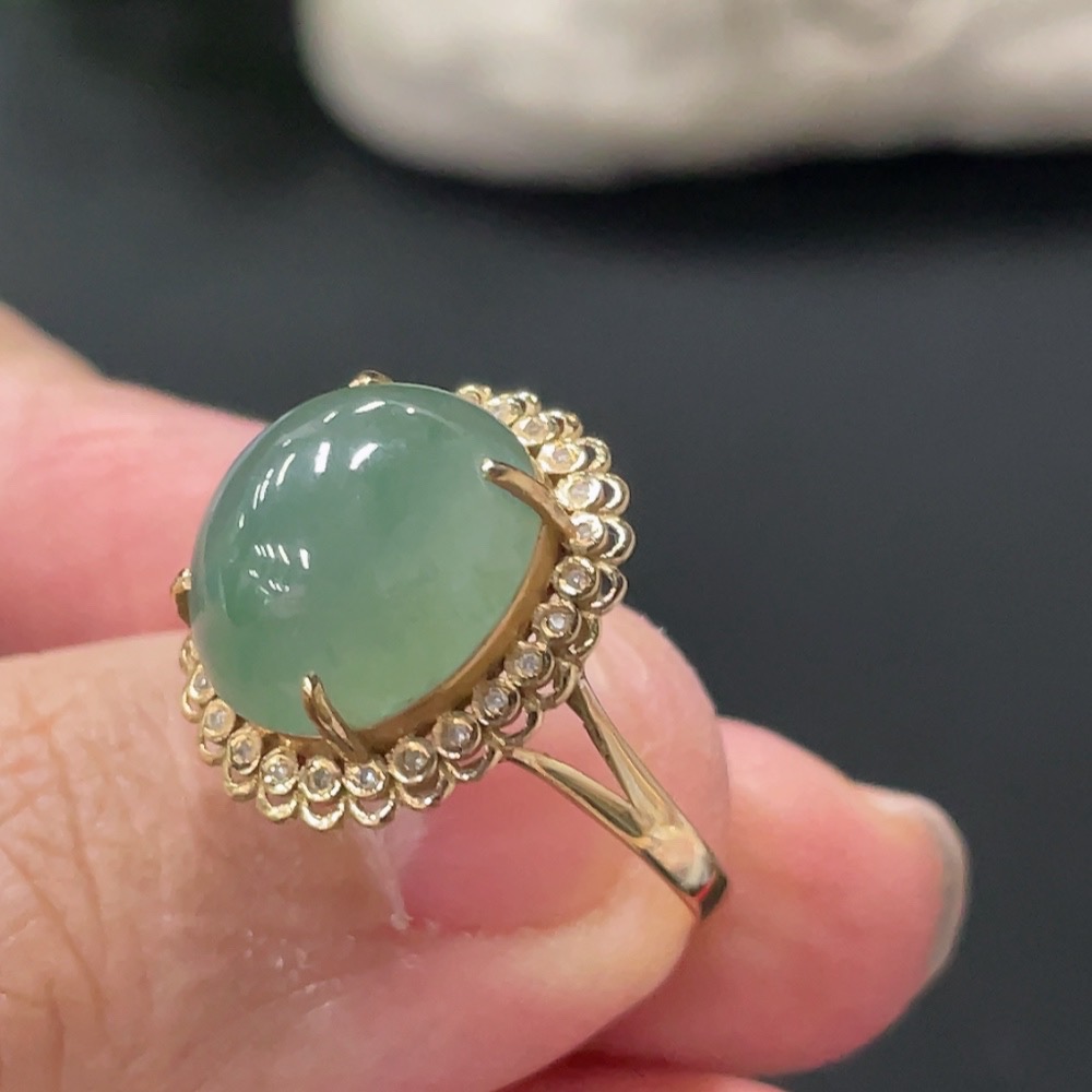 Jadeite Cabochon Ring 18k Gold Setting Size 14 Total Weight Approx. 2.8g with Diamond Accents