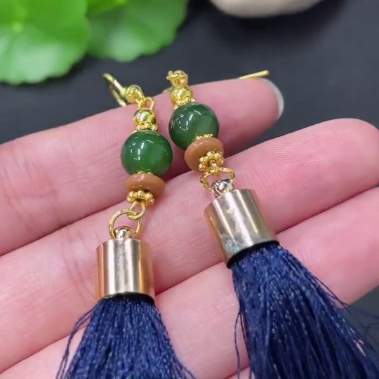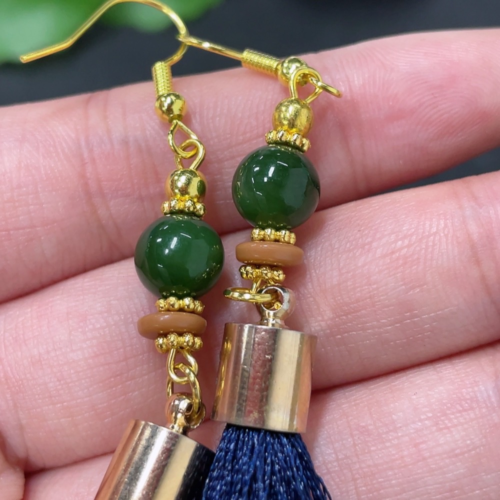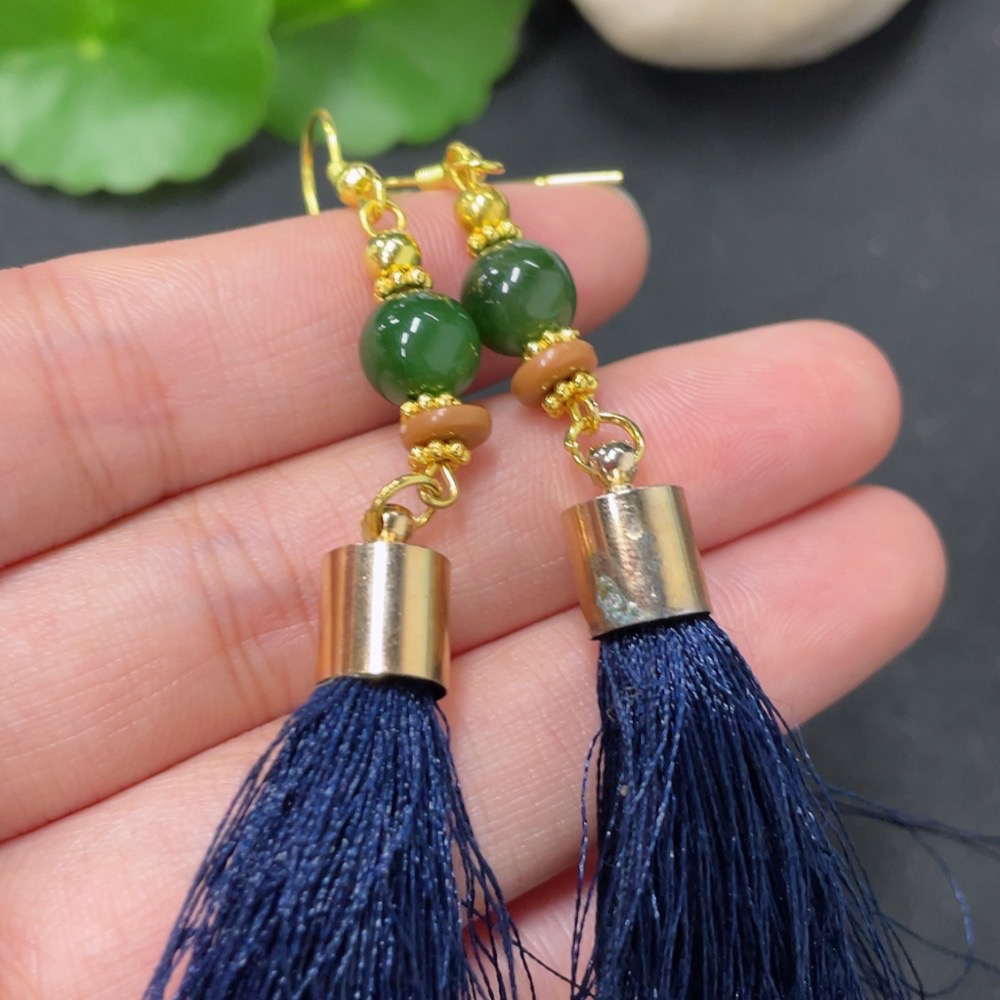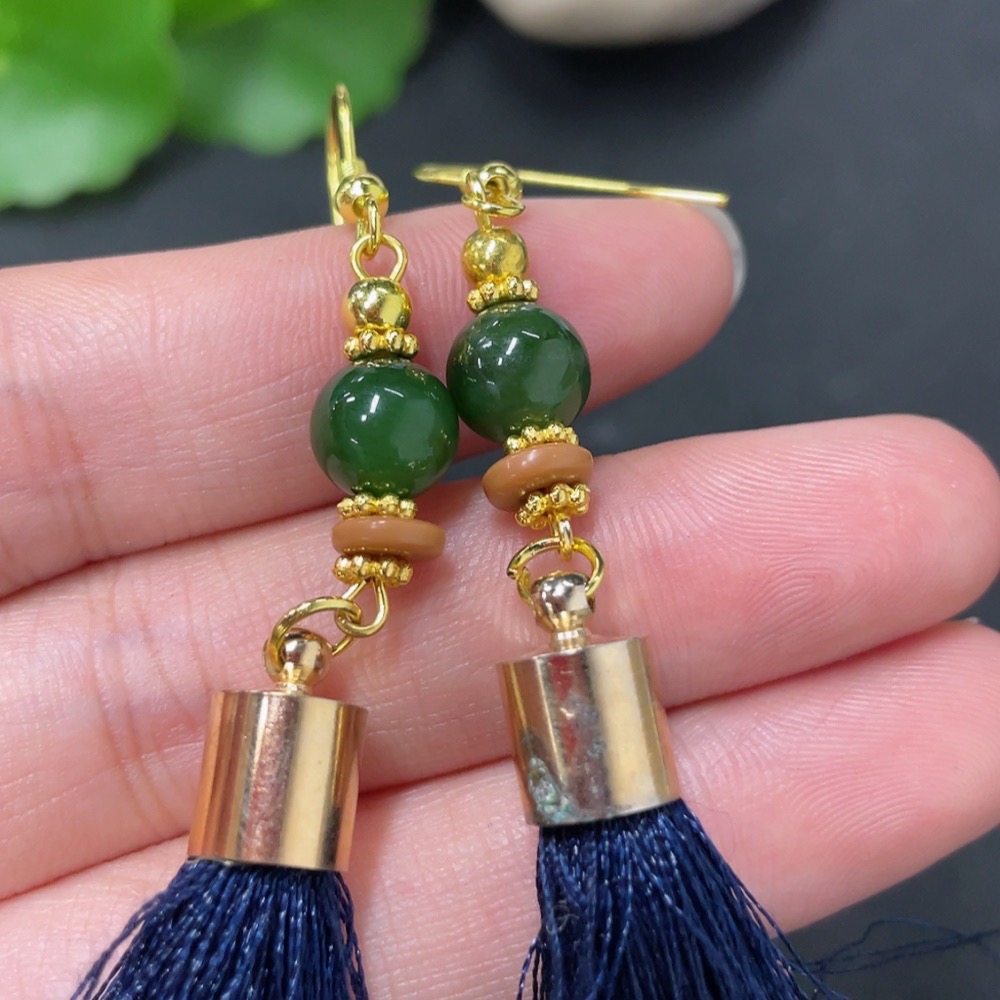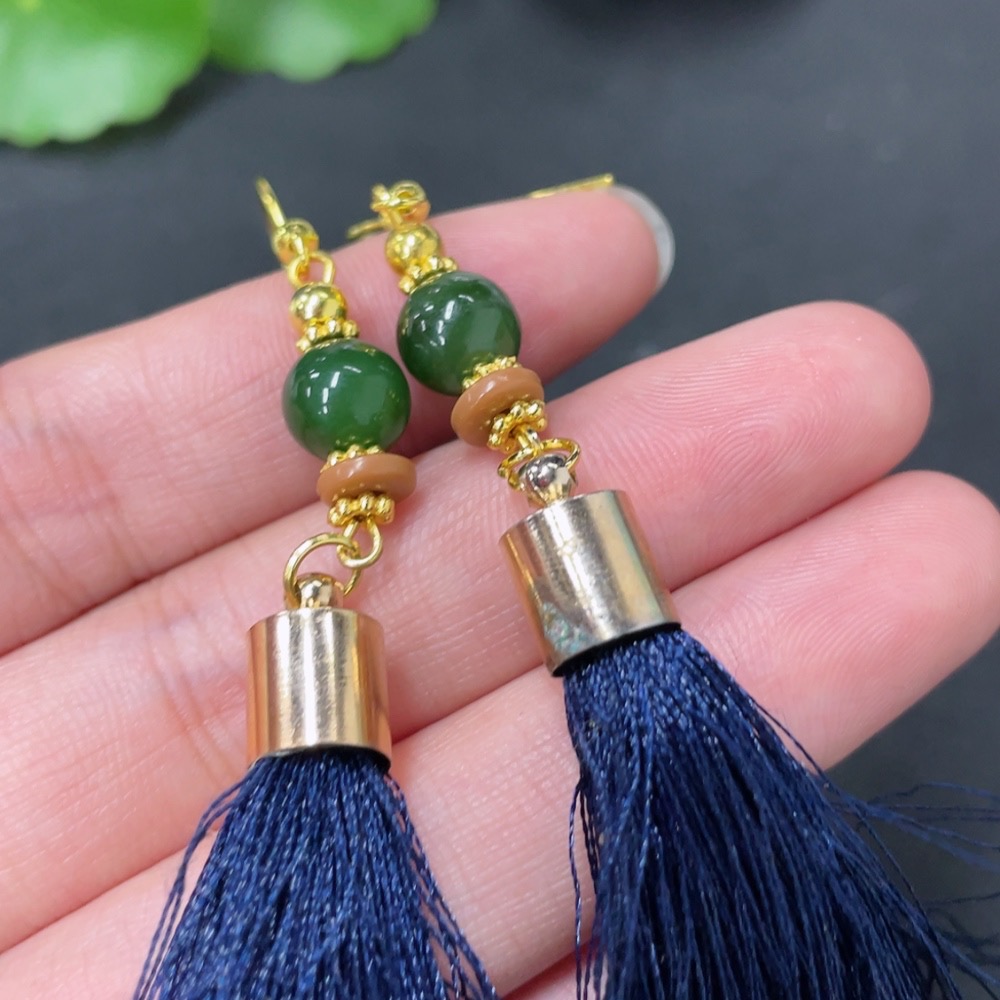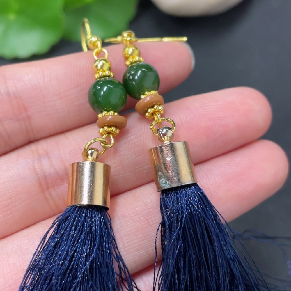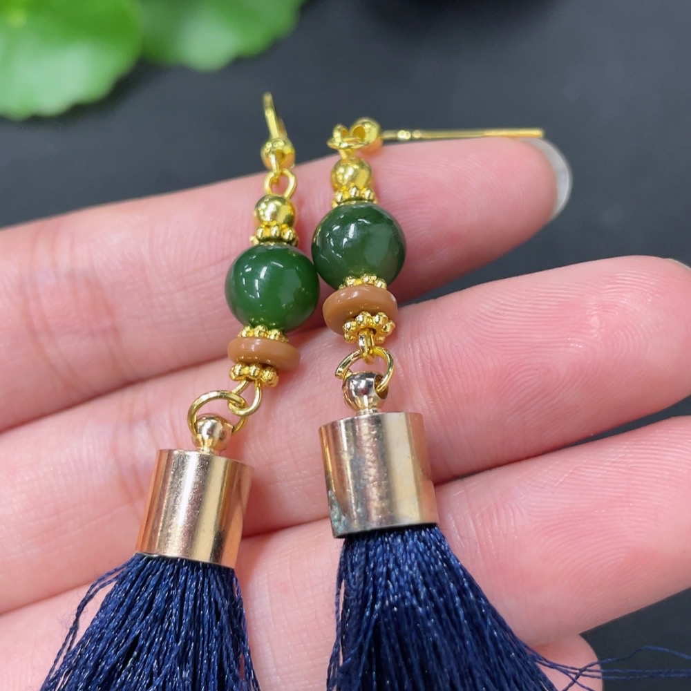 Hetian Jade Inlaid Earrings Non-Gold Size 7.5mm Approx. Total Weight (Including Rope) 6.9g