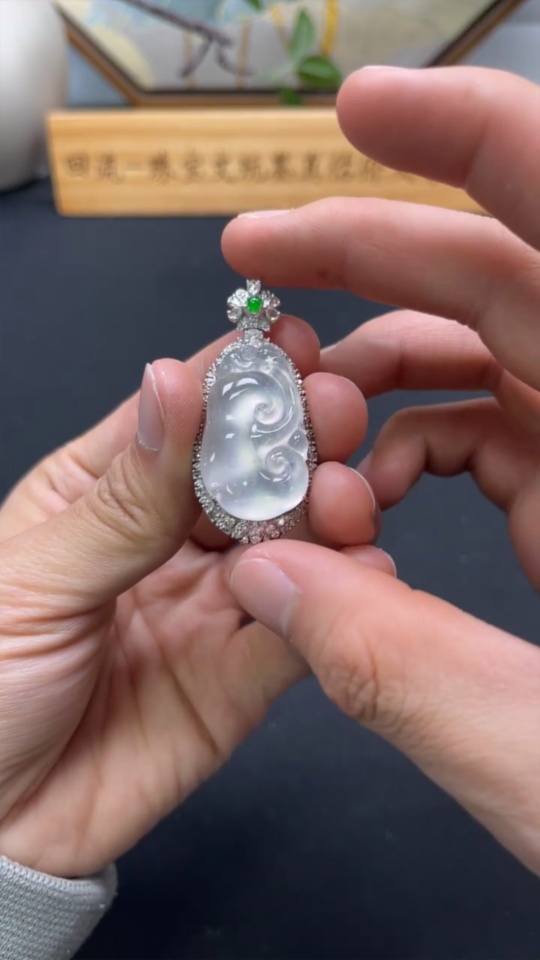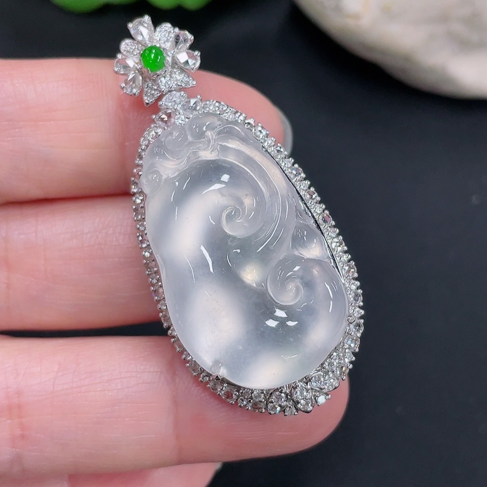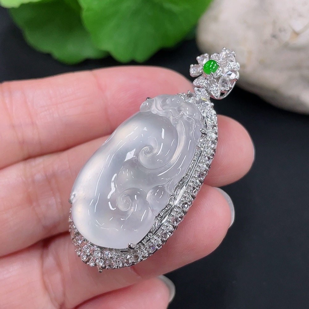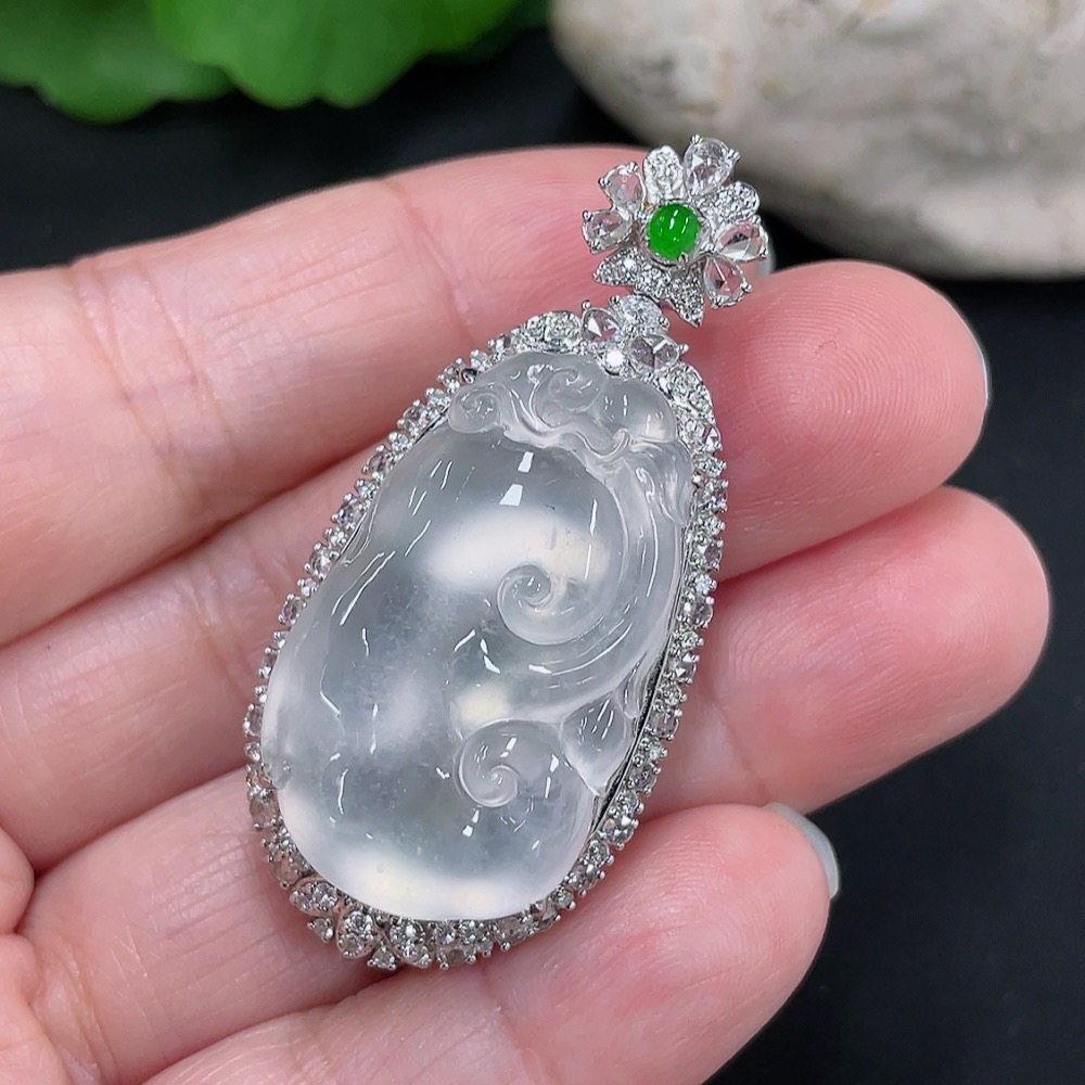 Jadeite Ruyi Inlaid Pendant 18K Gold Total Weight Approx. 13g (With Diamond Accents)